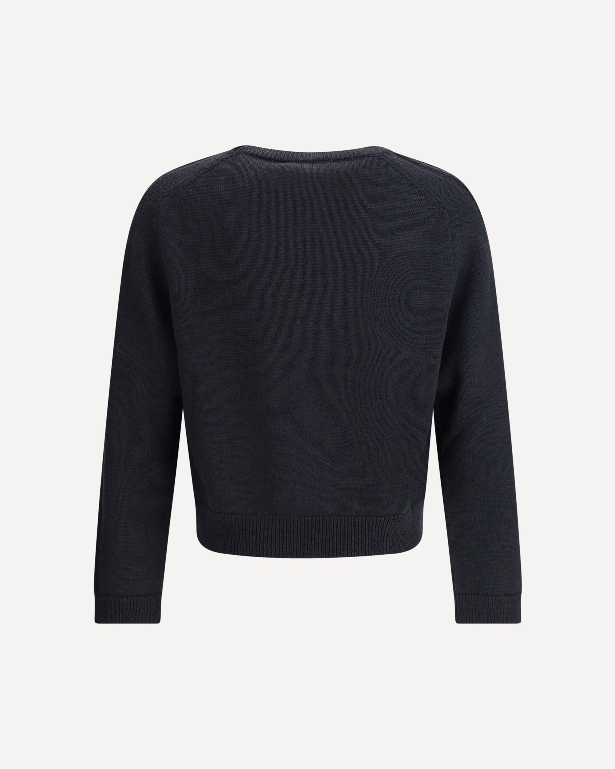 The True Roundneck in Off Black Rustic Merino is crafted from fine Italian merino wool yarn with a plain knit construction. It features saddle sleeves with drop stitch details, ribbed collar, cuffs, and hem, and a regular, straight fit. The natural qualities of the yarn, combined with the knit construction, allow the garment to shape to the wearer over time, developing a unique, personalized character