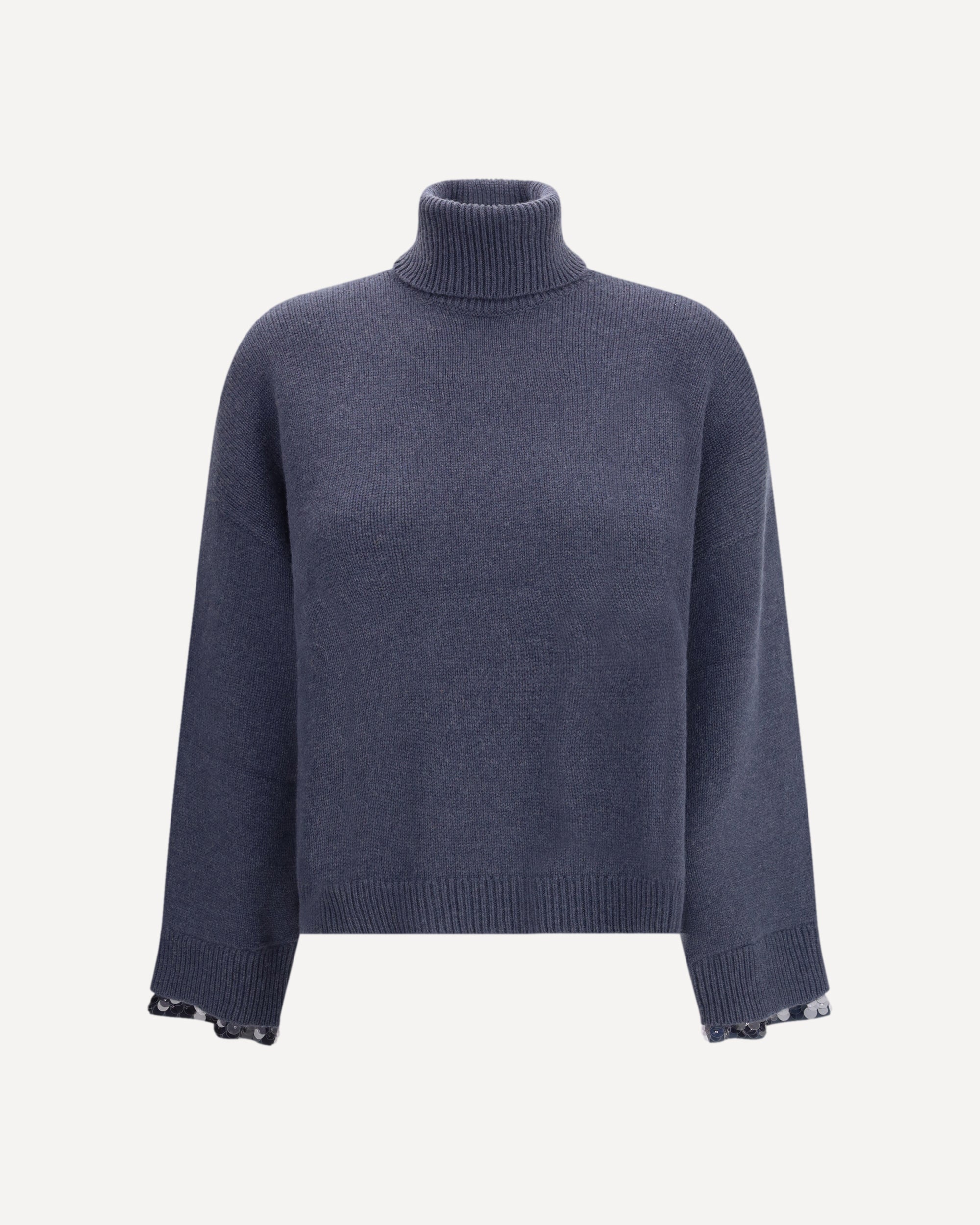 The cashmere and silk Sweater by Brunello Cucinelli embodies subtle elegance enhanced by refined detailing. The turtleneck gently embraces the silhouette, while the sequin embellishment on the sleeve adds a touch of soft luminosity. The blend of fine yarns creates a smooth and lightweight texture, perfect for expressing a modern and graceful femininity.