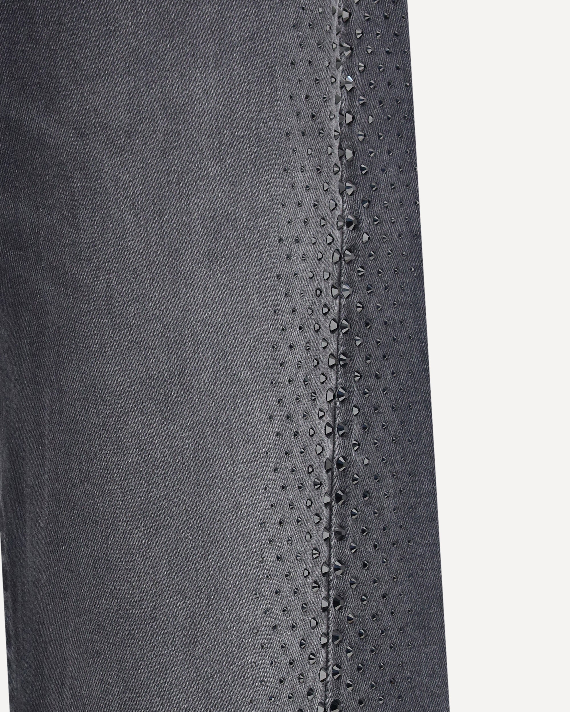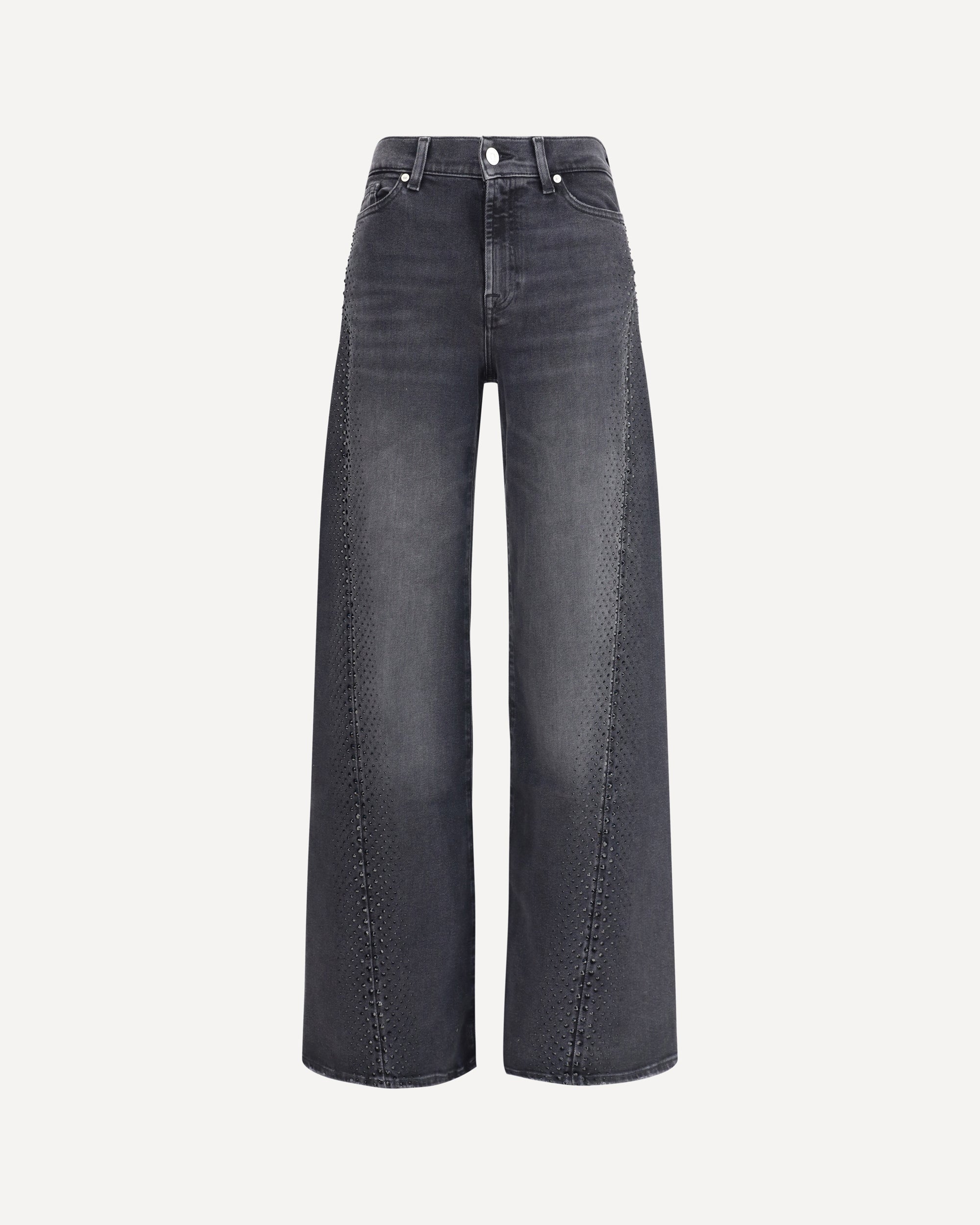 The Rhinestone Jeans by 7For feature a straight five-pocket design with a front button and zipper closure and belt loops at the waist. The distinctive detail is the applied rhinestones along the side seams, which add a touch of sparkle and bold style to the garment.