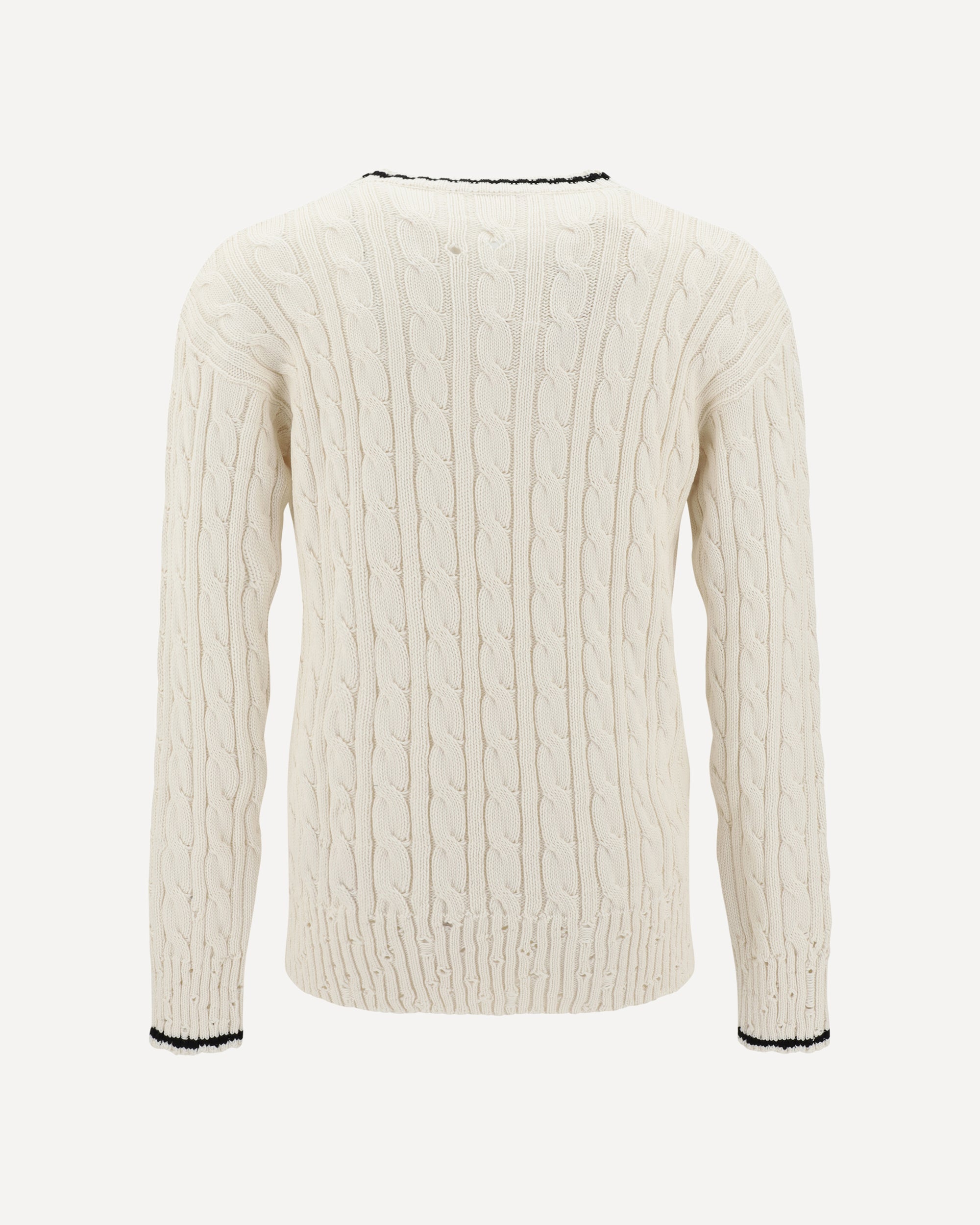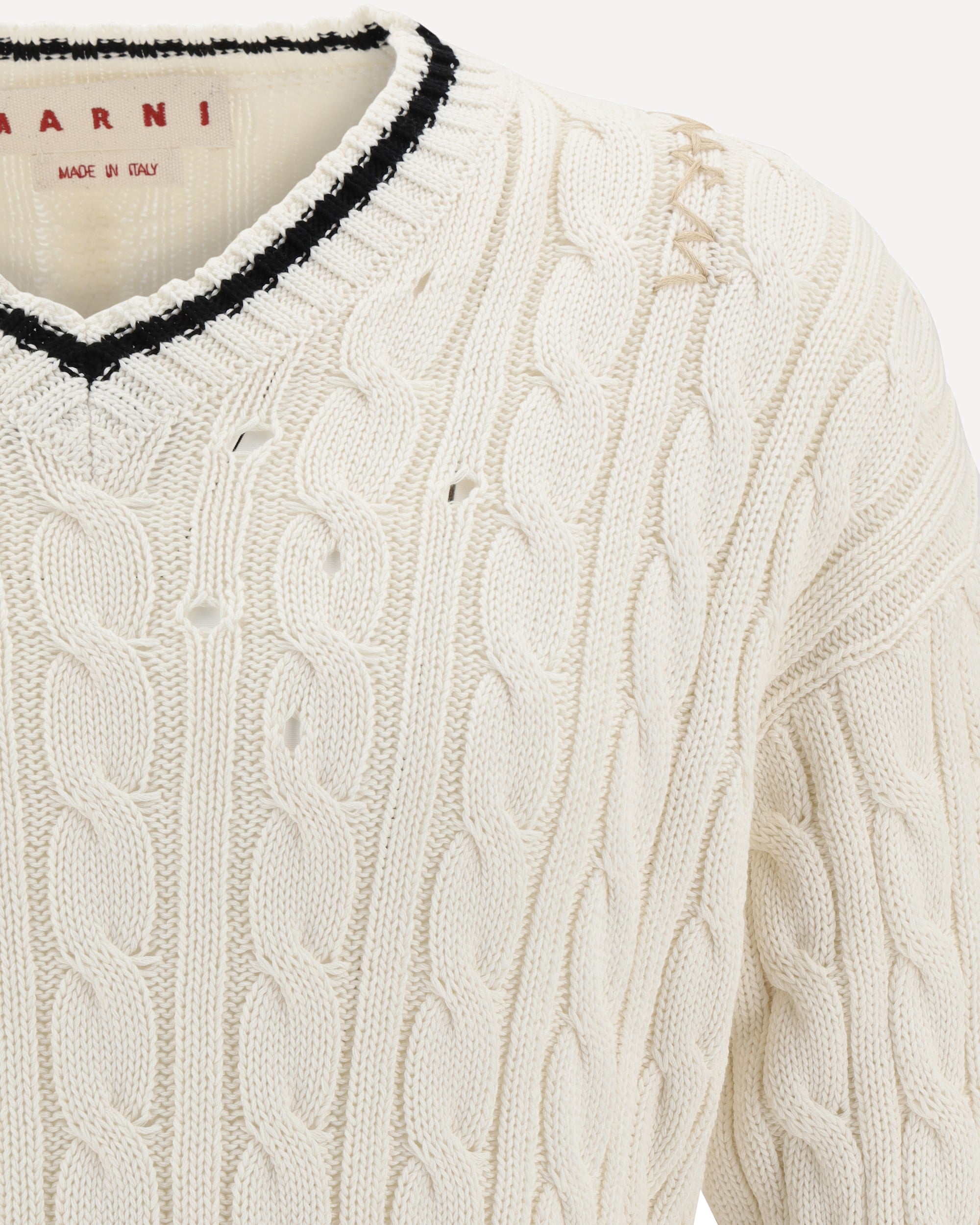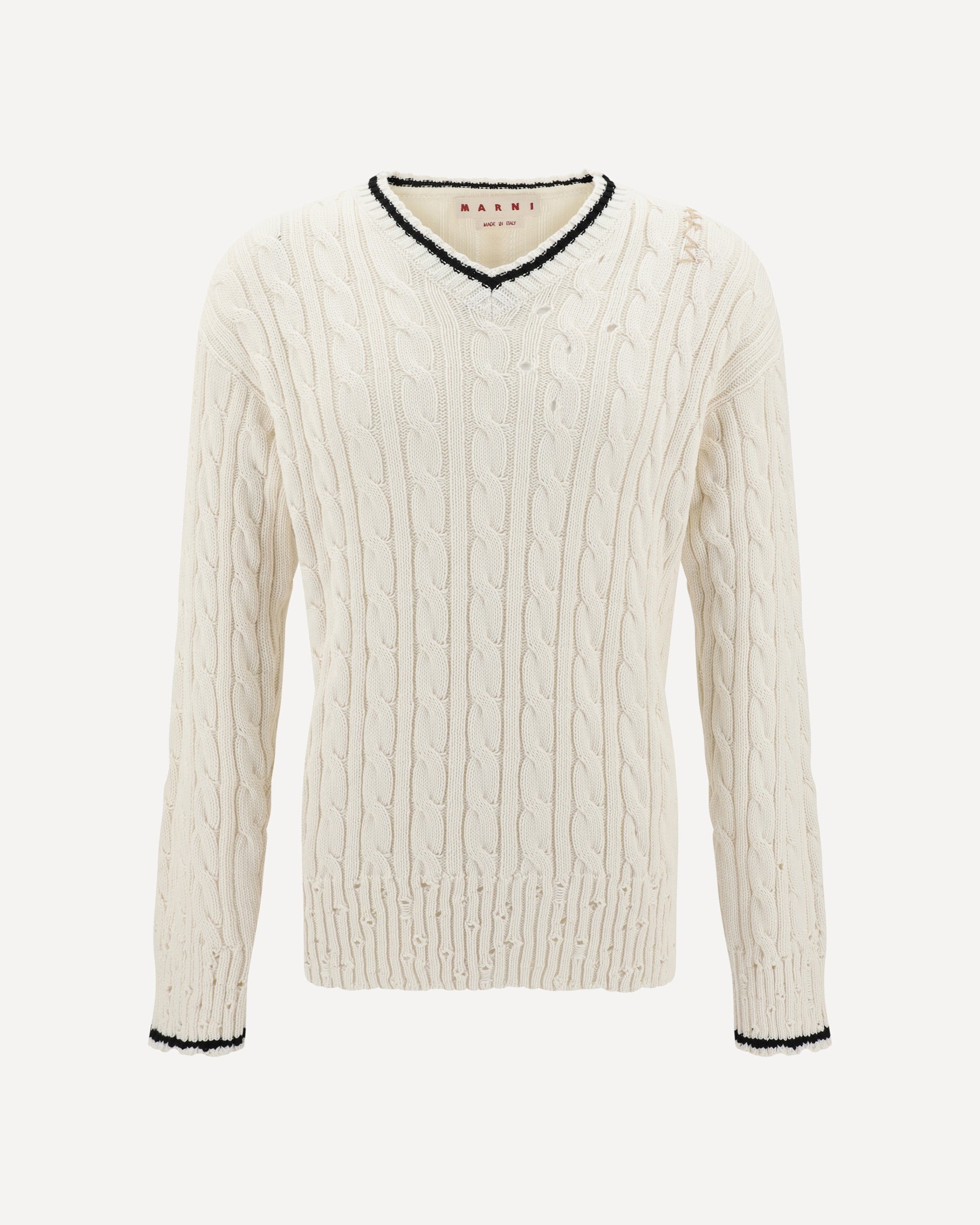 Marni's cotton Sweater is a stylish and versatile piece perfect for those seeking a refined yet casual look. Featuring a V-shaped front drape, which adds a touch of originality, the sweater has ribbed cuffs and a high ribbed hem, which help define a clean, modern silhouette. The cable-knit weave gives the garment an interesting texture, adding depth and sophisticated visual detail.