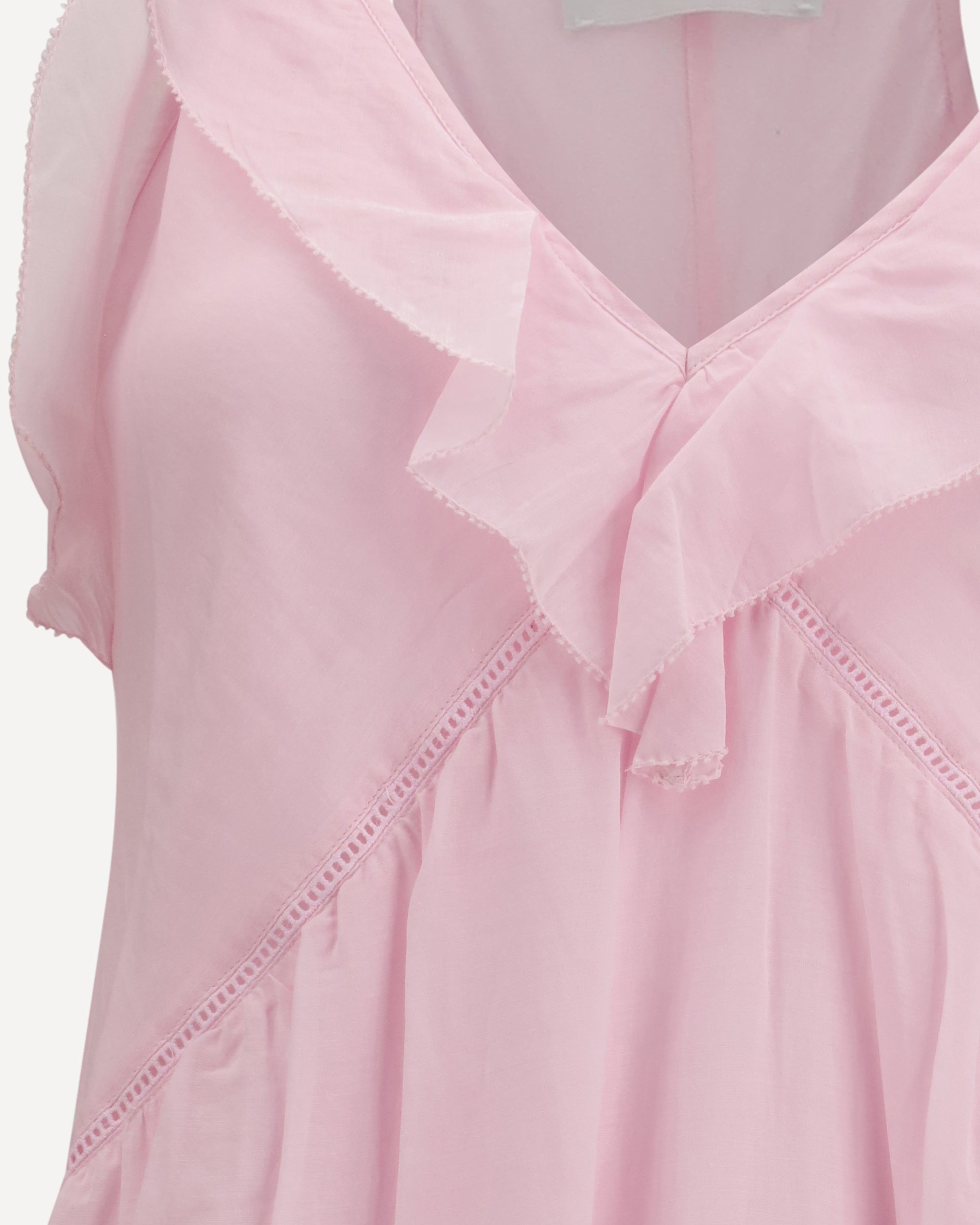 The Vasma strappy Dress by Marant Etoile is crafted from lightweight organic cotton voile, designed to move effortlessly with the body. The long, flared silhouette is enhanced by a V-neckline at the front and a halterneck cut at the back with thin straps, subtly revealing the shoulders and back. Ruffled details with crochet edging and ladder-stitch inserts add a refined artisanal touch. Fully lined for comfort, the dress is finished with an asymmetric hem that brings fluidity and movement to the design.
