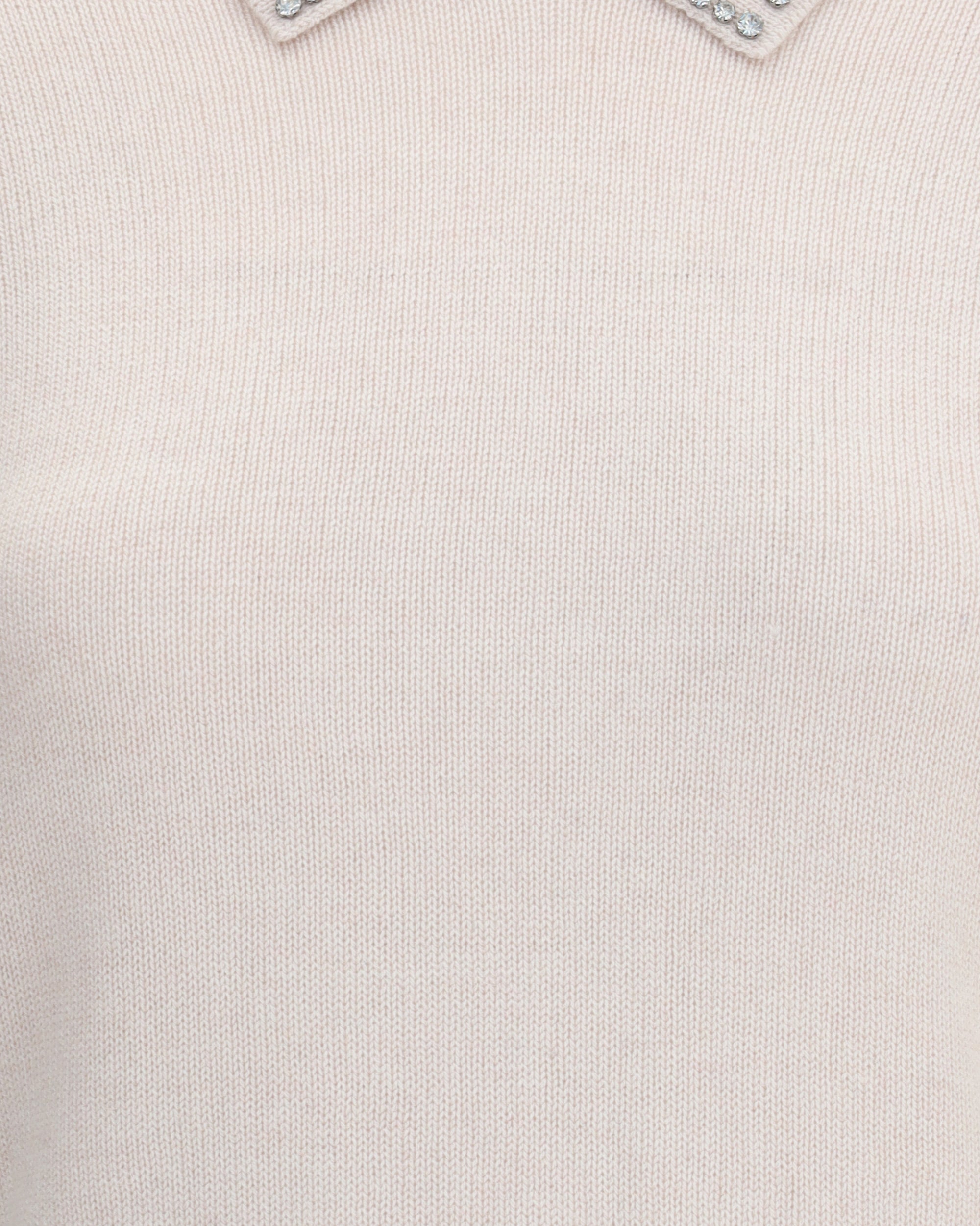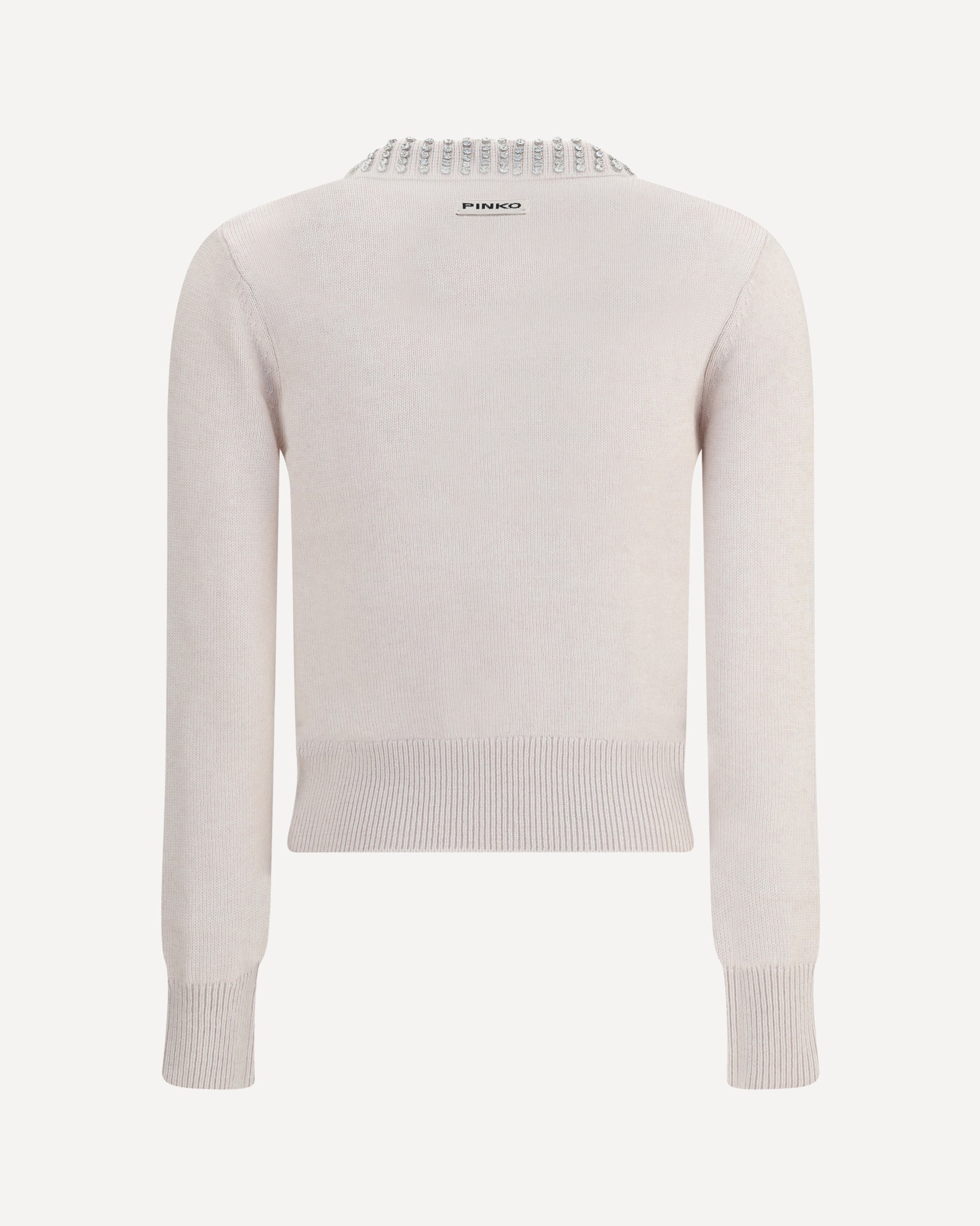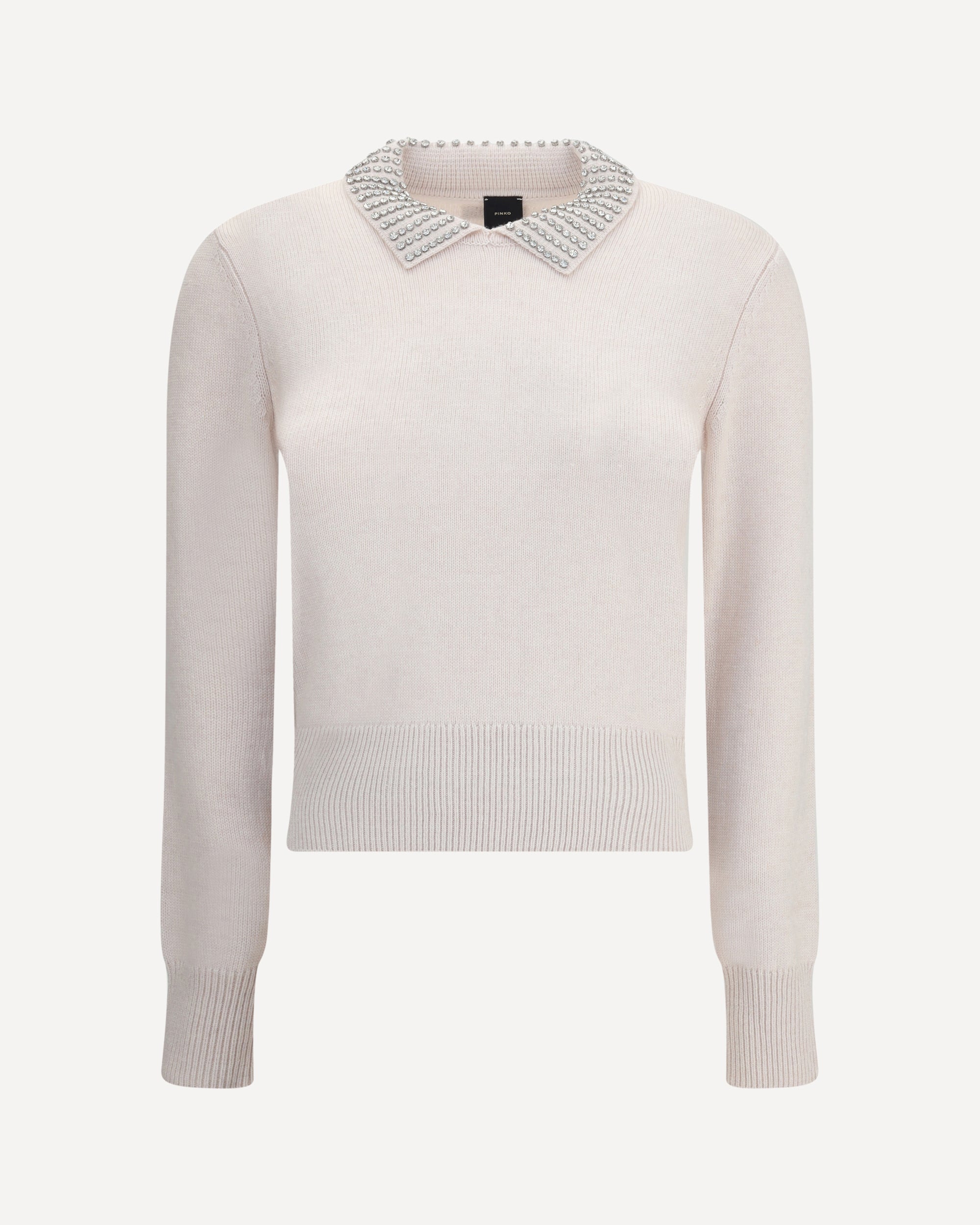 The Pinko Sweater combines simplicity and precious details. Featuring a ribbed hem and cuffs, it stands out for its rhinestone-decorated collar, which adds a touch of light and femininity to the essential design.