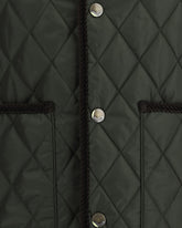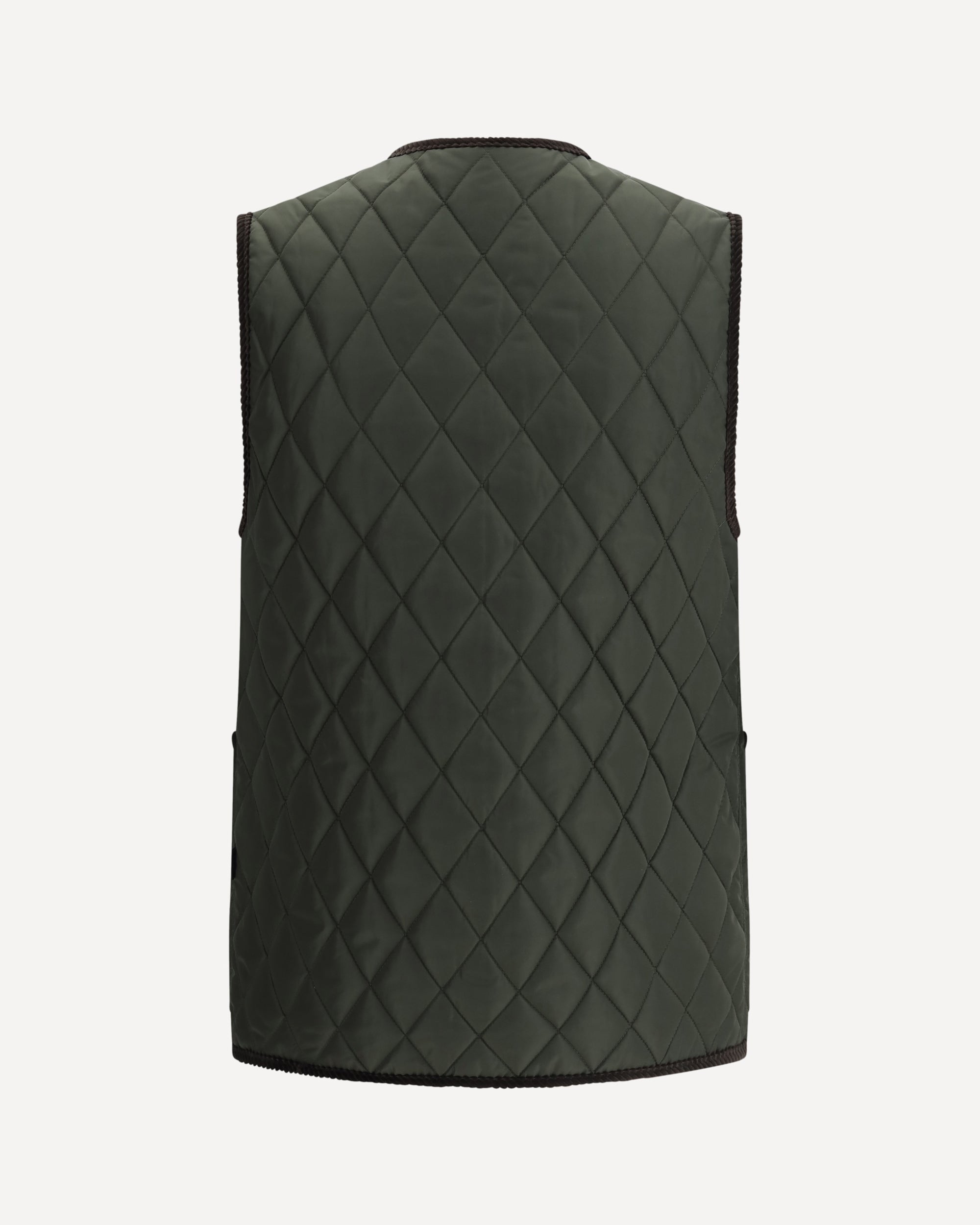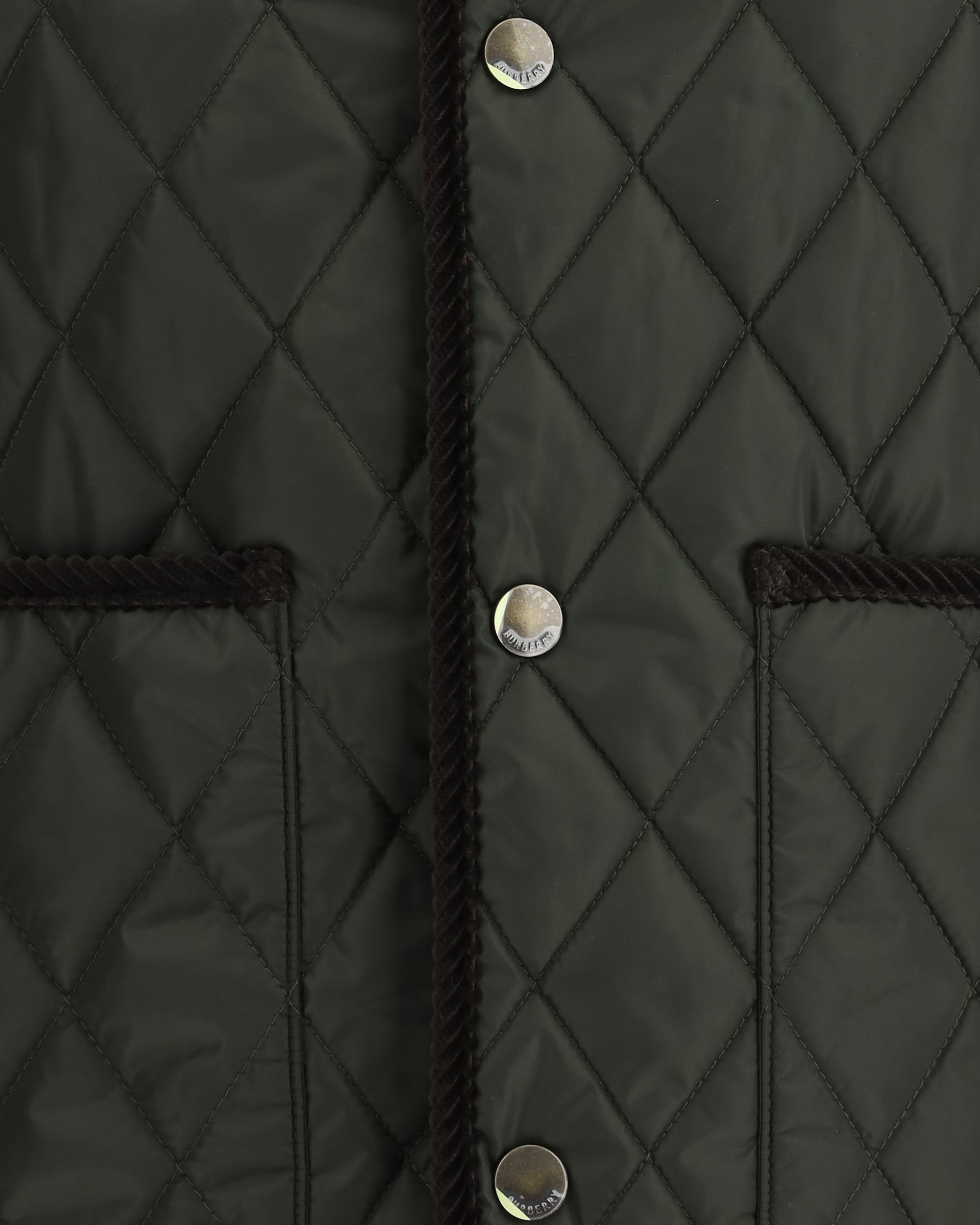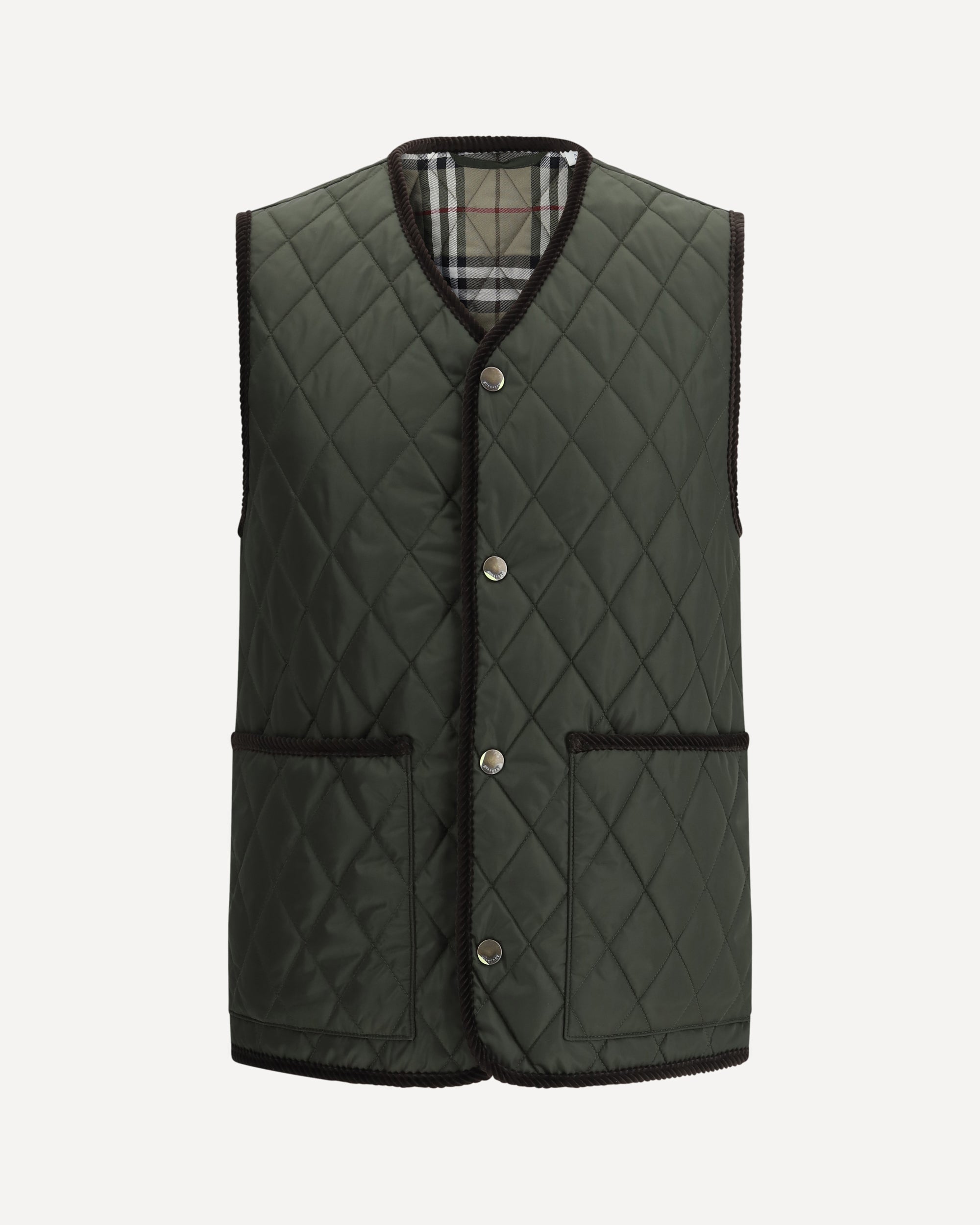 Vest by Burberry, V-neck front, snap button closure, two welt patch pockets on front, all-over quilted design, regular fit.