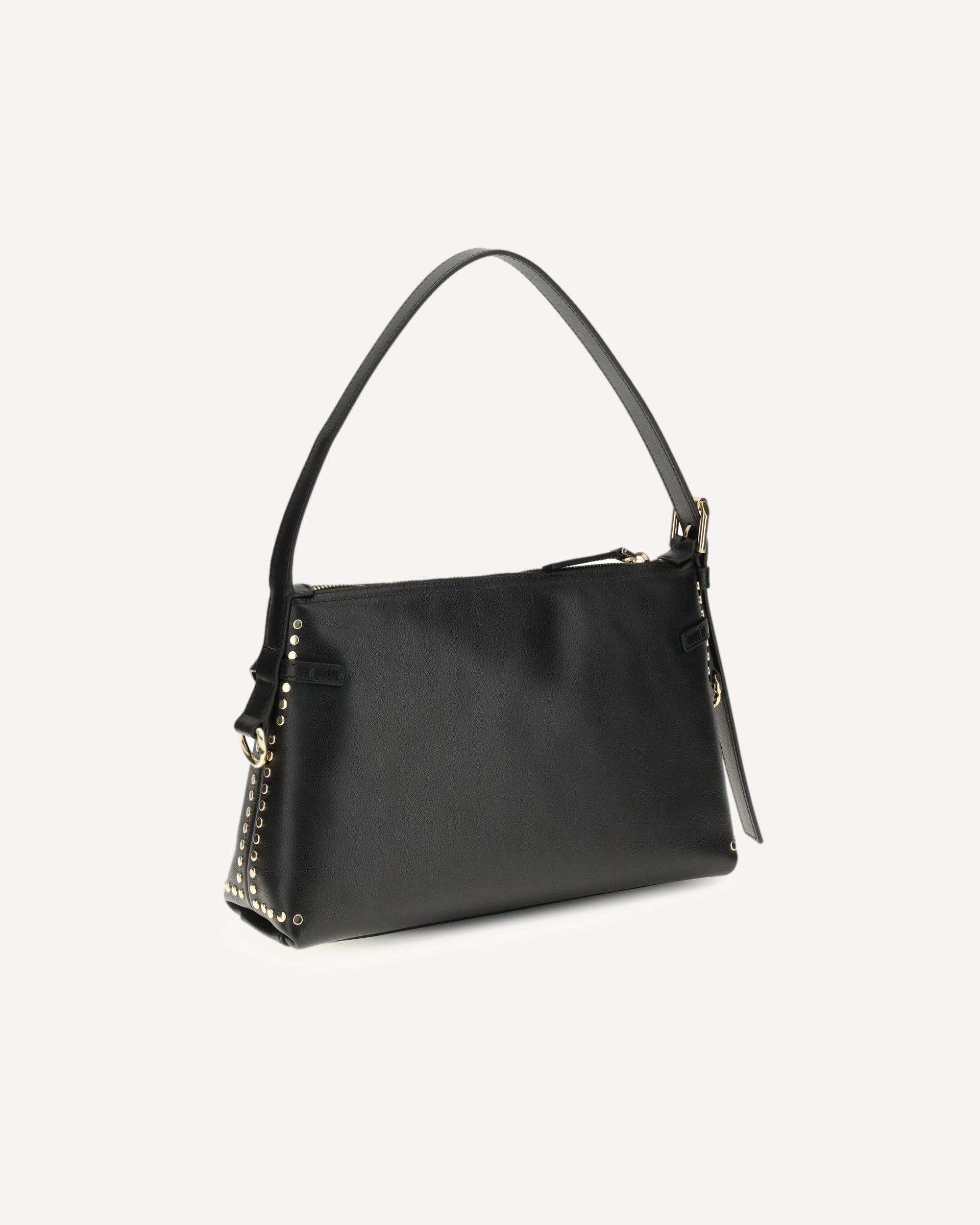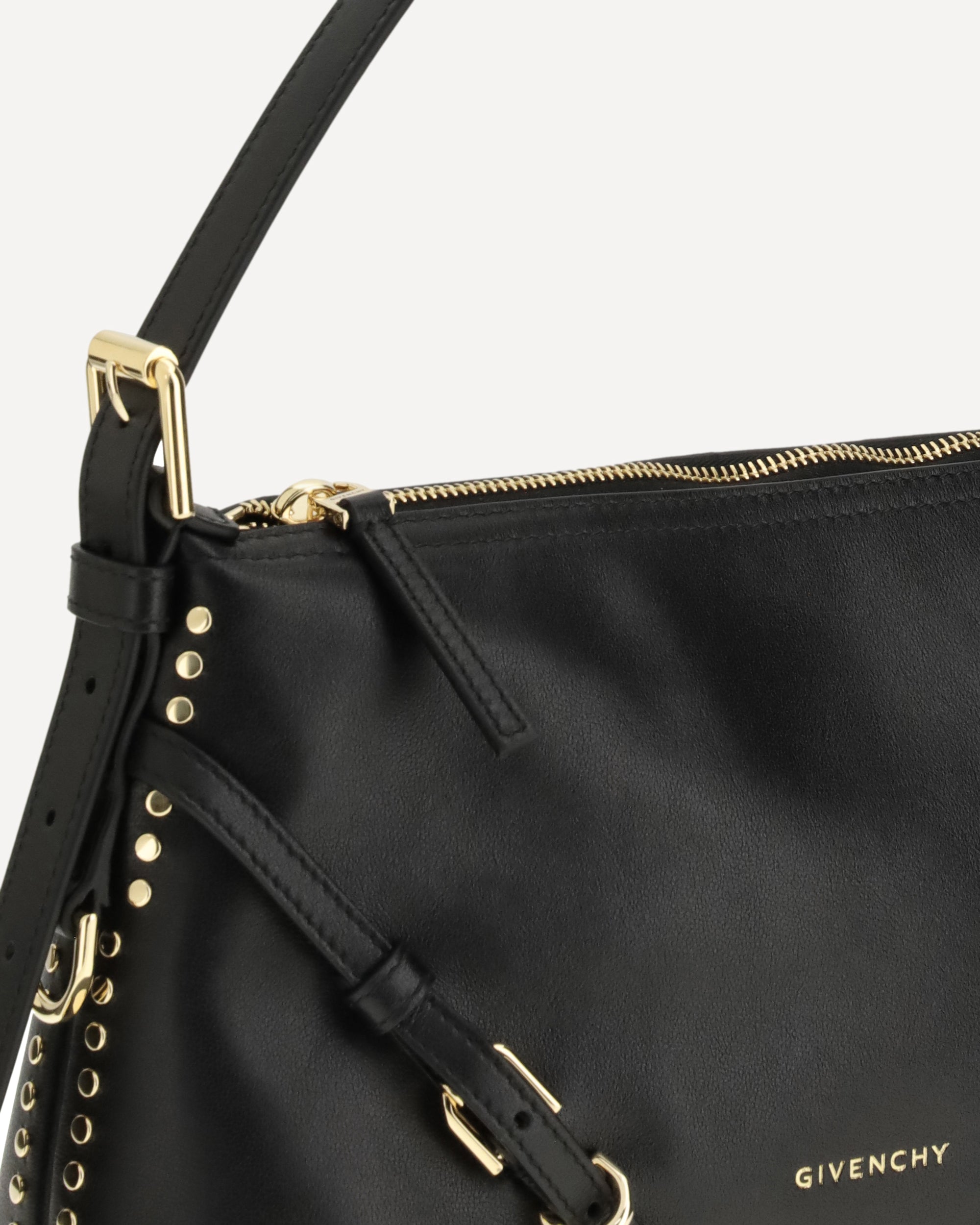 The Voyou Shoulder Bag by Givenchy features a soft V-shaped silhouette and generous volume. The adjustable shoulder strap allows it to be carried by hand, shoulder or crossbody, ensuring maximum versatility. The brand's signature is stamped on both the front and top of the bag, while engraved metal clasps and gold-tone finish details complete the design with elegance.