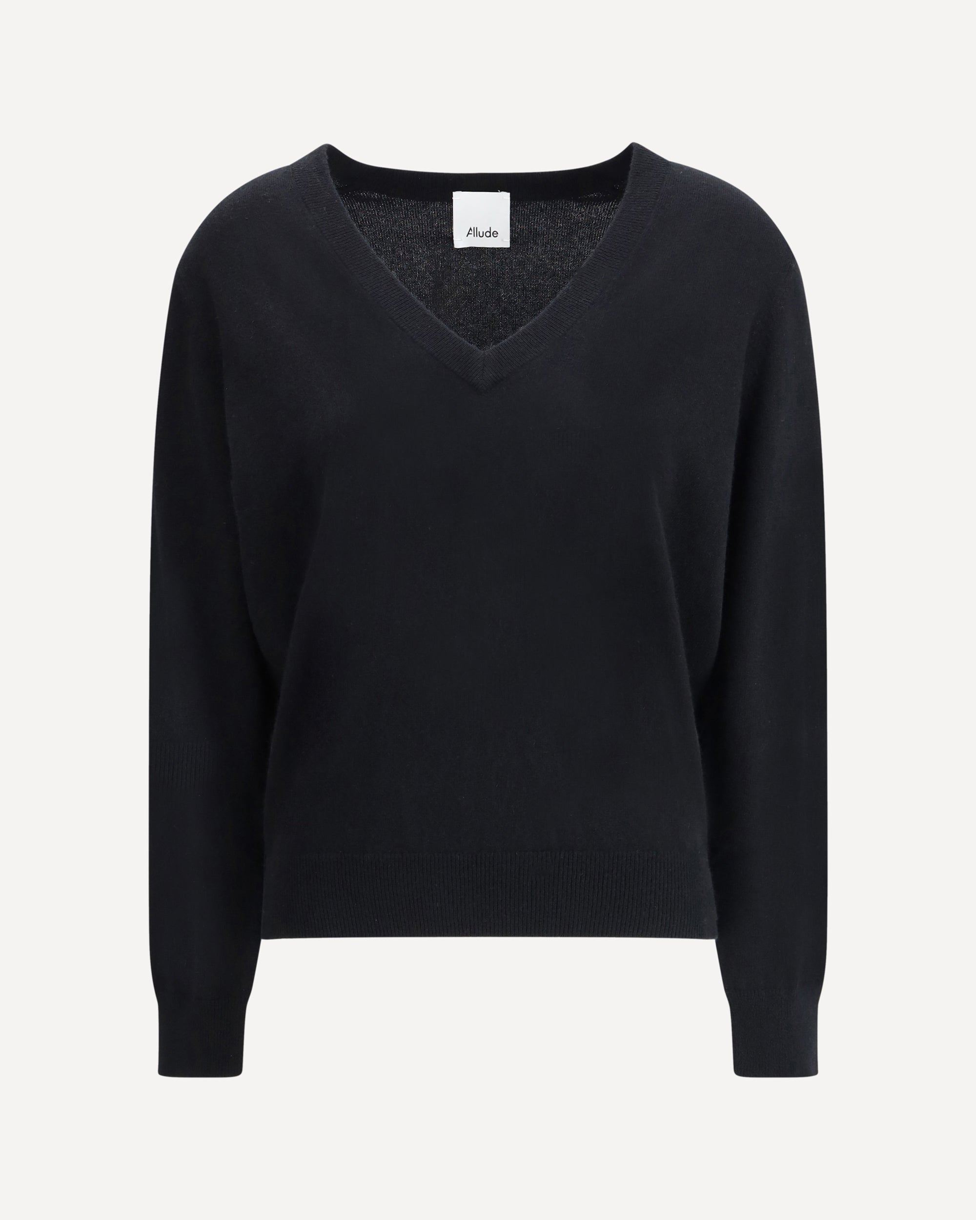 The cashmere Sweater by Allude is a refined and comfortable garment featuring a ribbed V-neck that elegantly enhances. The ribbed hem and cuffs add structure and detail to the design, while the dropped shoulders give a soft, modern fit. Perfect for those seeking a balance between classicism and comfort.