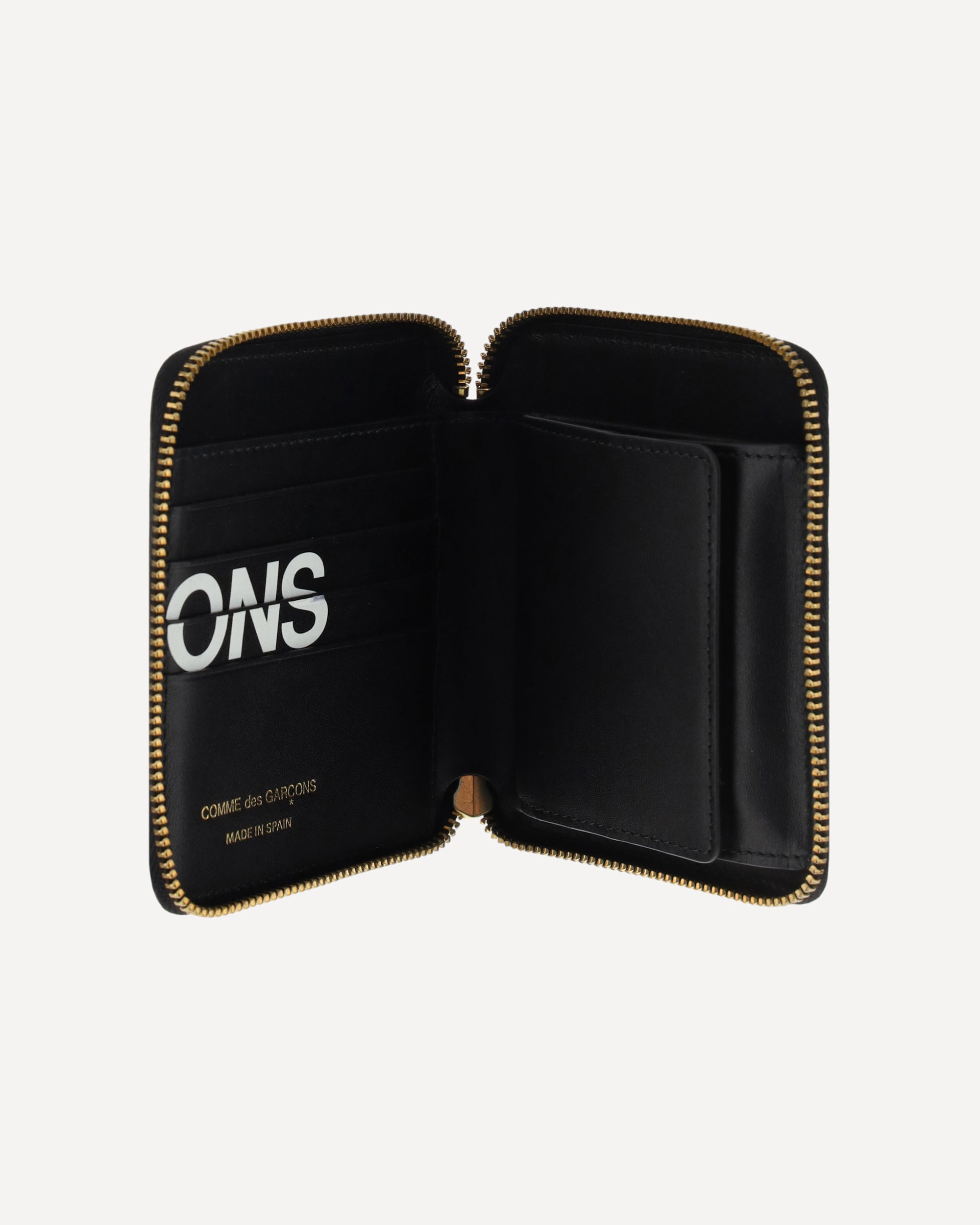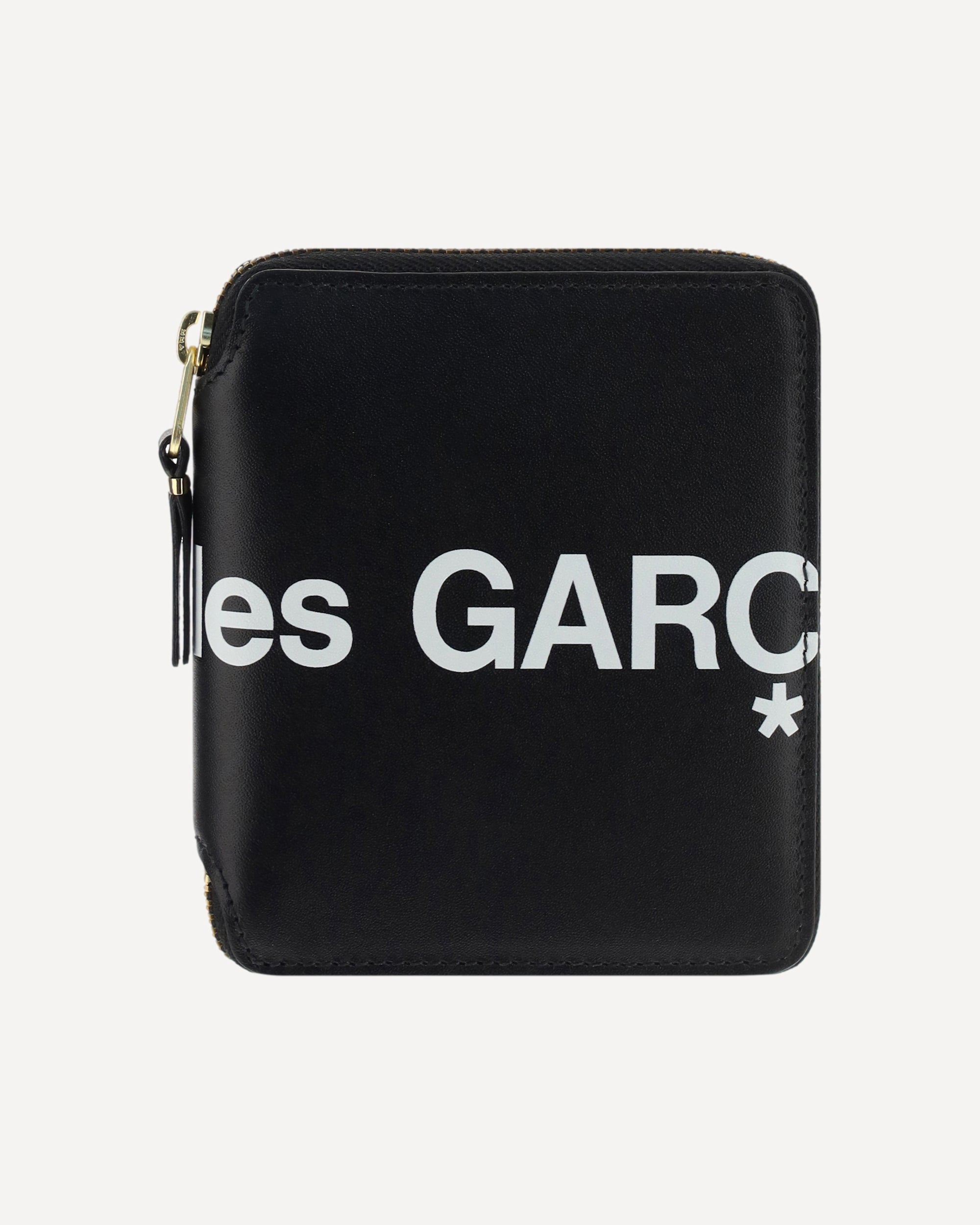 Calfskin Wallet by Comme des Garçons, turn-around zipper closure, contrasting logo printed on front and back, one interior bill compartment, card slots and one coin purse with snap button, engraved gold logo on inside left side.