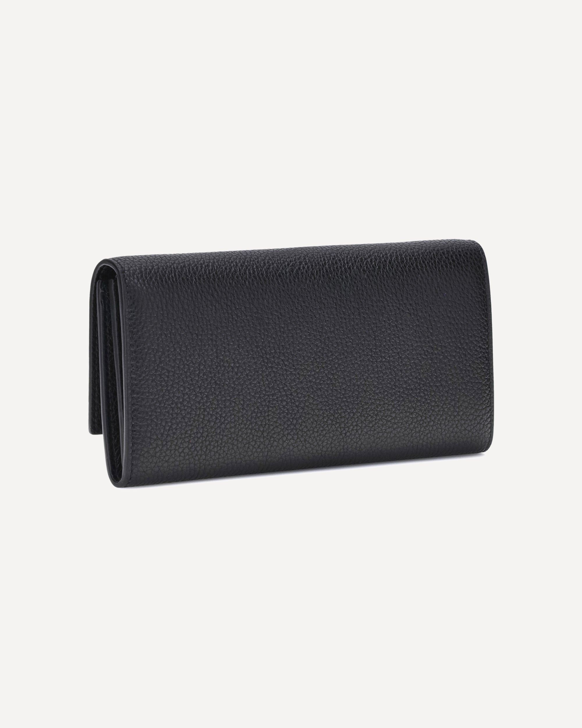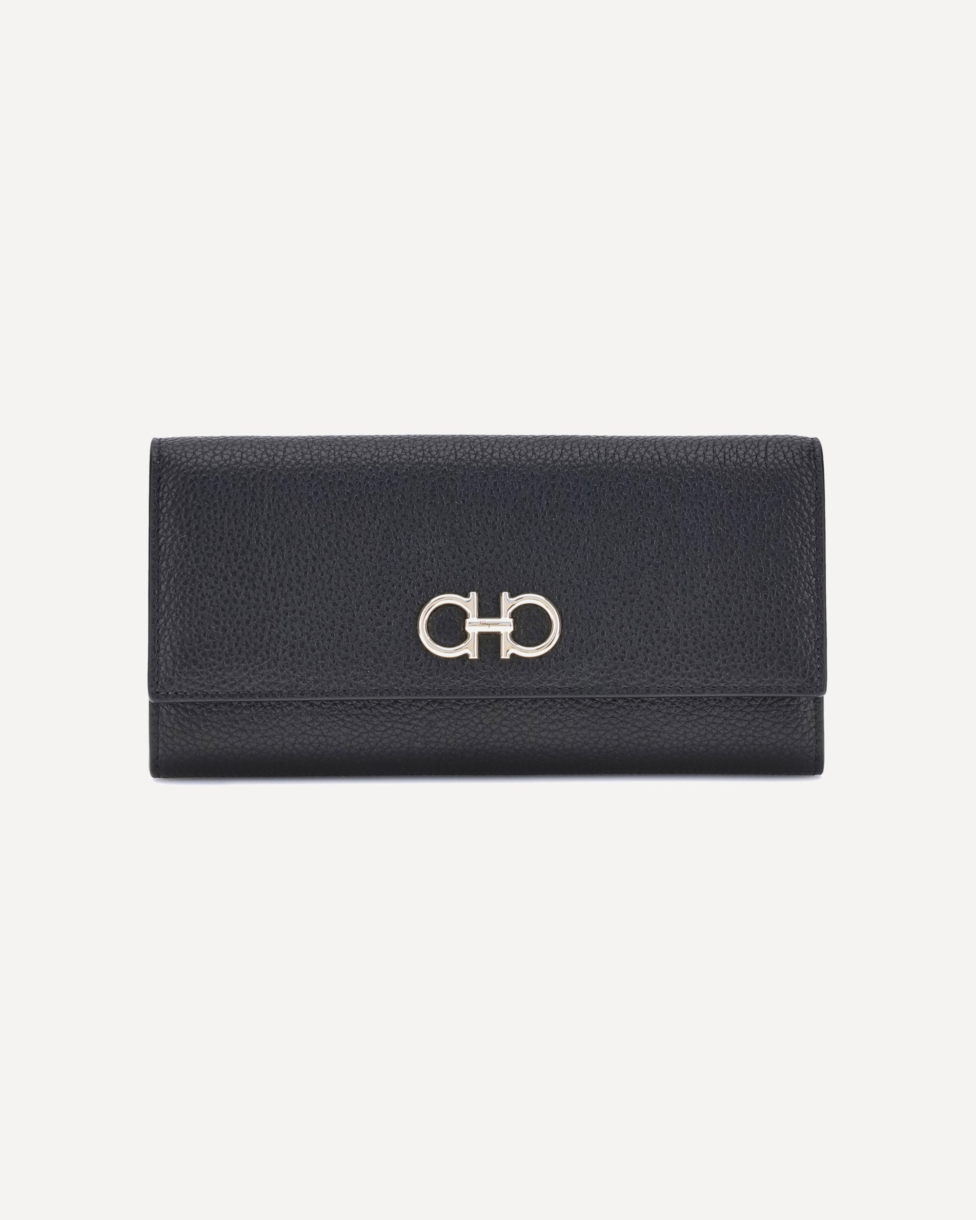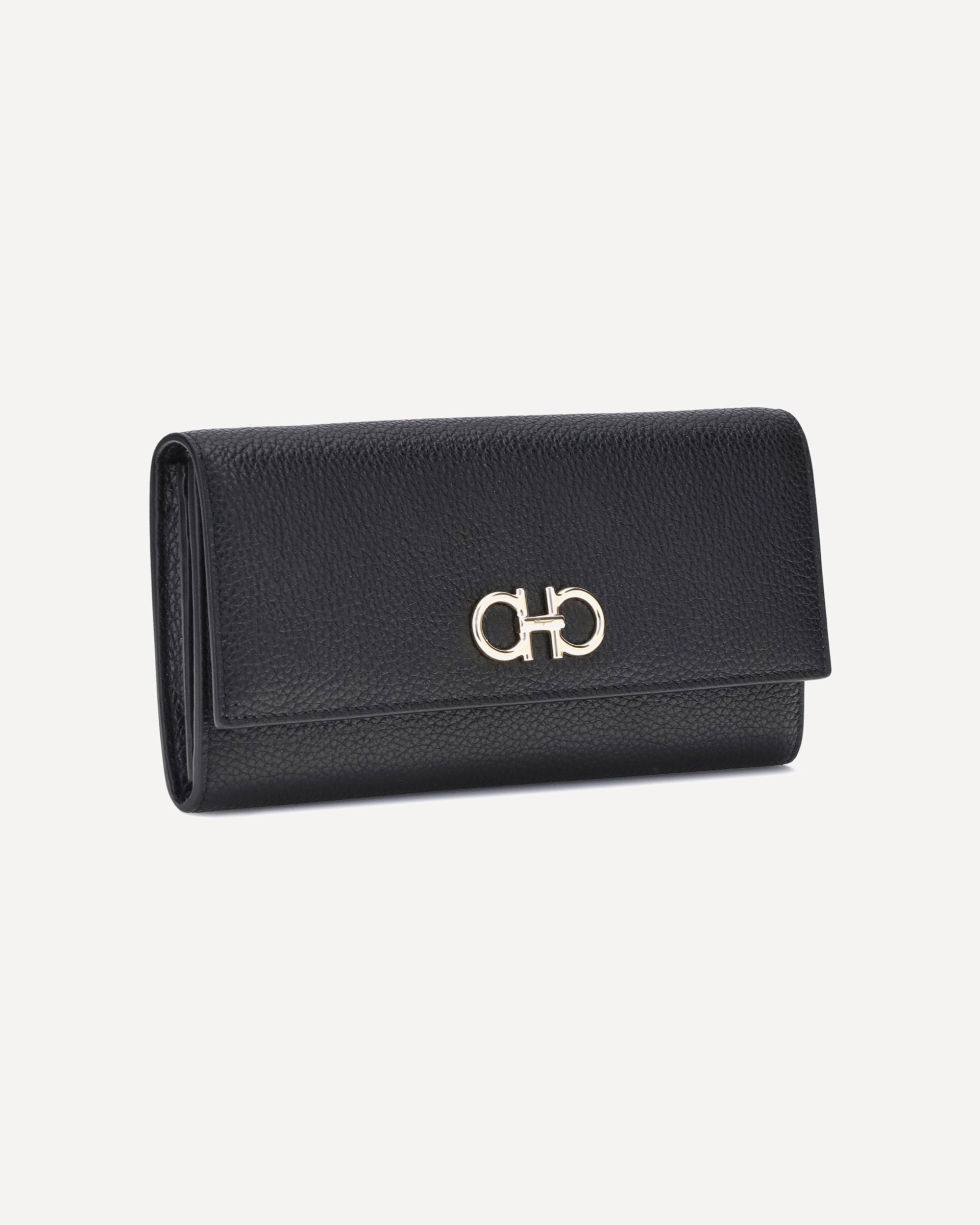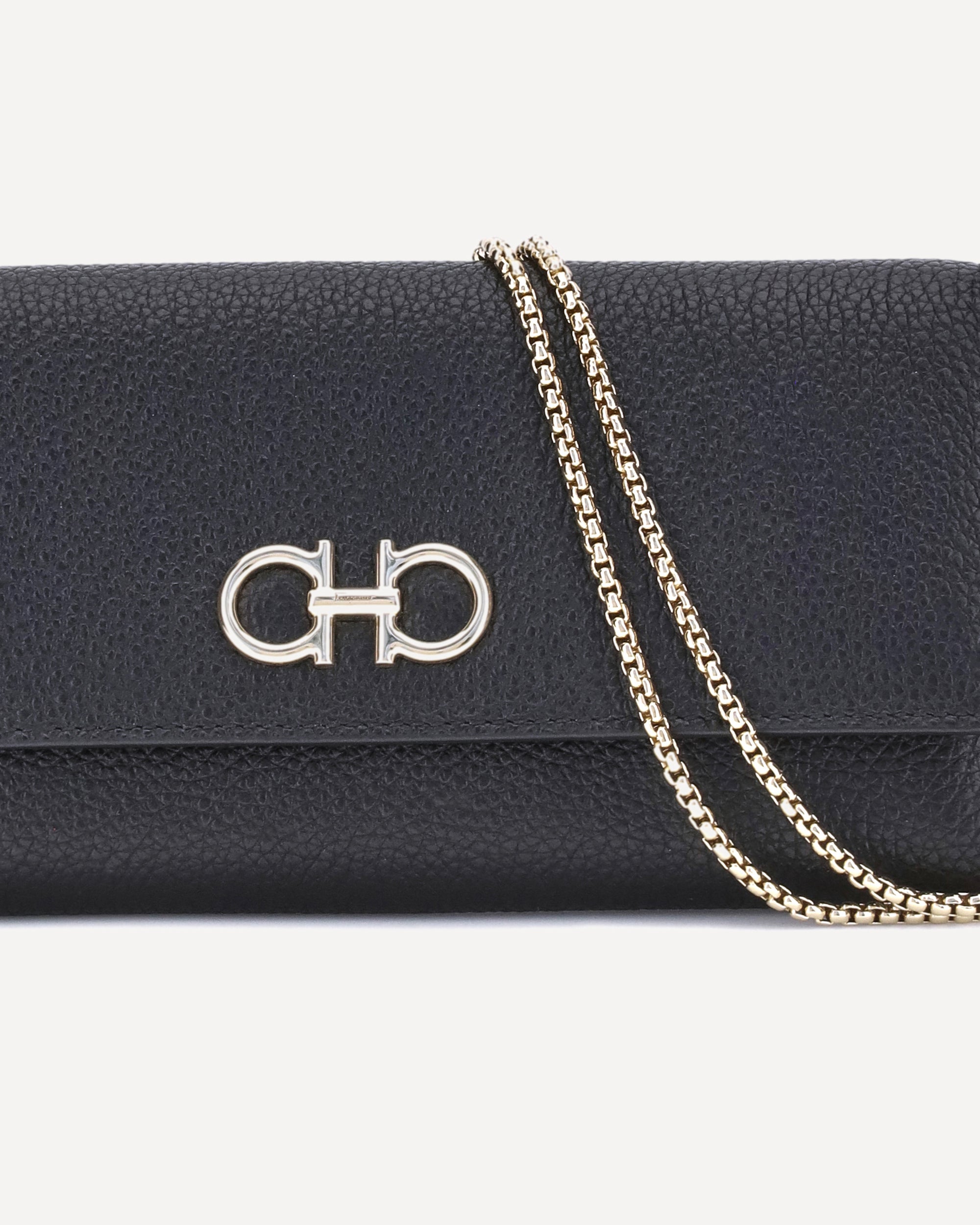 Ferragamo Wallet made of grained leather features a removable chain strap for dual functionality. The model features a front flap with snap-button closure and the iconic three-dimensional Gancini applied detail. Inside, it features two compartments with card slots and a zippered slot pocket to better organize personal items with style and elegance.