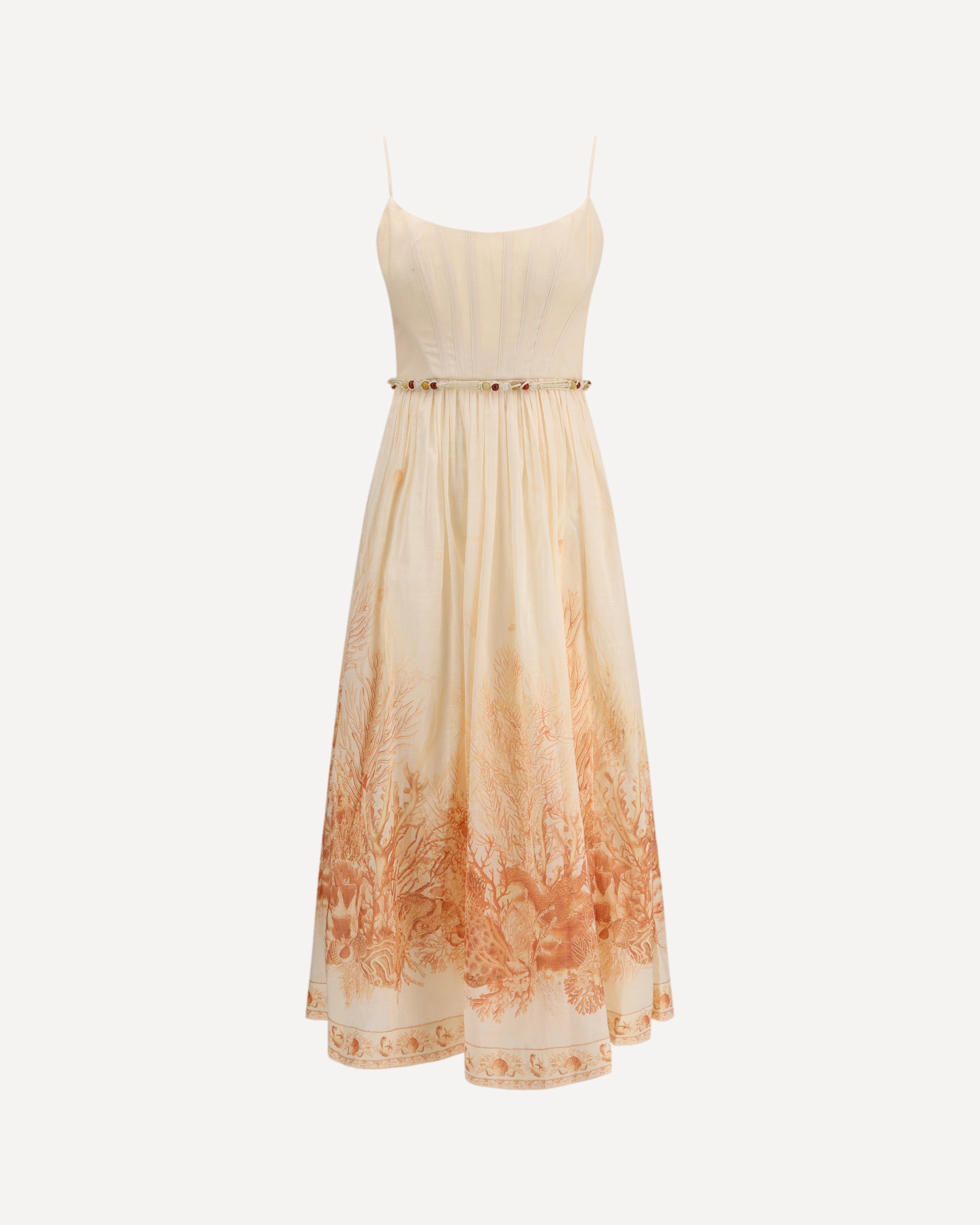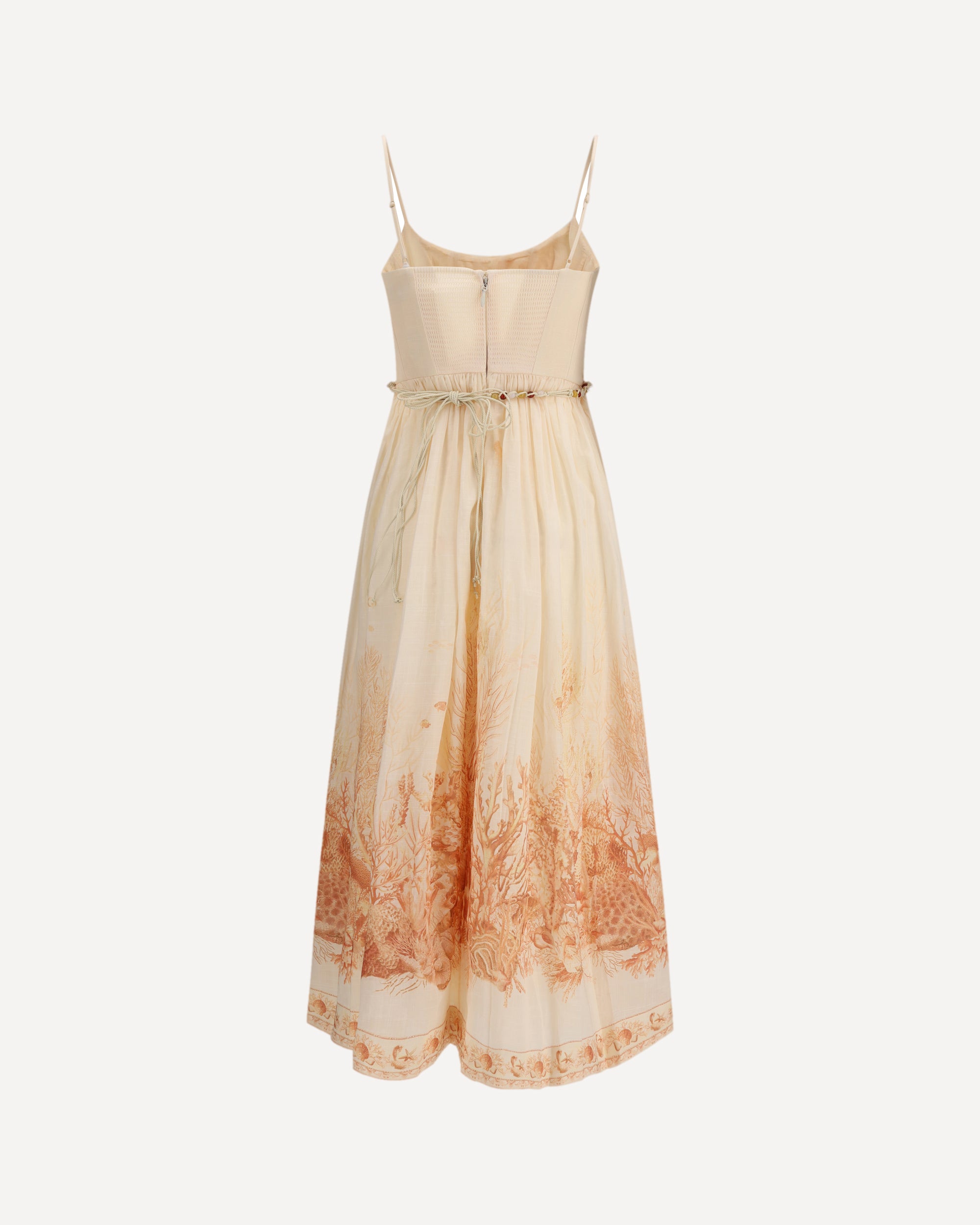 The Wanderlust Corset Midi Dress by Zimmermann from the Resort 2026 Collection captures the brand’s signature romantic and refined aesthetic. Crafted from 100% cotton in coral Toile print, it features a structured, boned bodice that defines the waist, enhanced by a rouleau tie belt that knots at the side. Adjustable straps, a gathered back with invisible zip closure, and side pockets offer both functionality and comfort, while the lined full skirt adds graceful volume and movement.