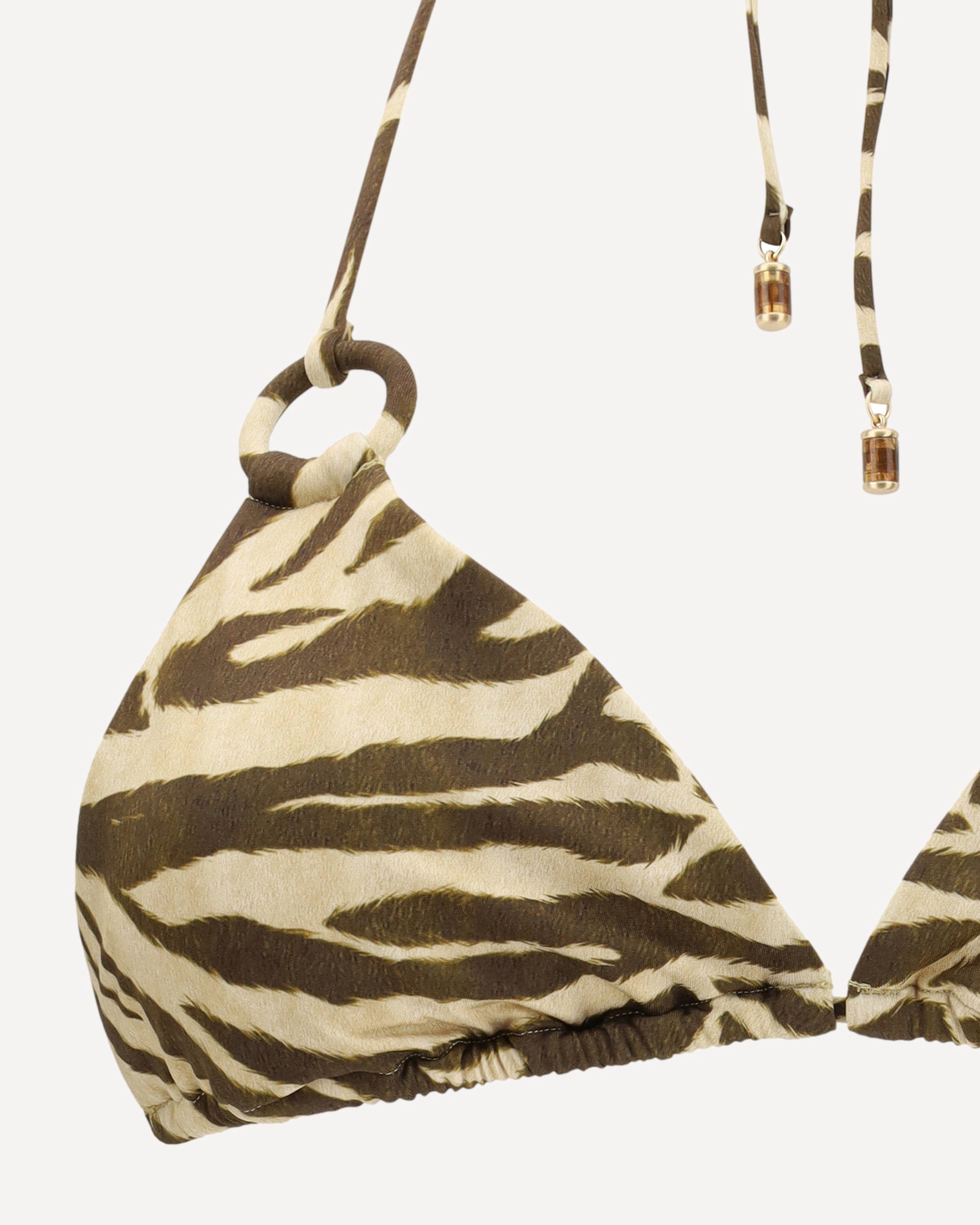 The Wanderlust ring and tie Bikini by Zimmermann from the Resort 2026 Collection captures the brand’s signature feminine and sun-soaked aesthetic. Made from metallic-finish lycra, it features a striking zebra print that enhances its summery appeal. The triangle top and low-rise skinny bottoms are detailed with attached rings and tie fastenings with finished ends, while the fully lined construction ensures comfort and a flawless fit.