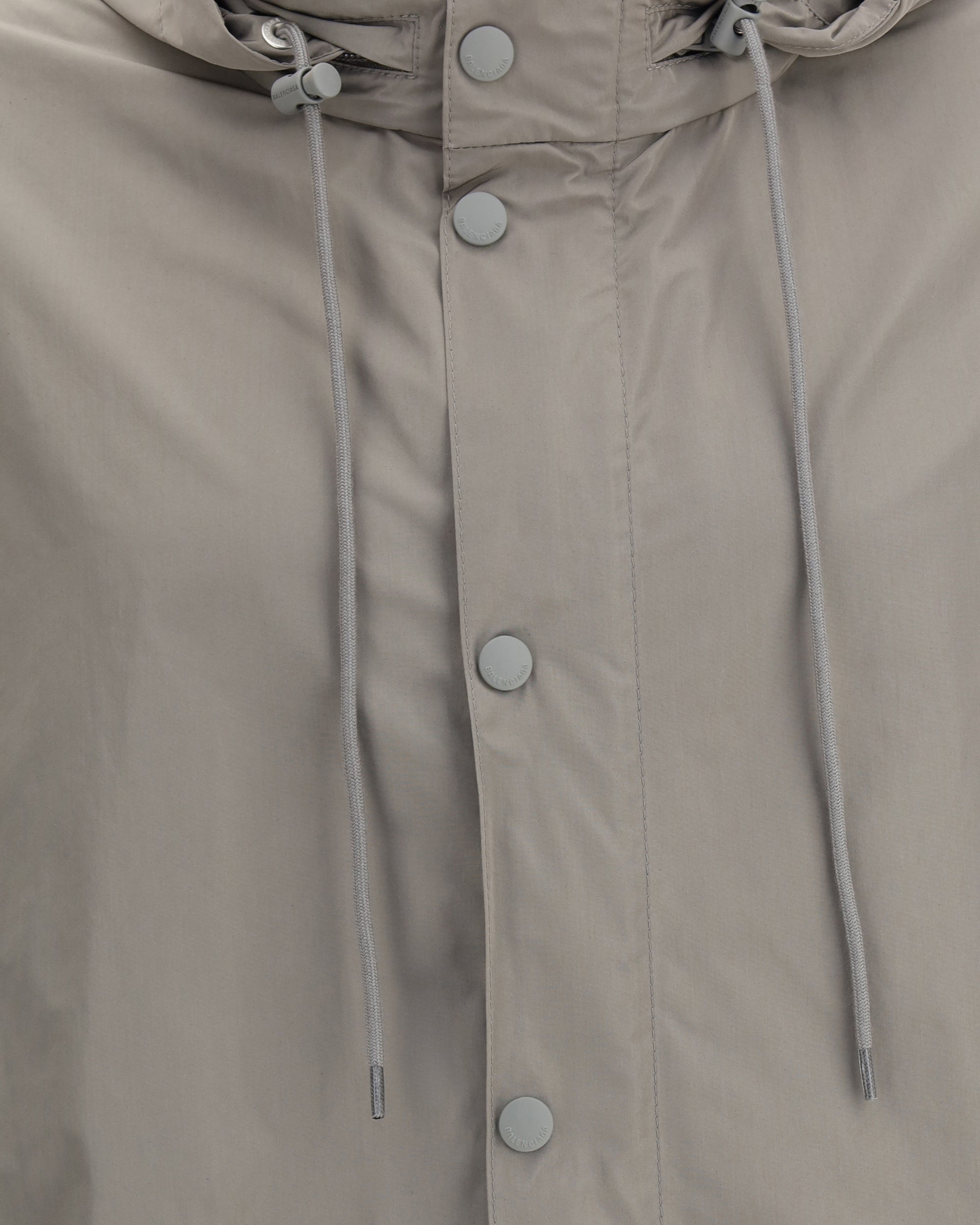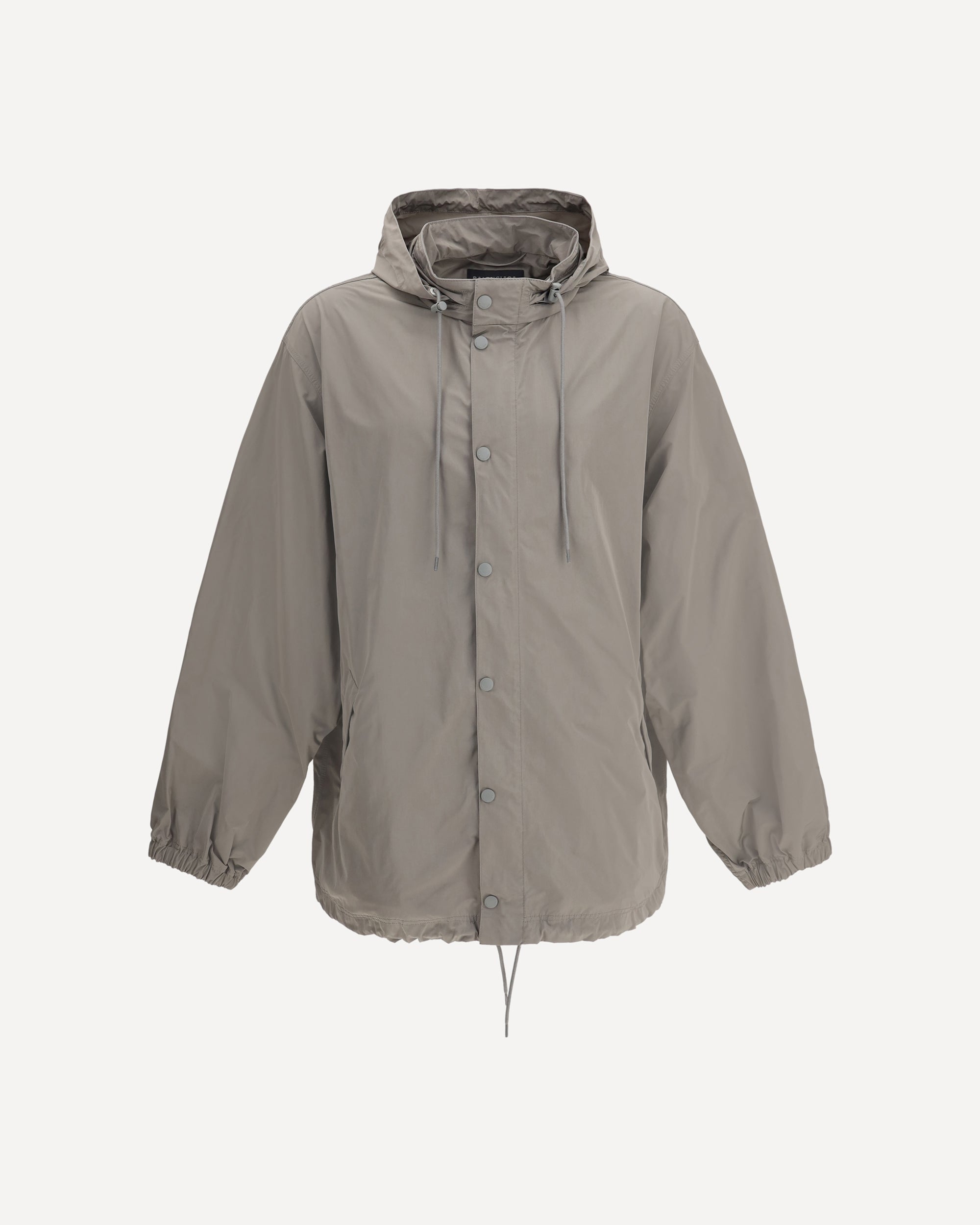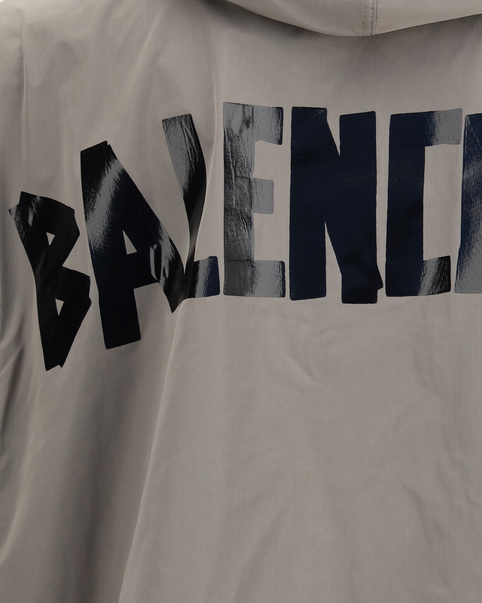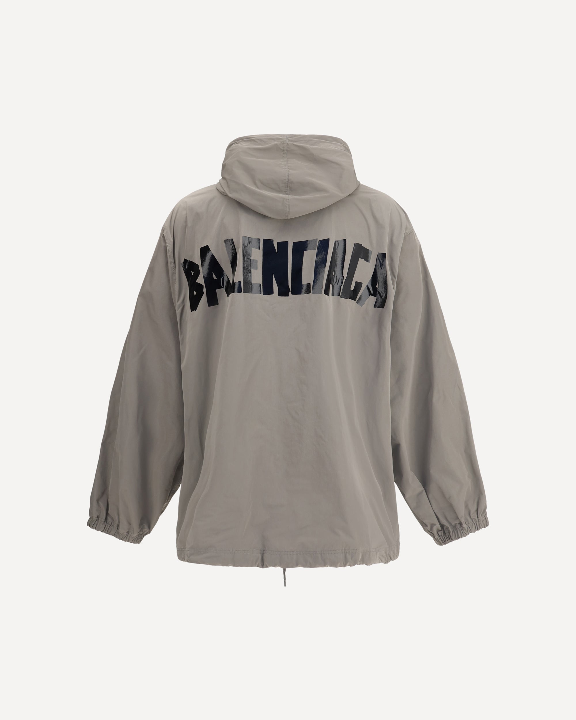 The Balenciaga waterproof Jacket combines technical functionality and urban style with a distinctive design. Crafted with an adjustable drawstring hood and high collar, it features a double-slider front zipper closure and buttoned flap for complete protection. Side welt pockets, elastic cuffs and an adjustable hem with inner drawstring ensure comfort and practicality. The iconic detail? The iconic scotch-effect monogram printed on the back panel, which adds a graphic and recognizable touch. The oversized fit completes the look with a contemporary flair.