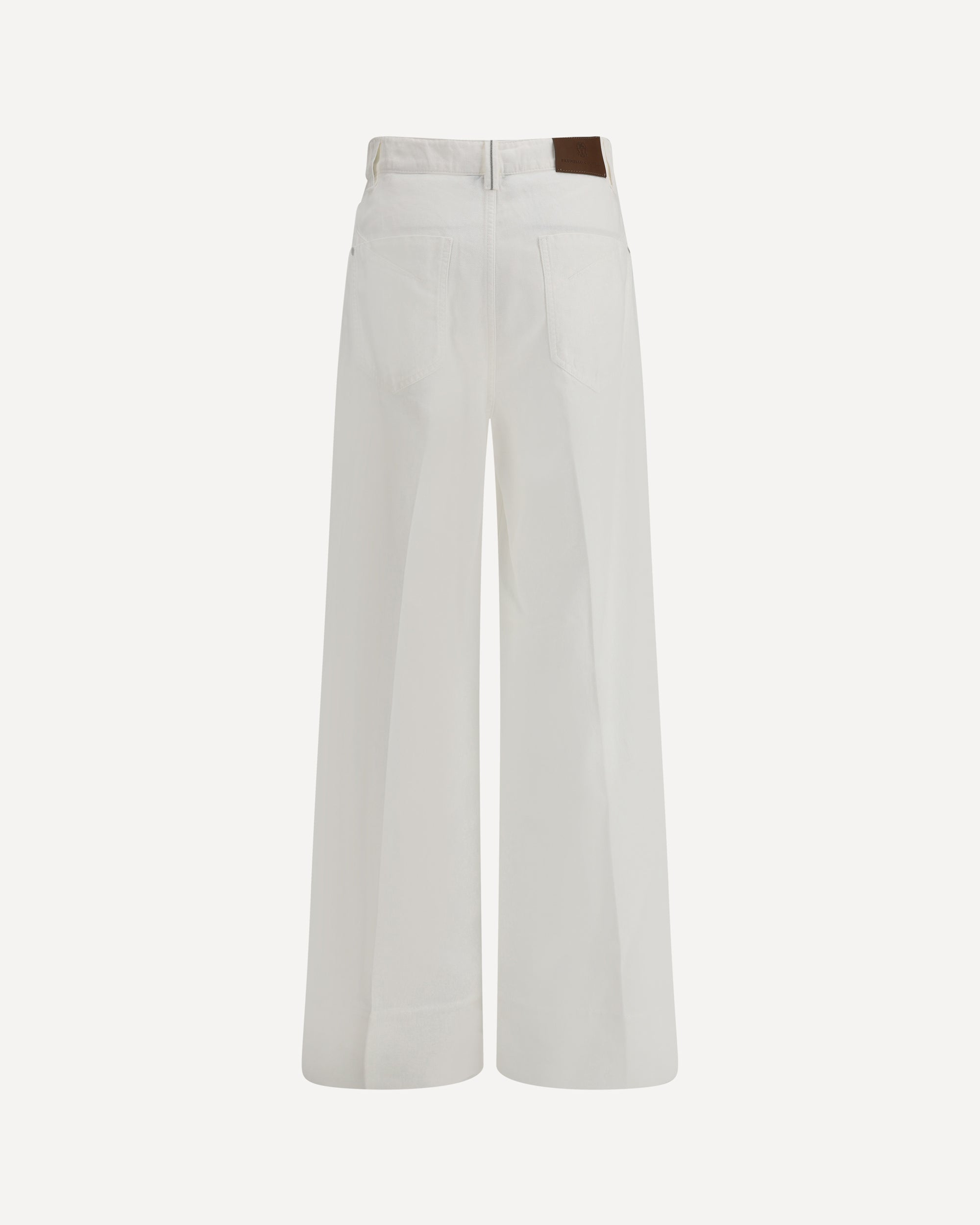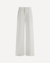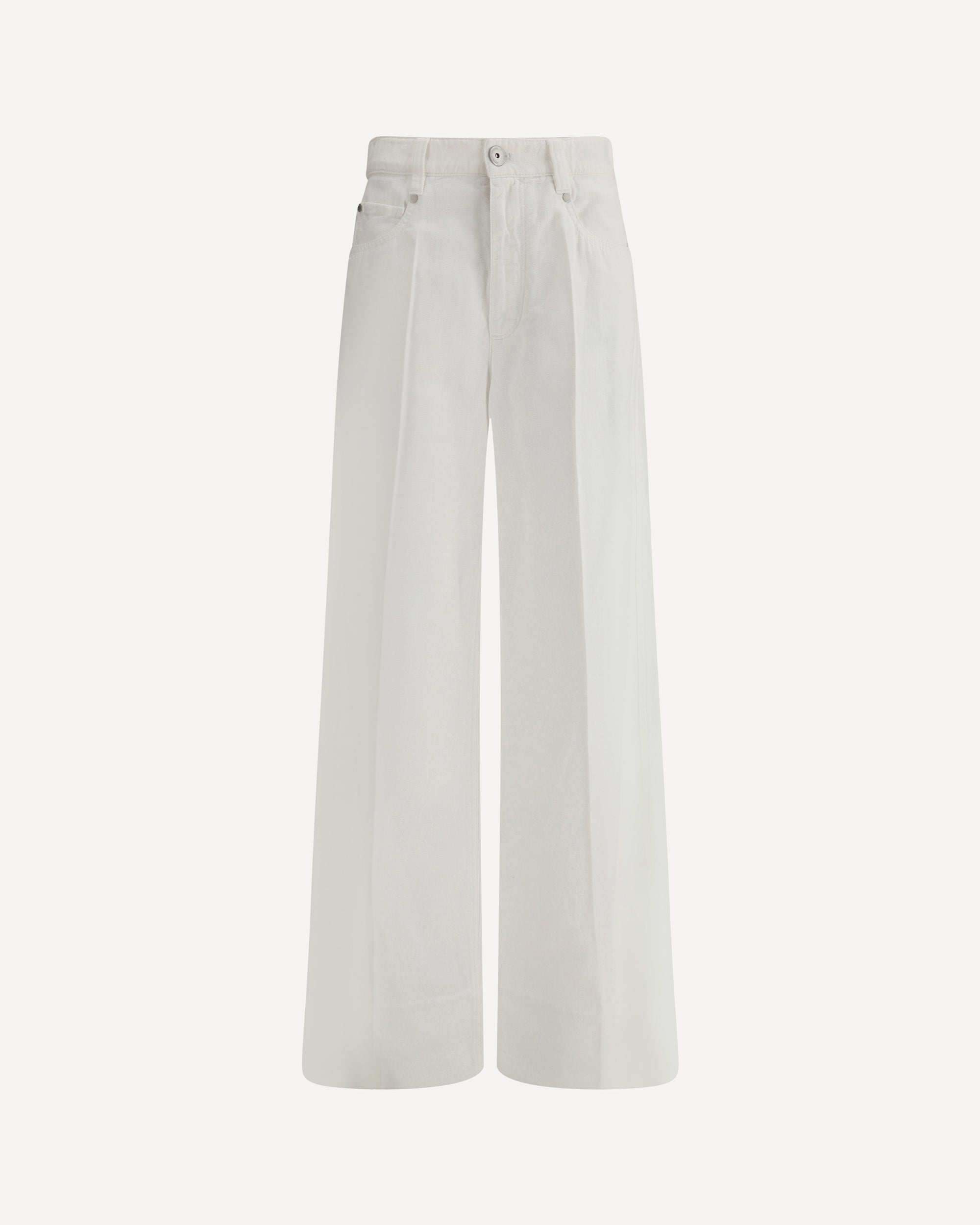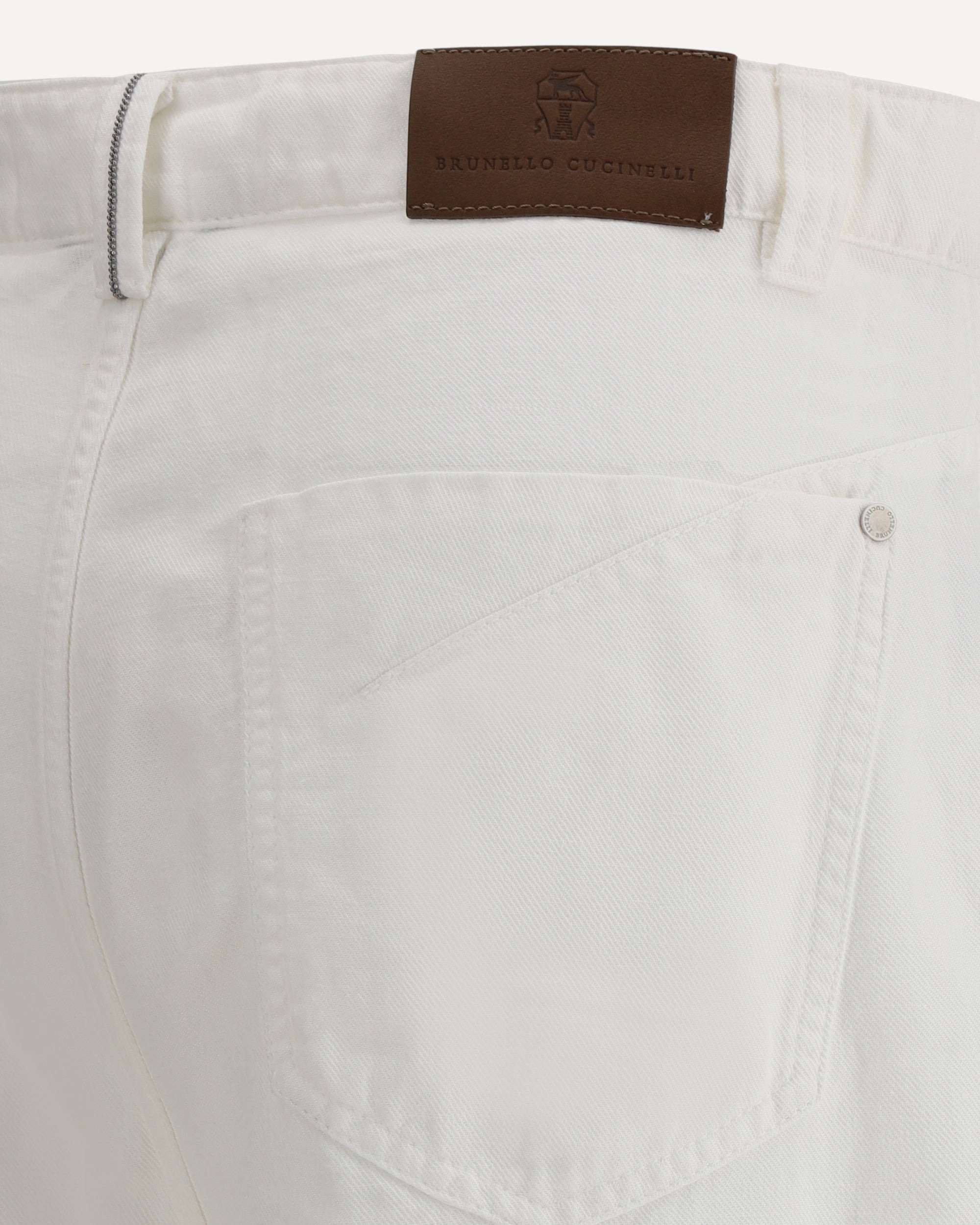 Brunello Cucinelli's cotton linen Jeans feature a mid-rise, five-pocket style perfect for a stylish and versatile look. The front zipper closure adds practicality, while the wide-leg design offers a comfortable, modern fit. Belt loops at the waistband are embellished with iconic appliquéd shiny jewels, adding a touch of sophistication. Applied logo leather patch on the back adds a distinctive and classy detail.