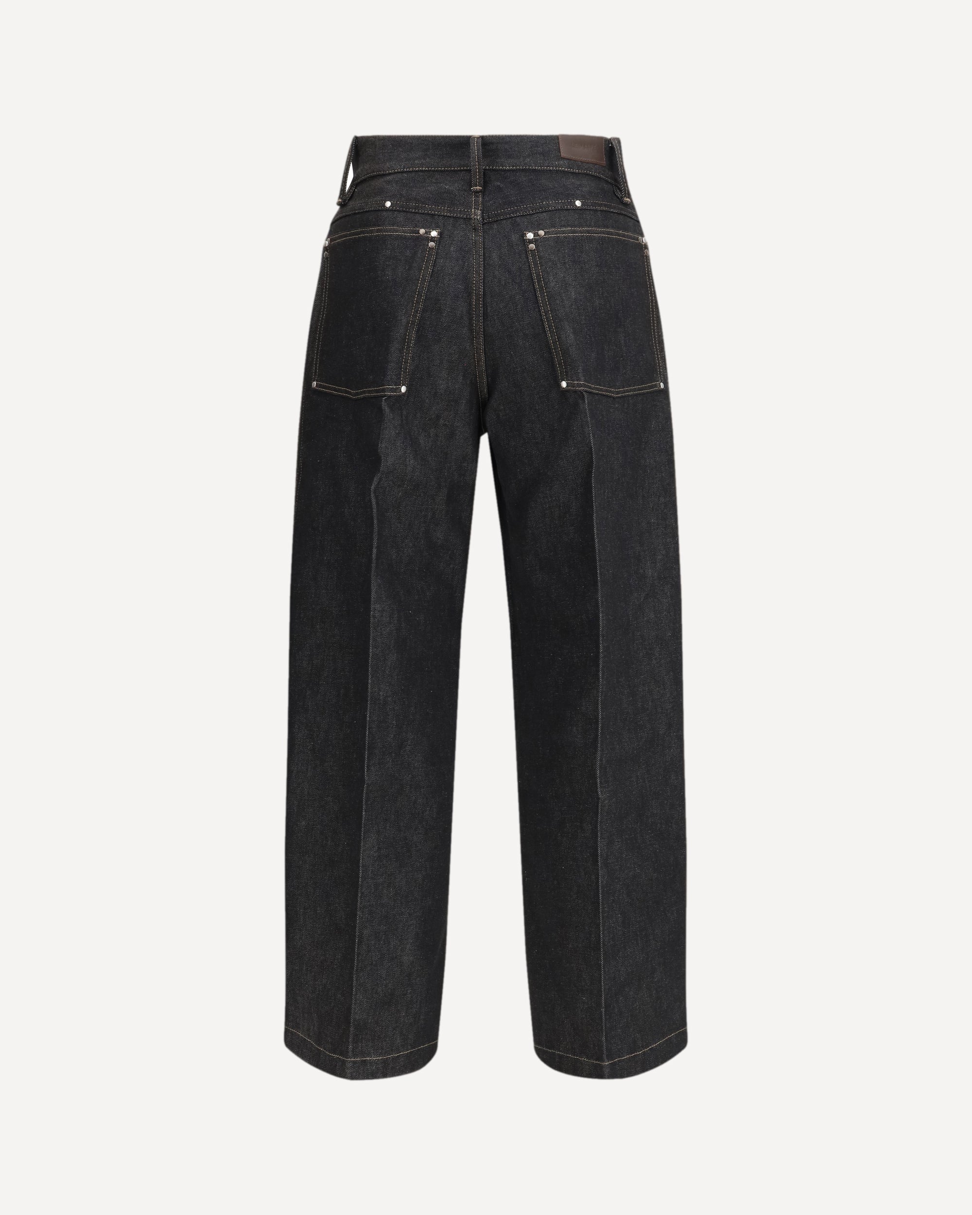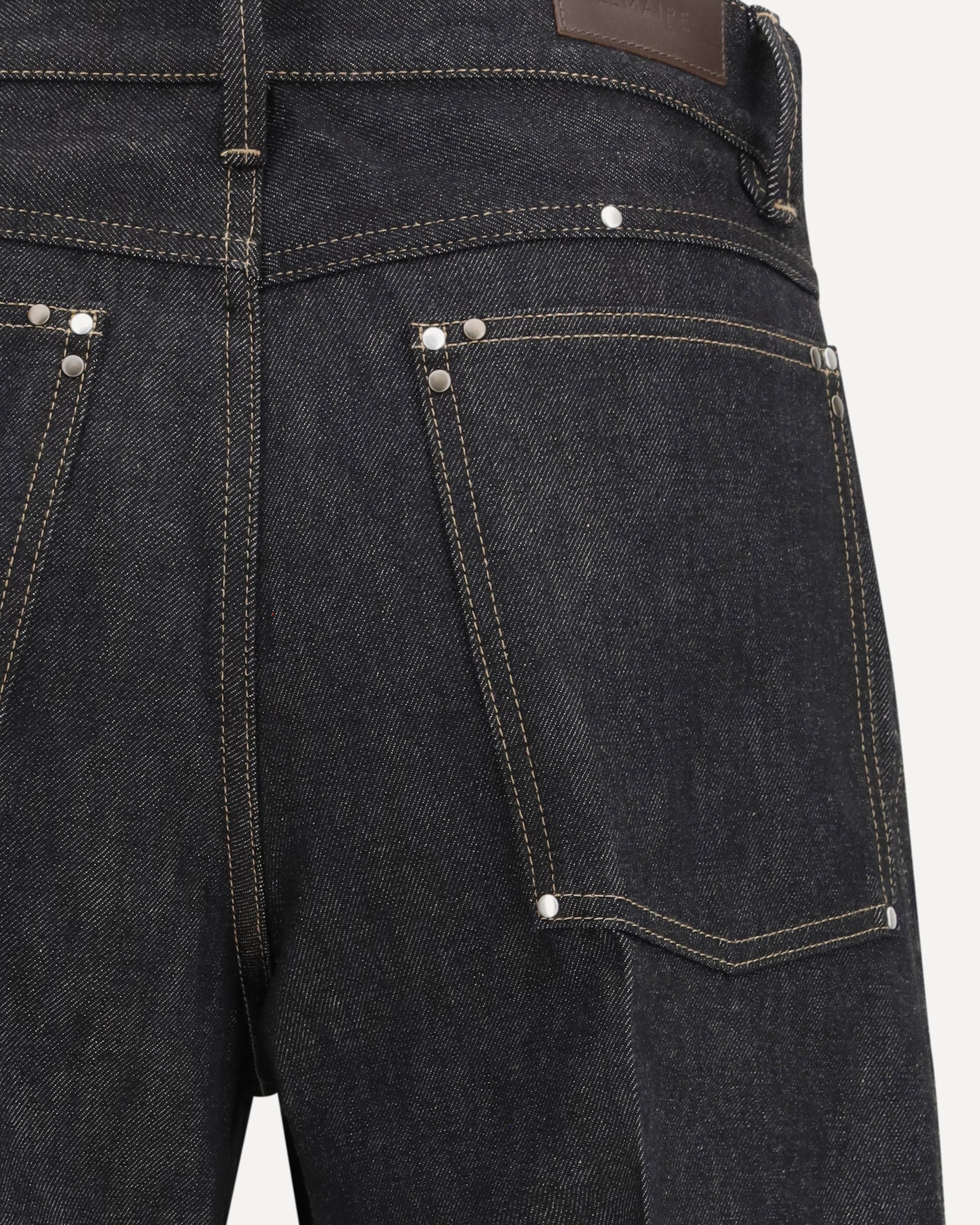 The studded Jeans by Lemaire convey a clean aesthetic enhanced by bold contemporary details. Crafted from cotton denim, they feature a front zip and button closure with belt loops for a classic construction. Front and back pockets are paired with pressed creases along the front and back, adding structure to the silhouette. Rivets in varying sizes and subtle stud embellishments introduce a graphic accent, while contrast stitching and a rear logo patch complete the design with a refined and distinctive signature.