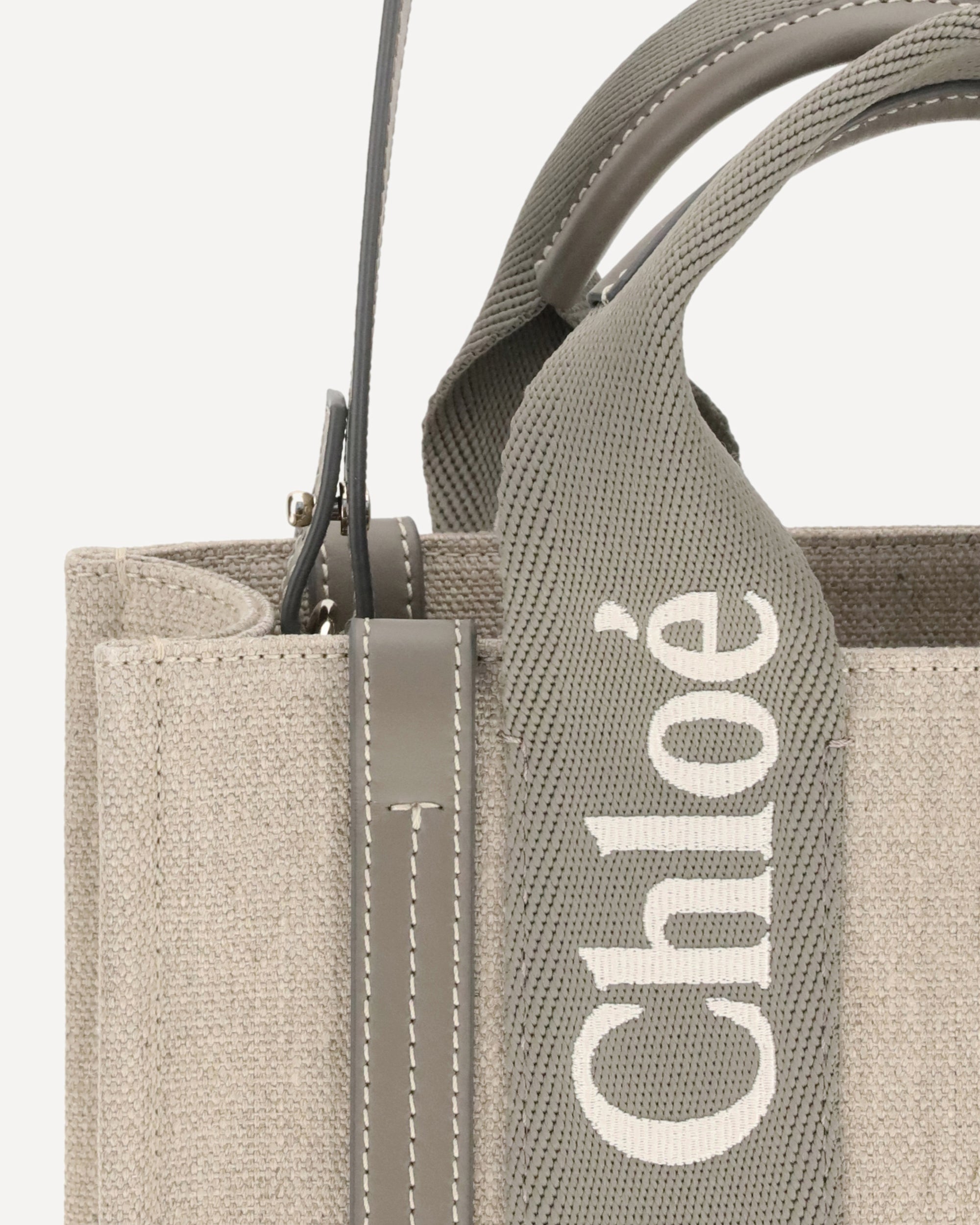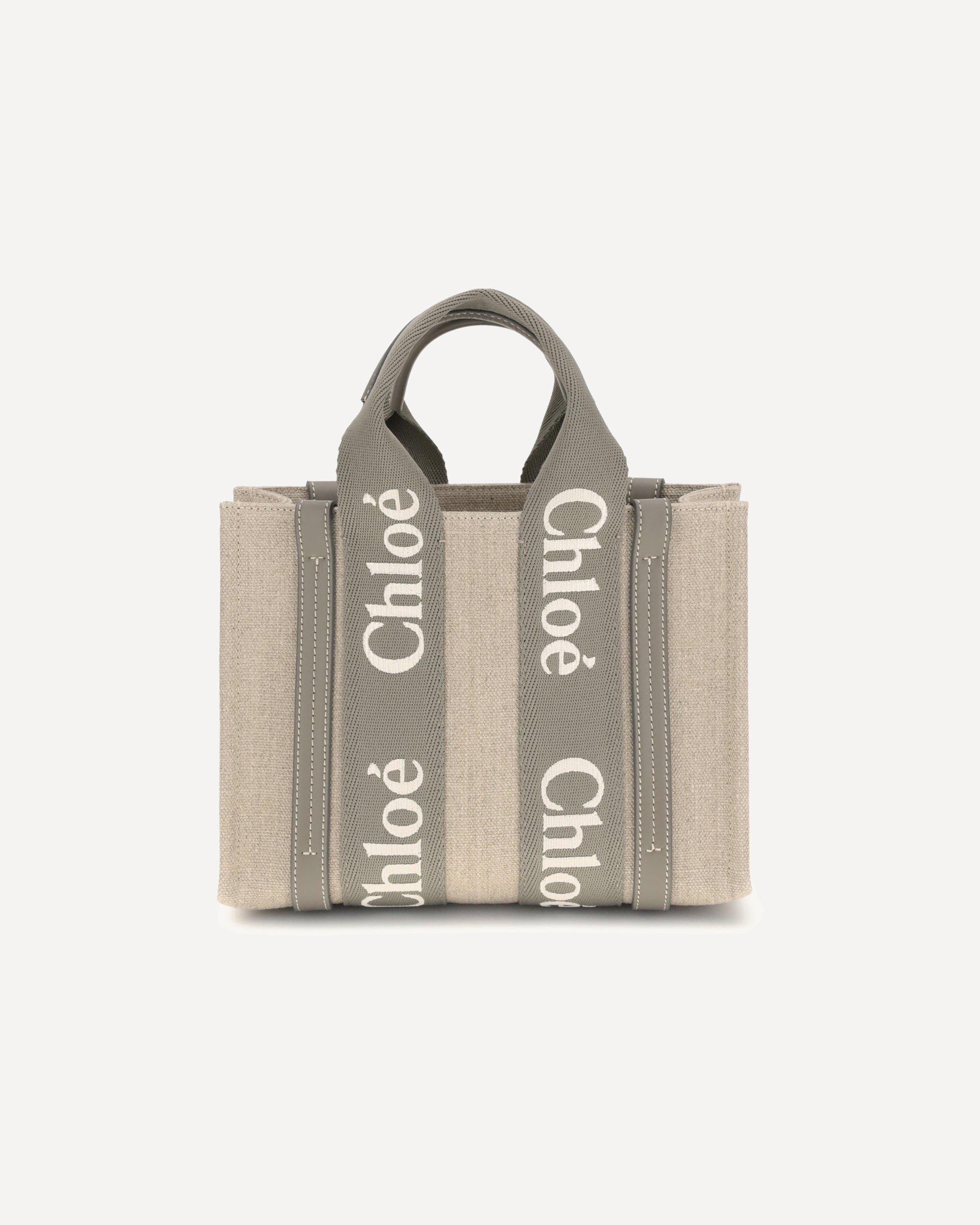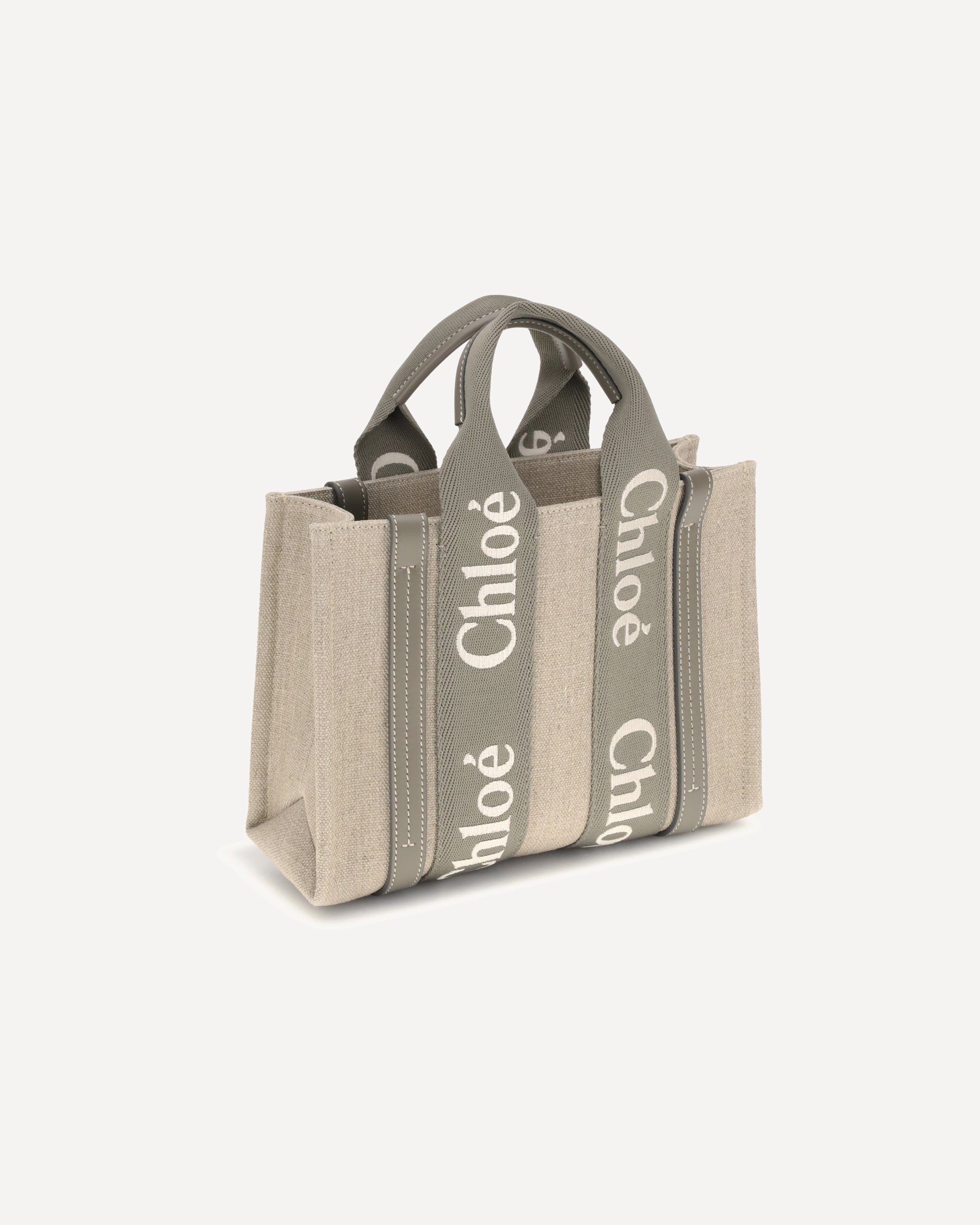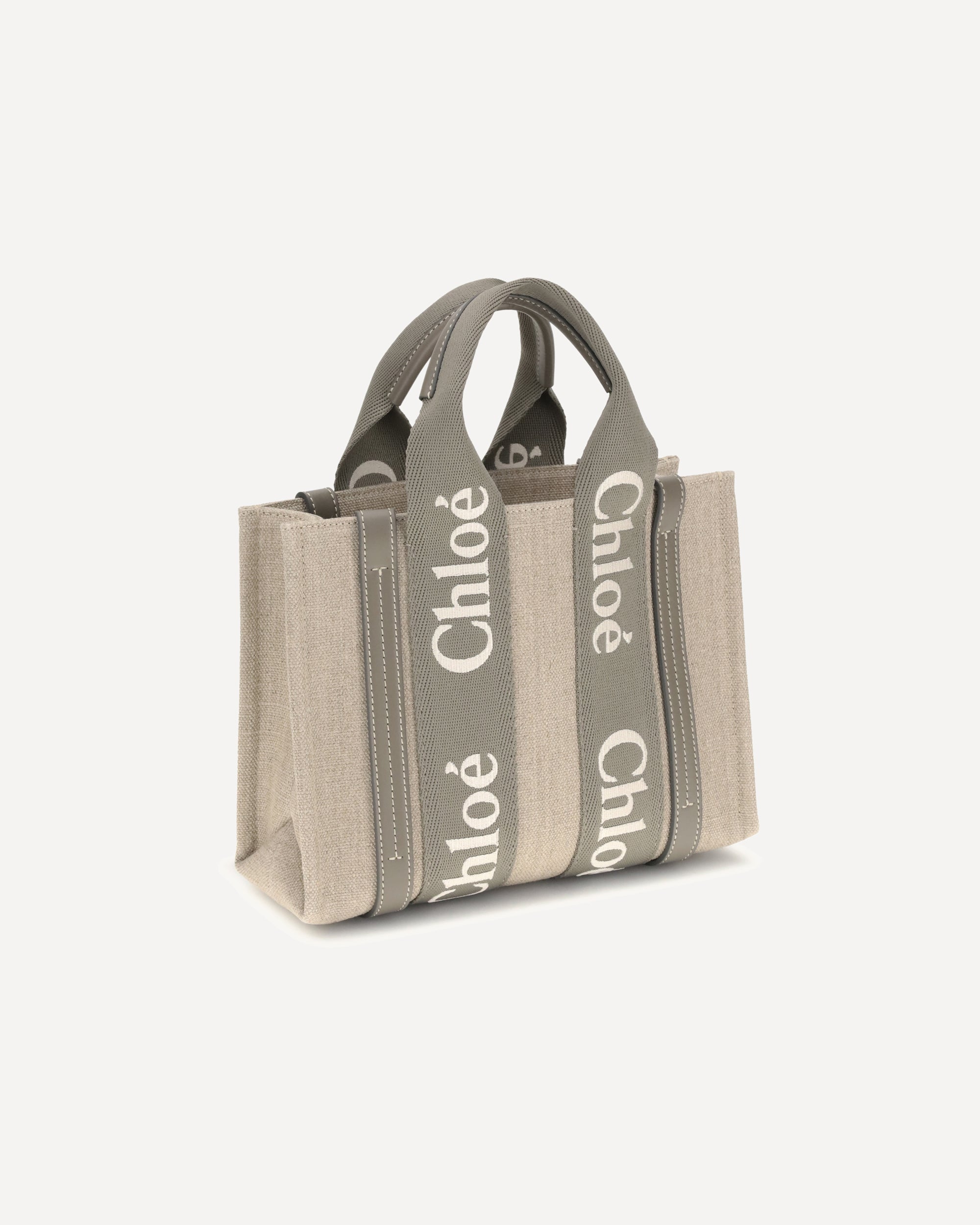 Chloé's Woody Handbag is an elegant and practical accessory made of linen and detailed with contrasting leather. The concealed button top closure maintains a clean design, while the double flat handles and extension on the leather side panels add sophistication. The removable and adjustable leather shoulder strap also allows it to be carried on the shoulder, offering versatility. Inside, a welt pocket keeps smaller items tidy, while the brand's iconic signature is affixed to the side panels, lending a distinctive touch.