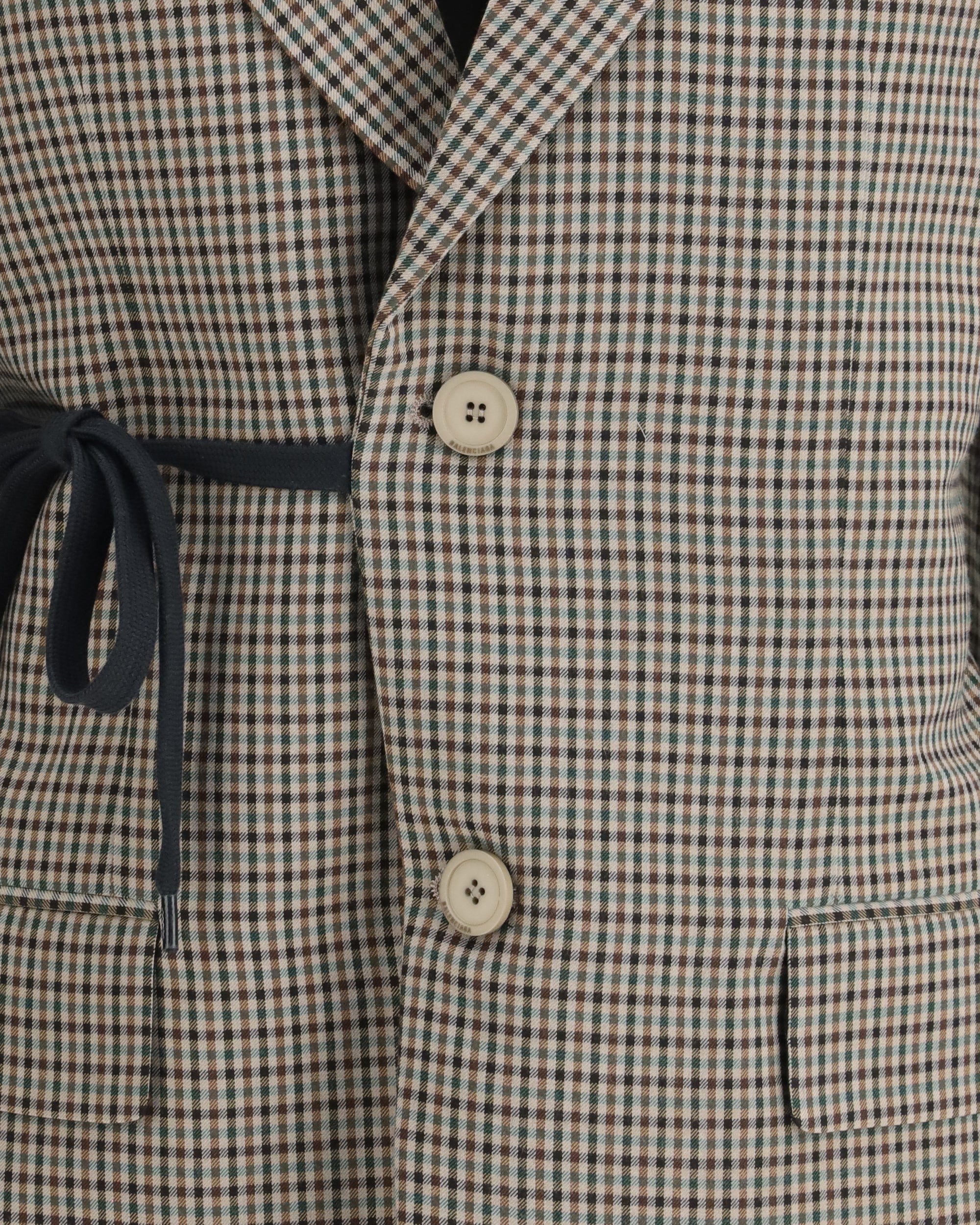 The single-breasted Vichy Jacket by Balenciaga blends classic tailoring with contemporary experimentation. Crafted from lyocell, it stands out for its wrap tailored construction, introducing a refined yet unconventional silhouette. The classic lapels, chest welt pocket, and two front flap pockets reference traditional tailoring, while the side tie detail adds a modern, functional edge. Finished with long sleeves with buttoned cuffs and a back vent, this jacket delivers a fluid, sophisticated fit with a distinct Balenciaga attitude.