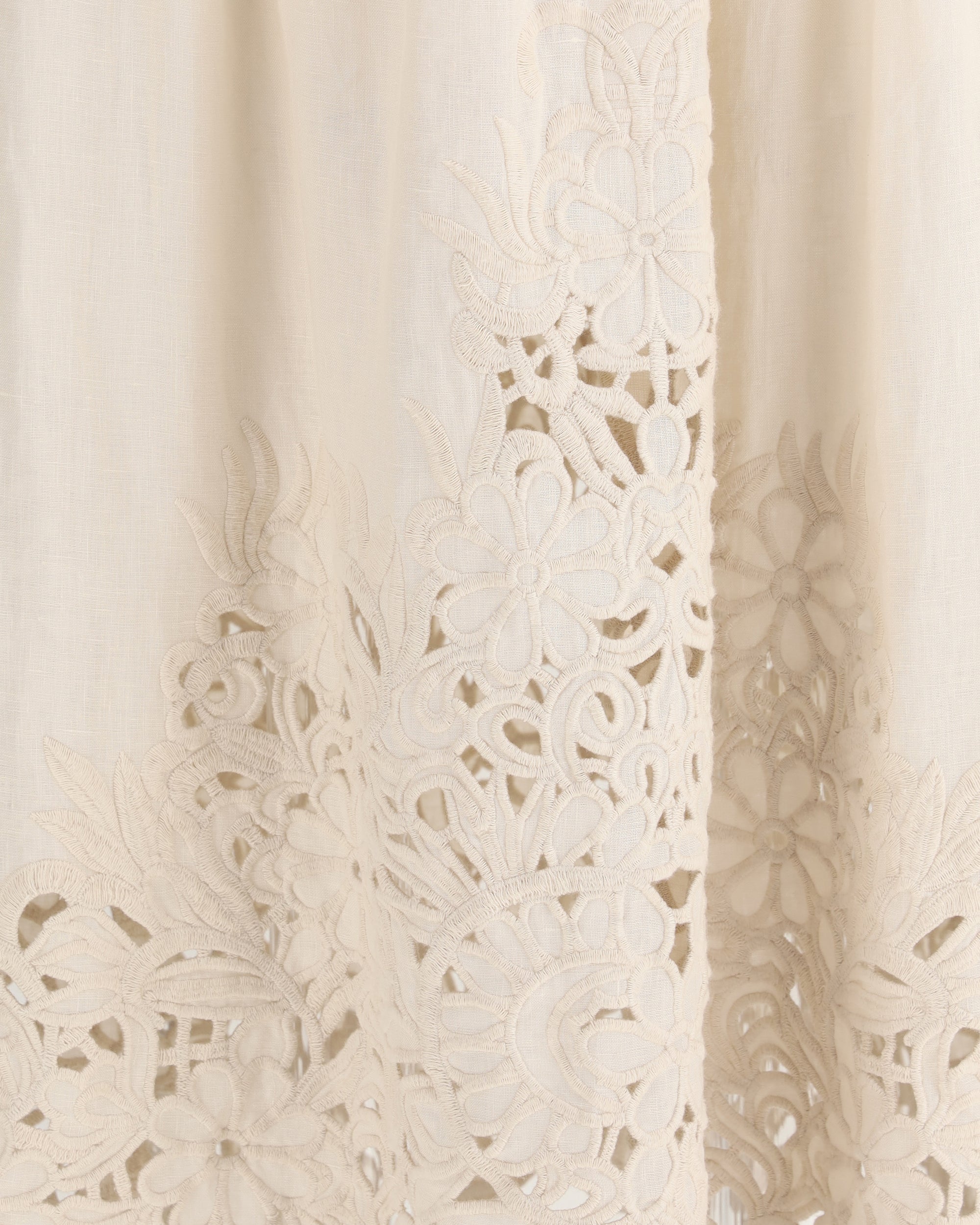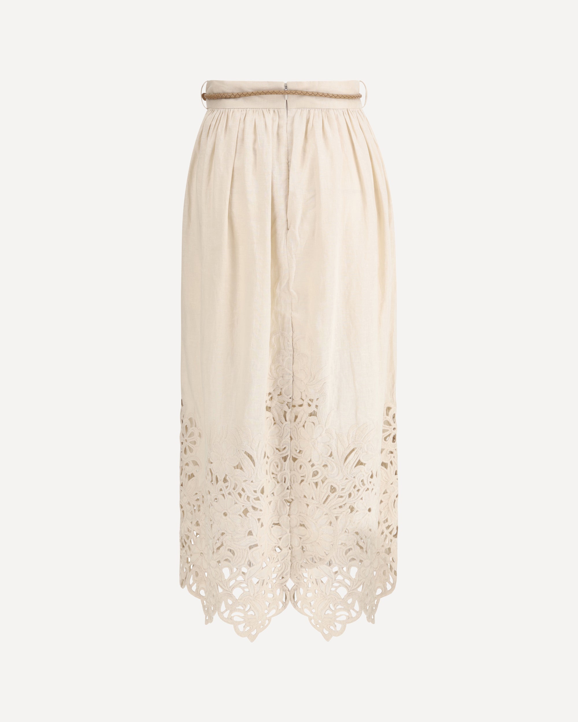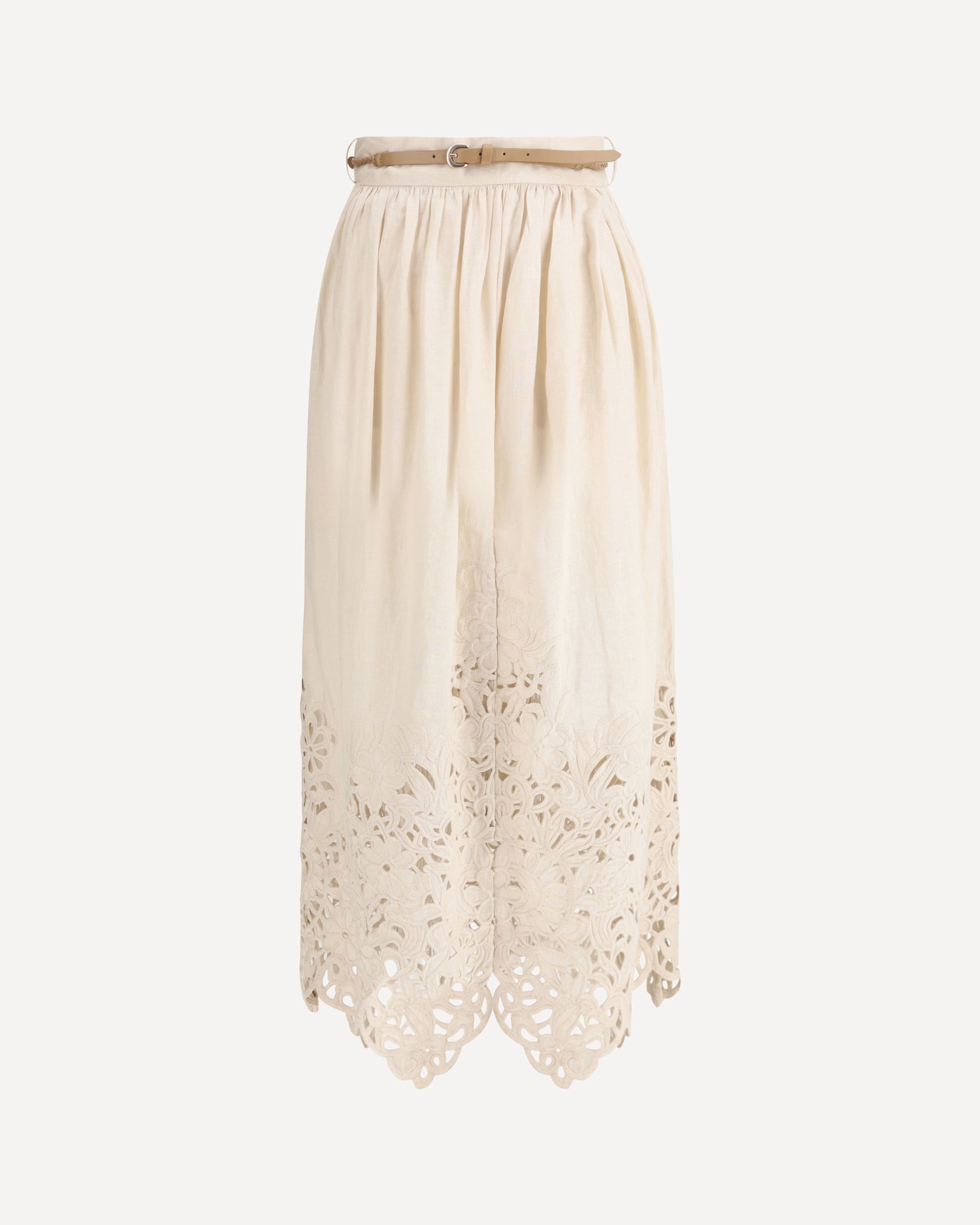 Wylie Embroidered Linen Midi Skirt by Zimmerman, back zipper closure, pleat detail on front panel, removable and adjustable leather braided belt detail, lace detail on bottom, regular fit.