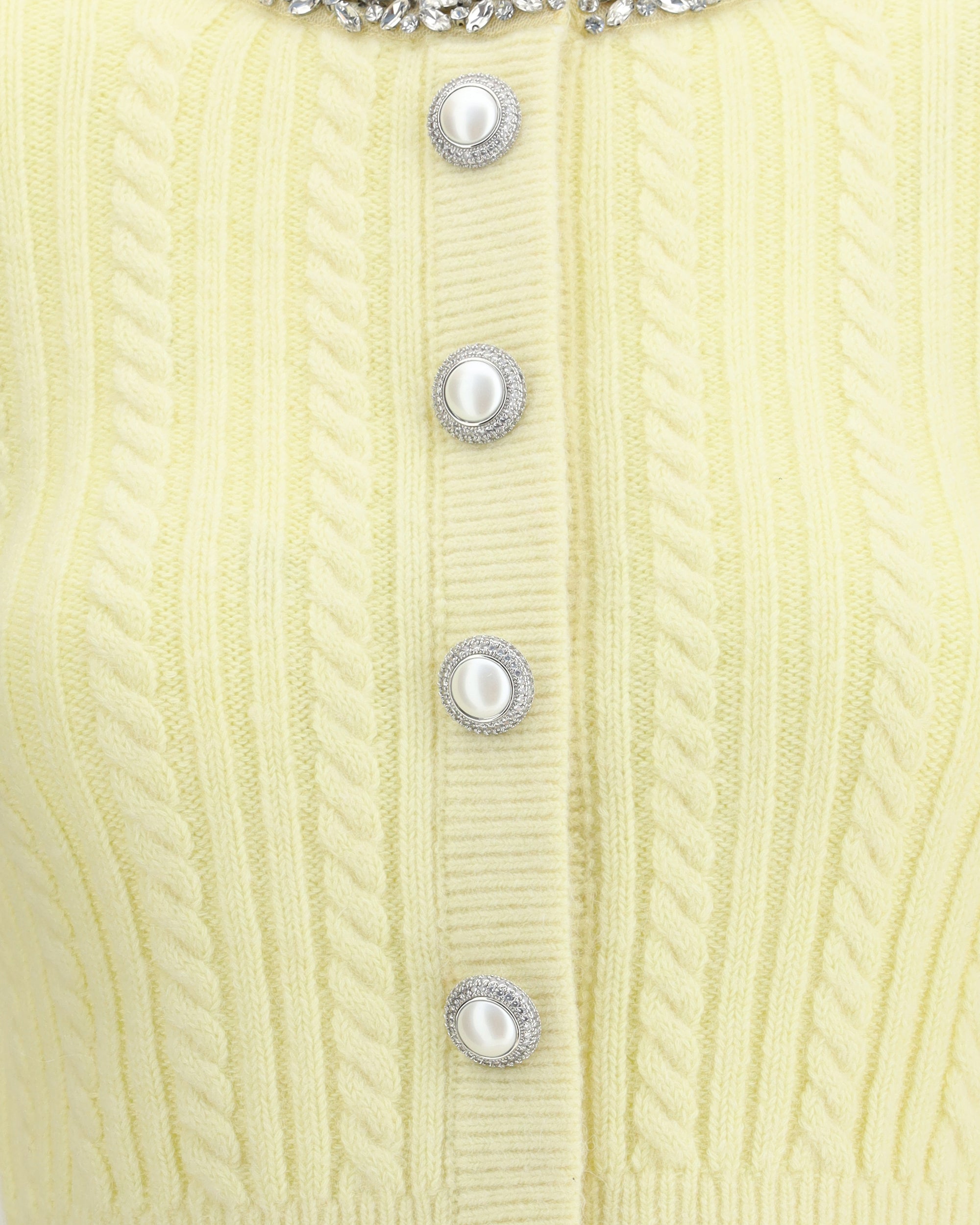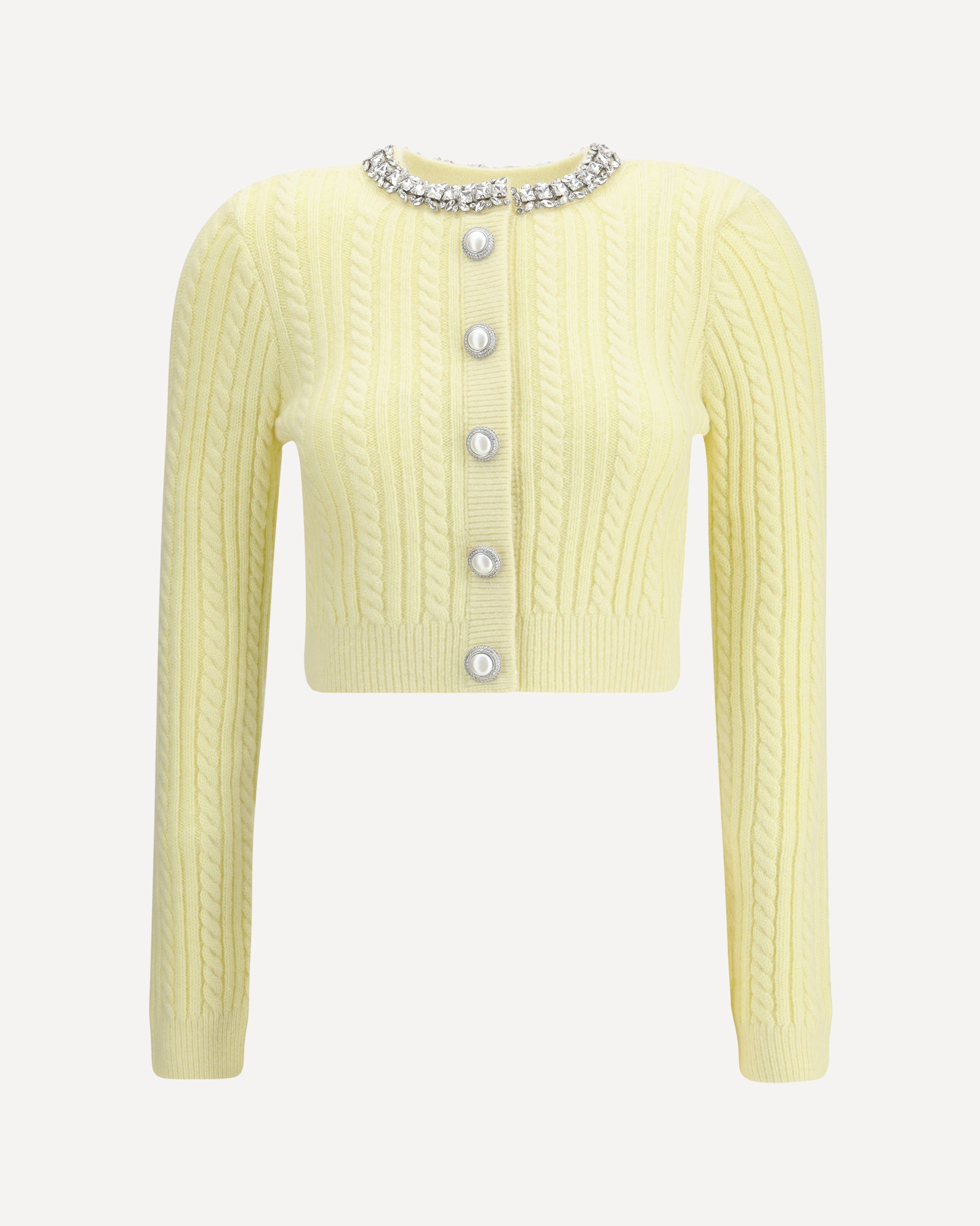Self-Portrait's short alpaca Cardigan is a feminine and bright piece perfect for adding an elegant touch to everyday wear. Made of stretch fabric, it offers comfort and softness, while woven knit details lend character to the compact silhouette. The front button closure is embellished with rhinestone and pearl appliqués, which add a sparkling effect. Decorative buttons complete the design with sophistication.