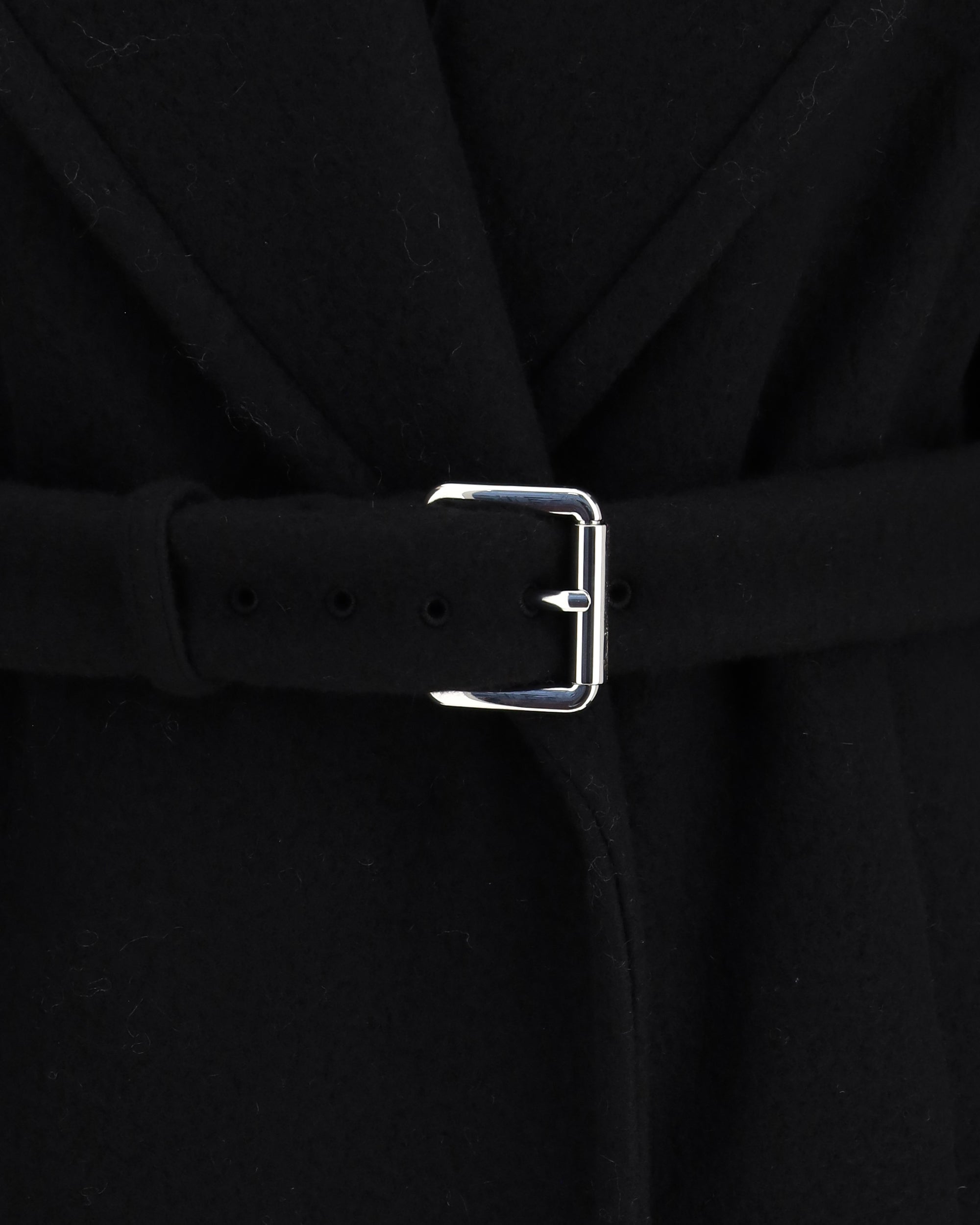 The Zebra Coat double-faced pure wool by Sportmax combines oversized proportions and tailored precision in a perfect balance of comfort and sophistication. Made from pure wool, it features a concealed button fastening and a metal-buckle belt that elegantly defines the waist. The side flap pockets and central back vent add practicality and movement, while the soft texture of the fabric lends the piece a refined and timeless allure.