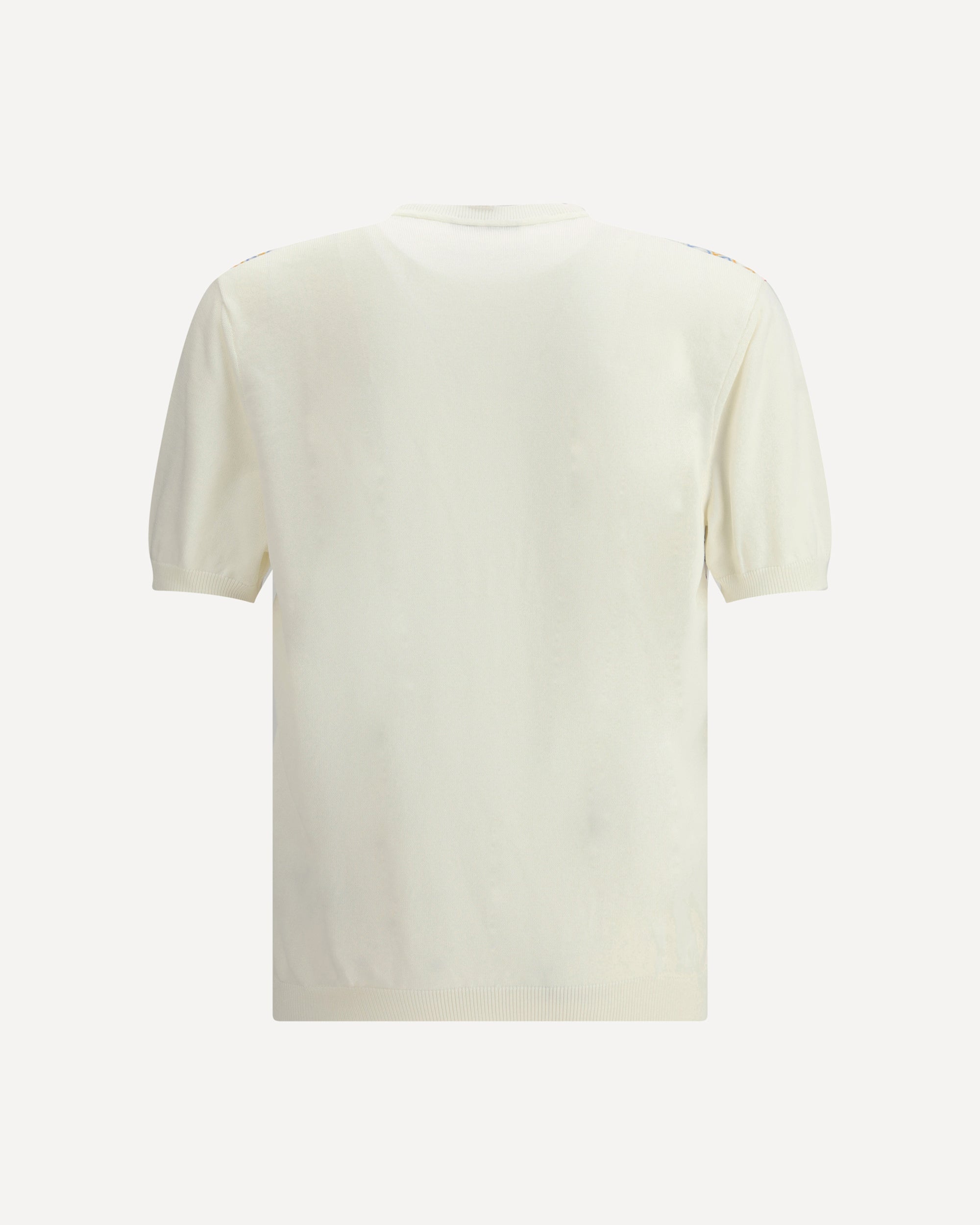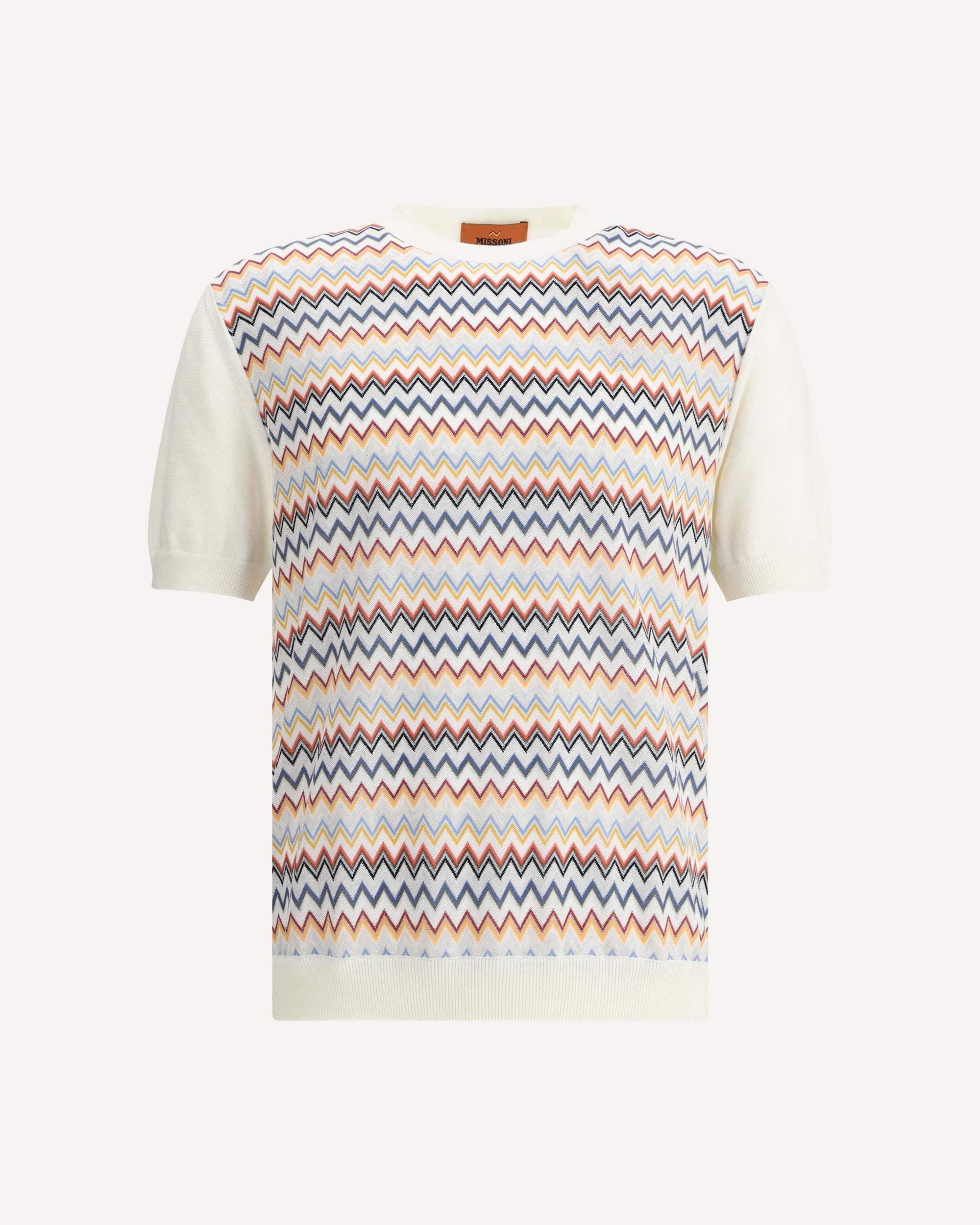 Missoni's knit T-Shirt combines comfort and style with its refined workmanship. The ribbed crew neck and hems lend structure to the garment, while the ZigZag pattern on the front panel adds a distinctive and dynamic touch, an authentic expression of the Missoni aesthetic.