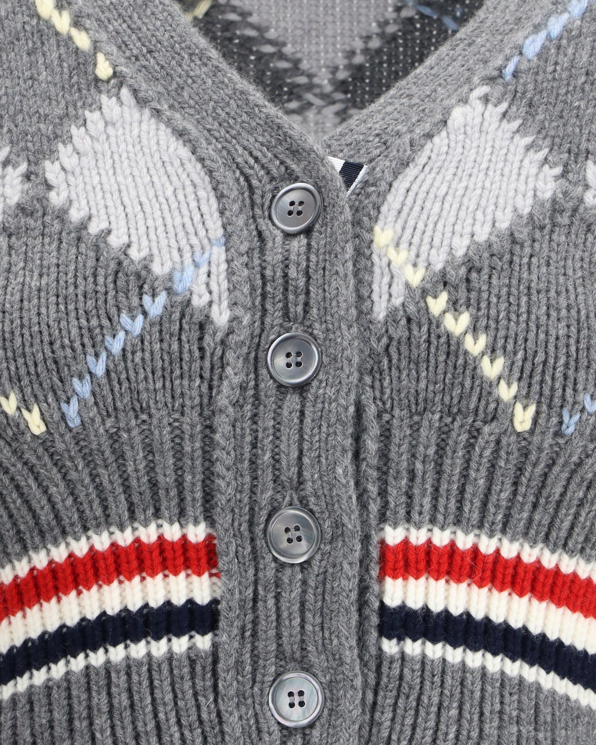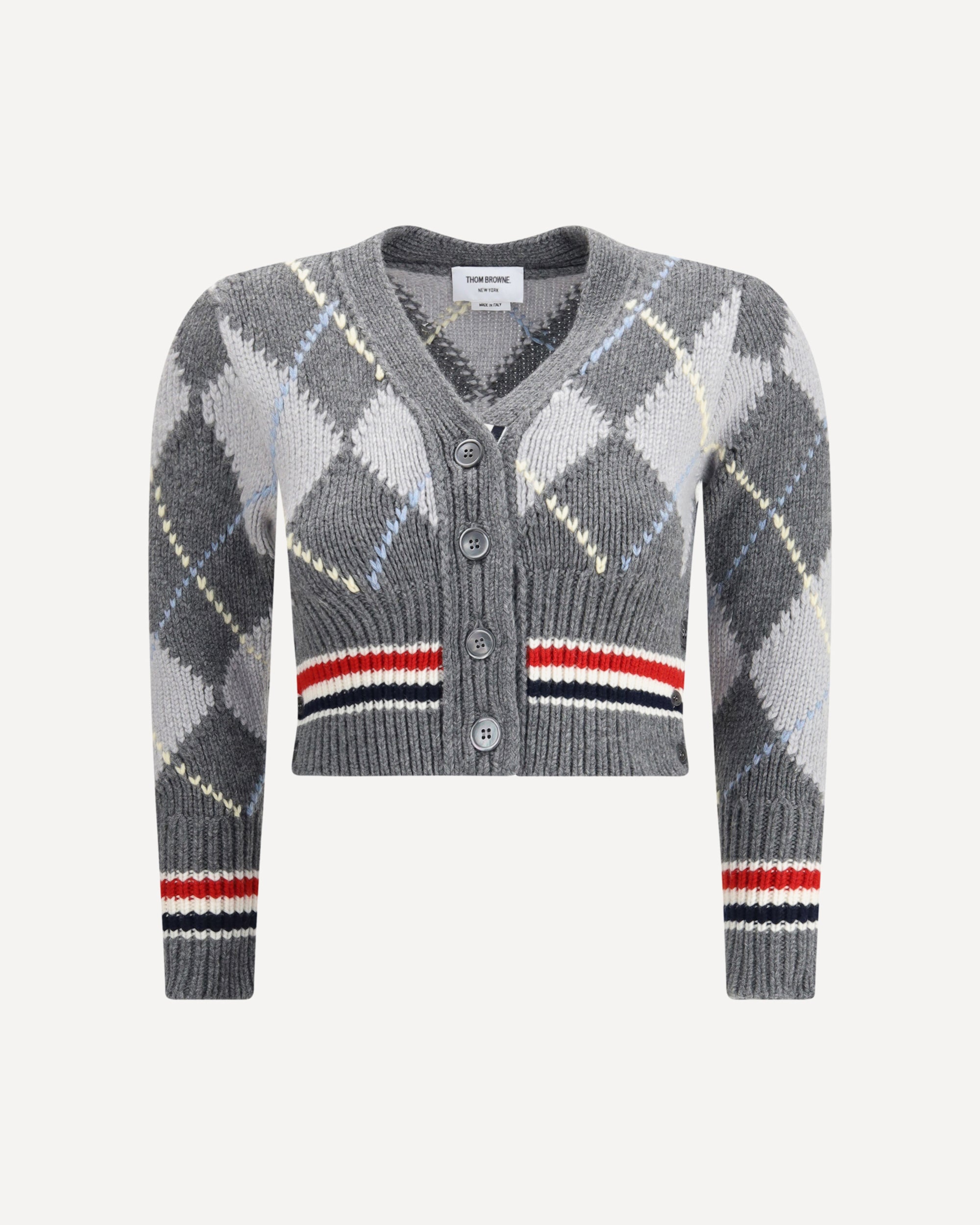 Il Cardigan Argyle con scollo a V di Thom Browne è realizzato in morbida lana merino e arricchito dall’iconico motivo a rombi che dona al capo un’eleganza senza tempo. Con la sua linea corta e moderna, è caratterizzato da scollo a V, maniche lunghe e chiusura frontale con bottoni. Un equilibrio perfetto tra classicismo sartoriale e stile contemporaneo, ideale per completare look quotidiani con un tocco sofisticato.