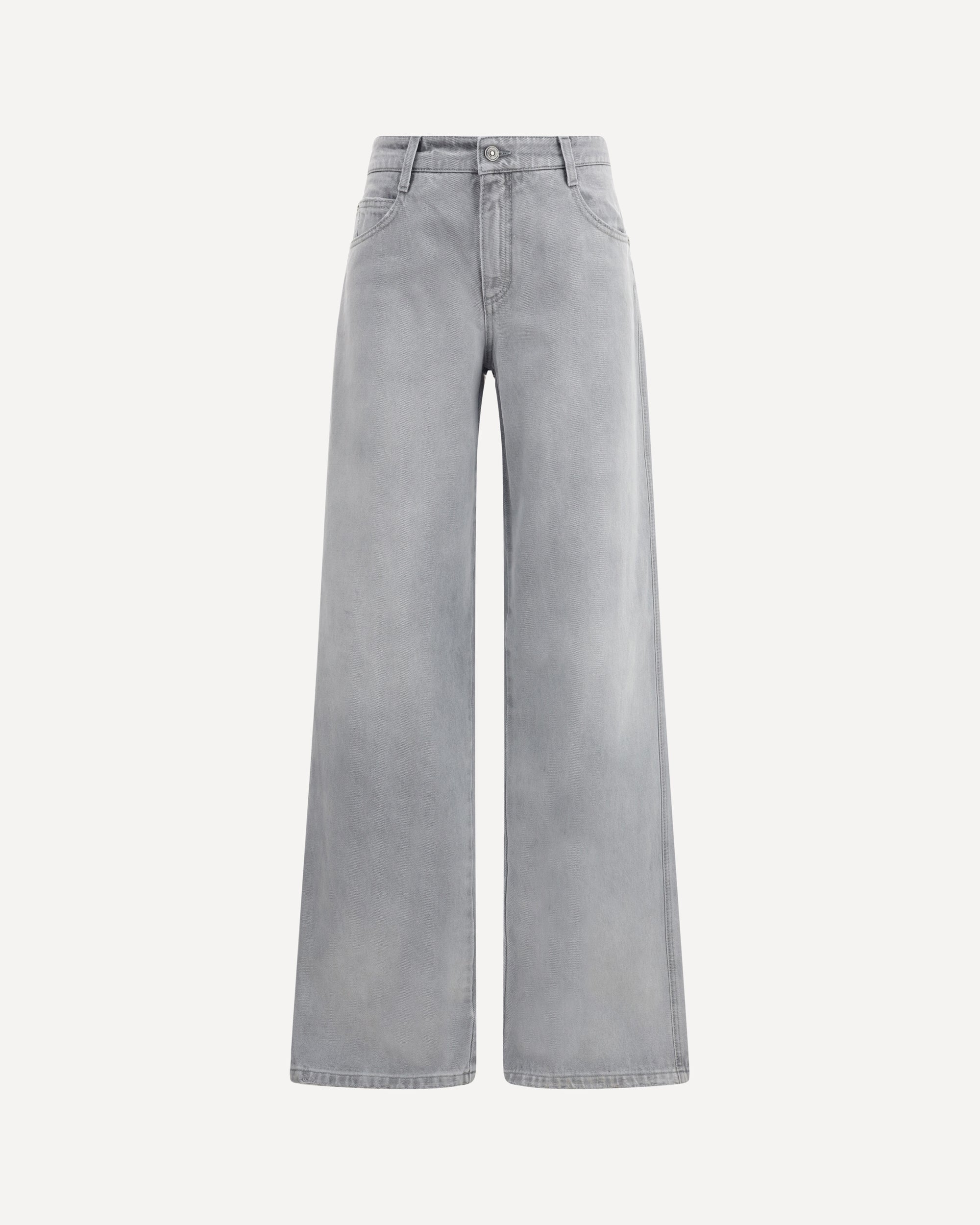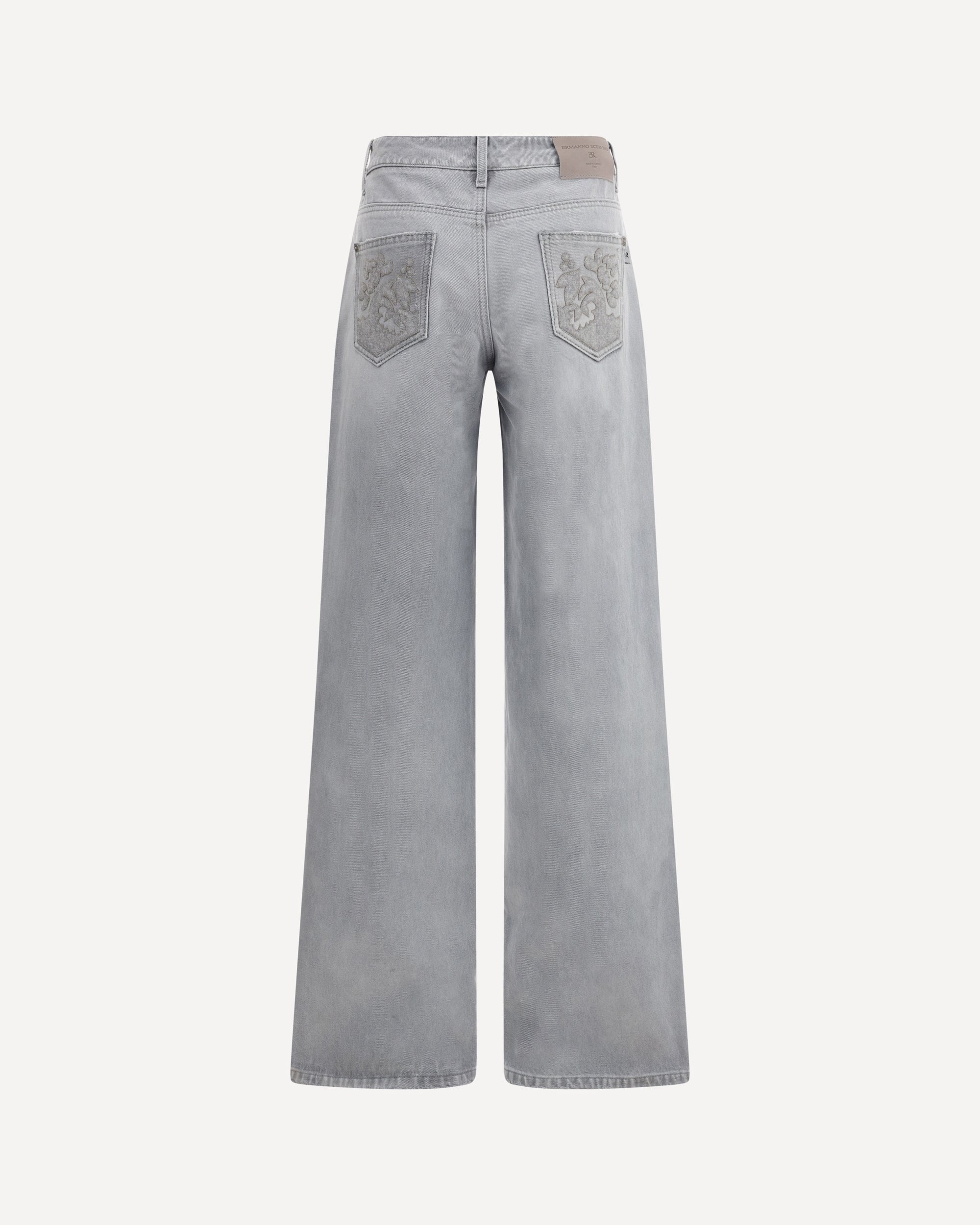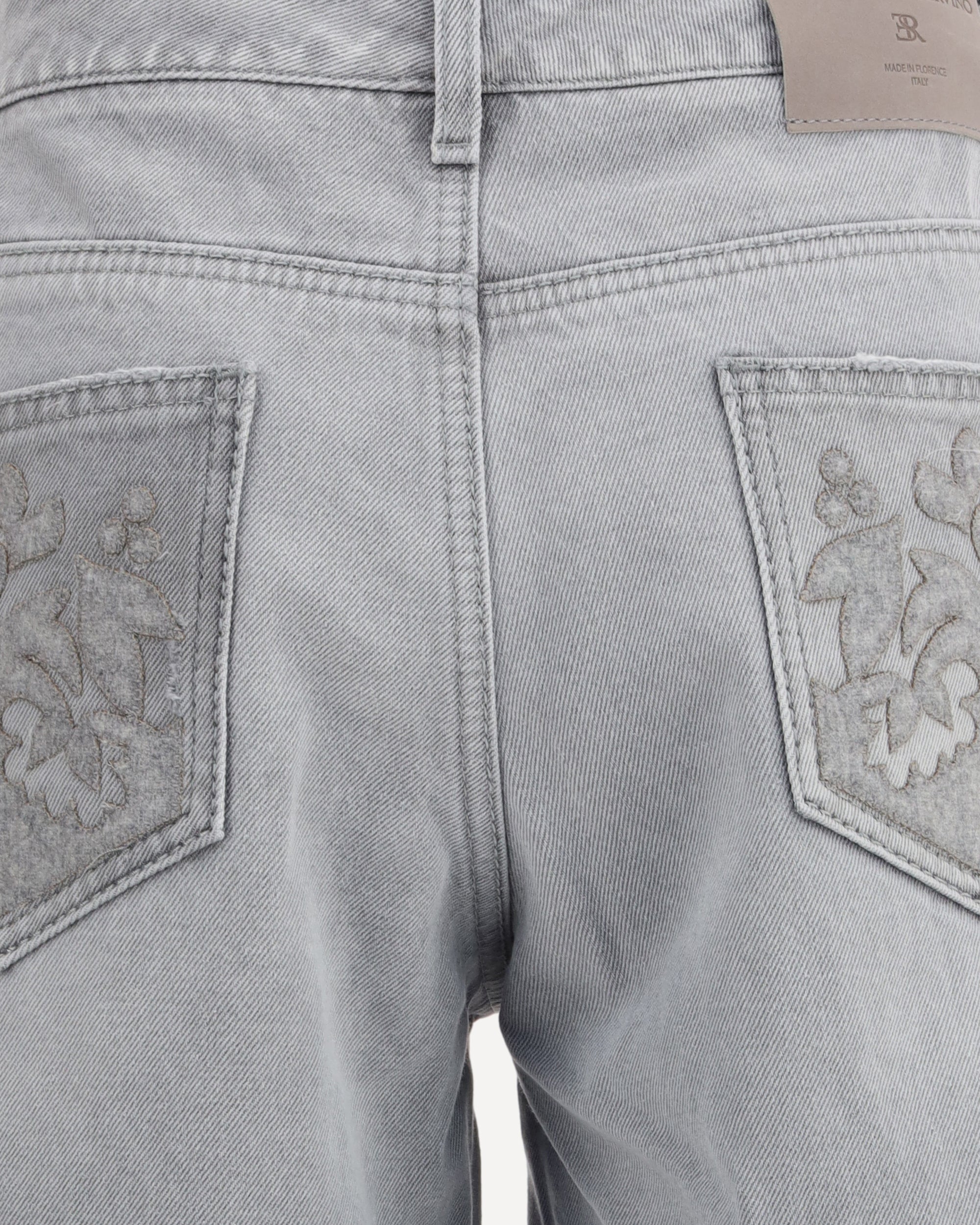 I Jeans wide leg di Ermanno Scervino, realizzati in denim di cotone grigio slavato, uniscono stile urbano e dettagli sartoriali. Dotati di passanti per cintura, chiusura con bottone e zip, presentano la classica costruzione a cinque tasche, arricchita da ricami sulle tasche posteriori e dall’etichetta in pelle con logo sul retro. Il taglio ampio e la vestibilità baggy conferiscono al capo un’attitudine moderna e rilassata.