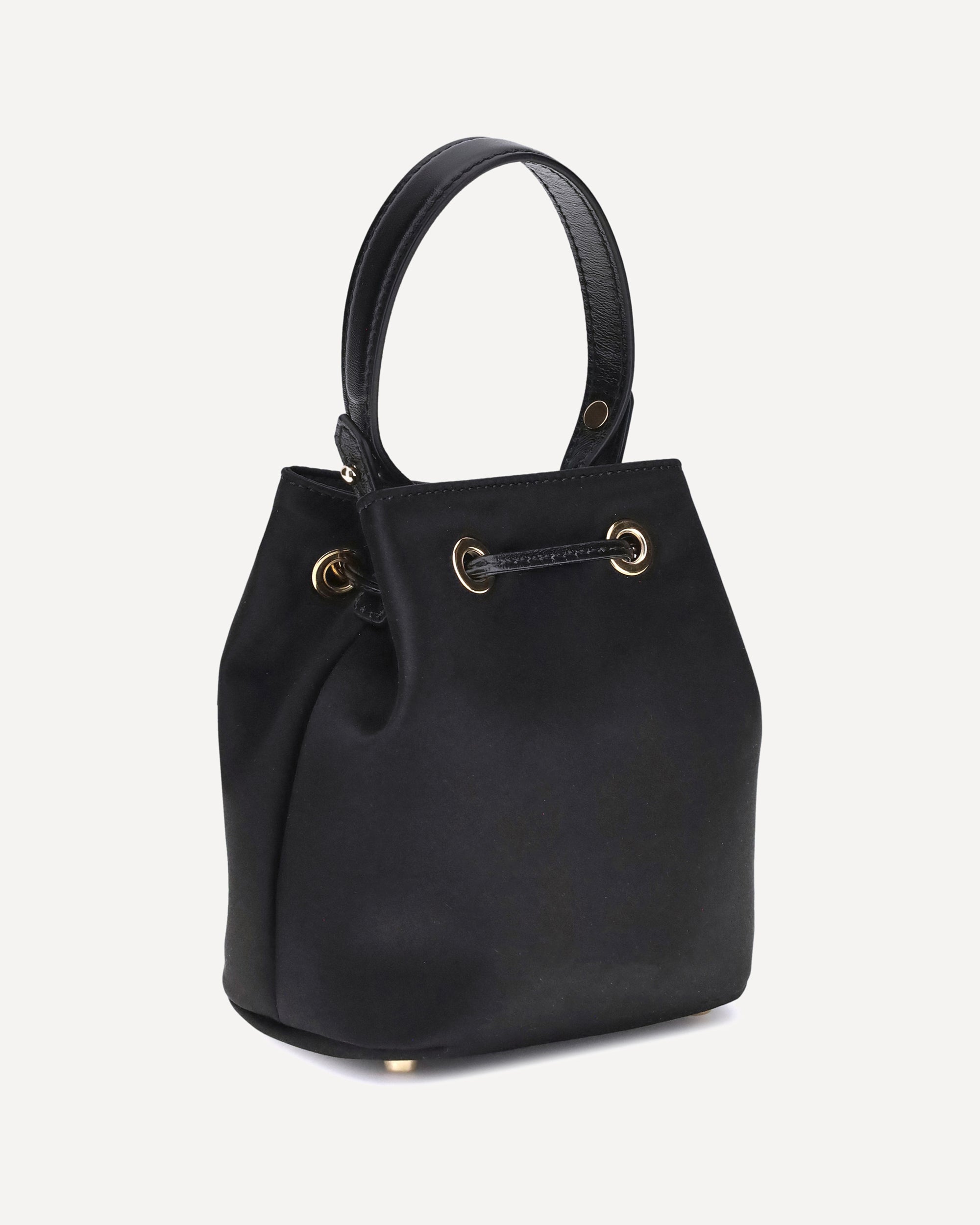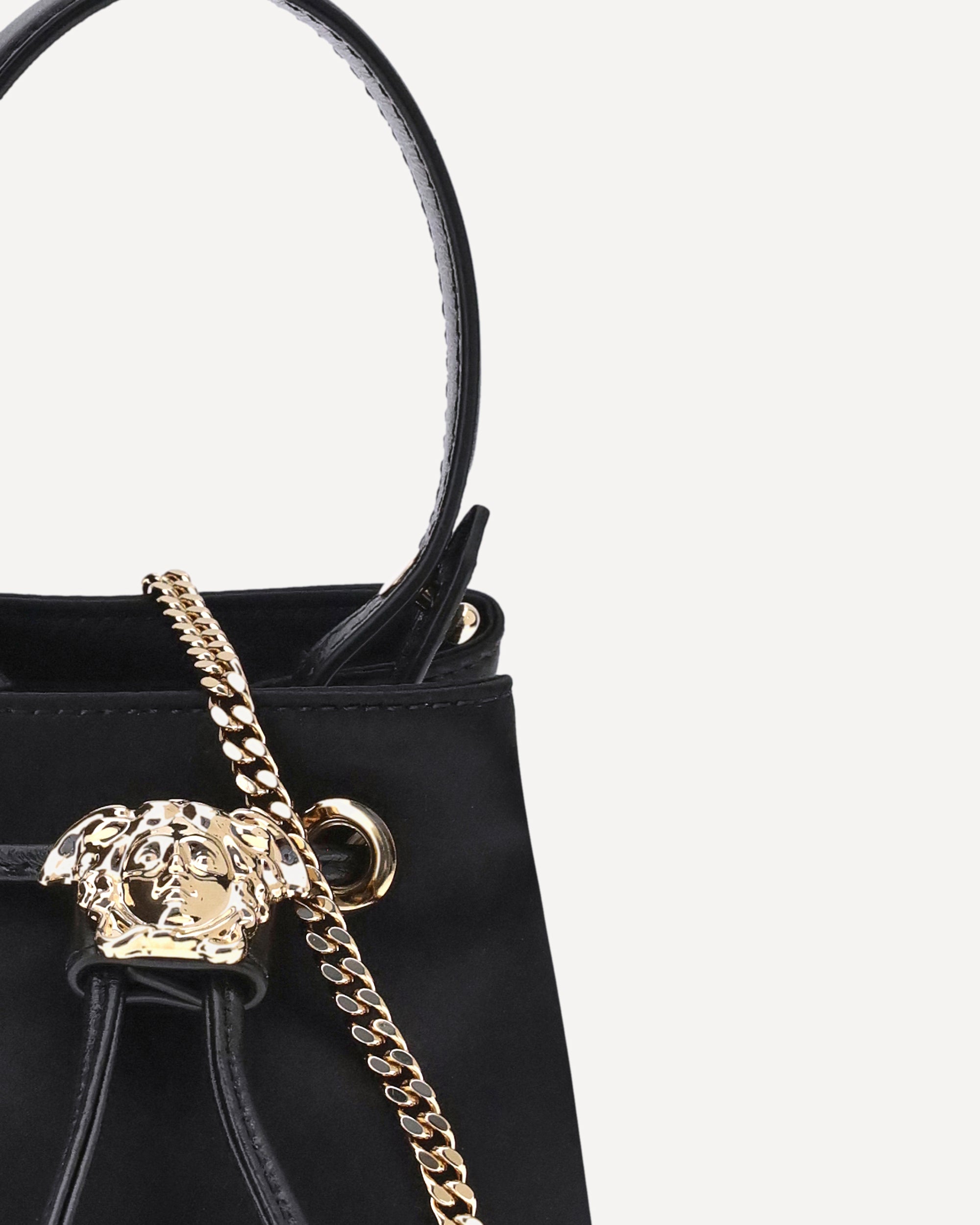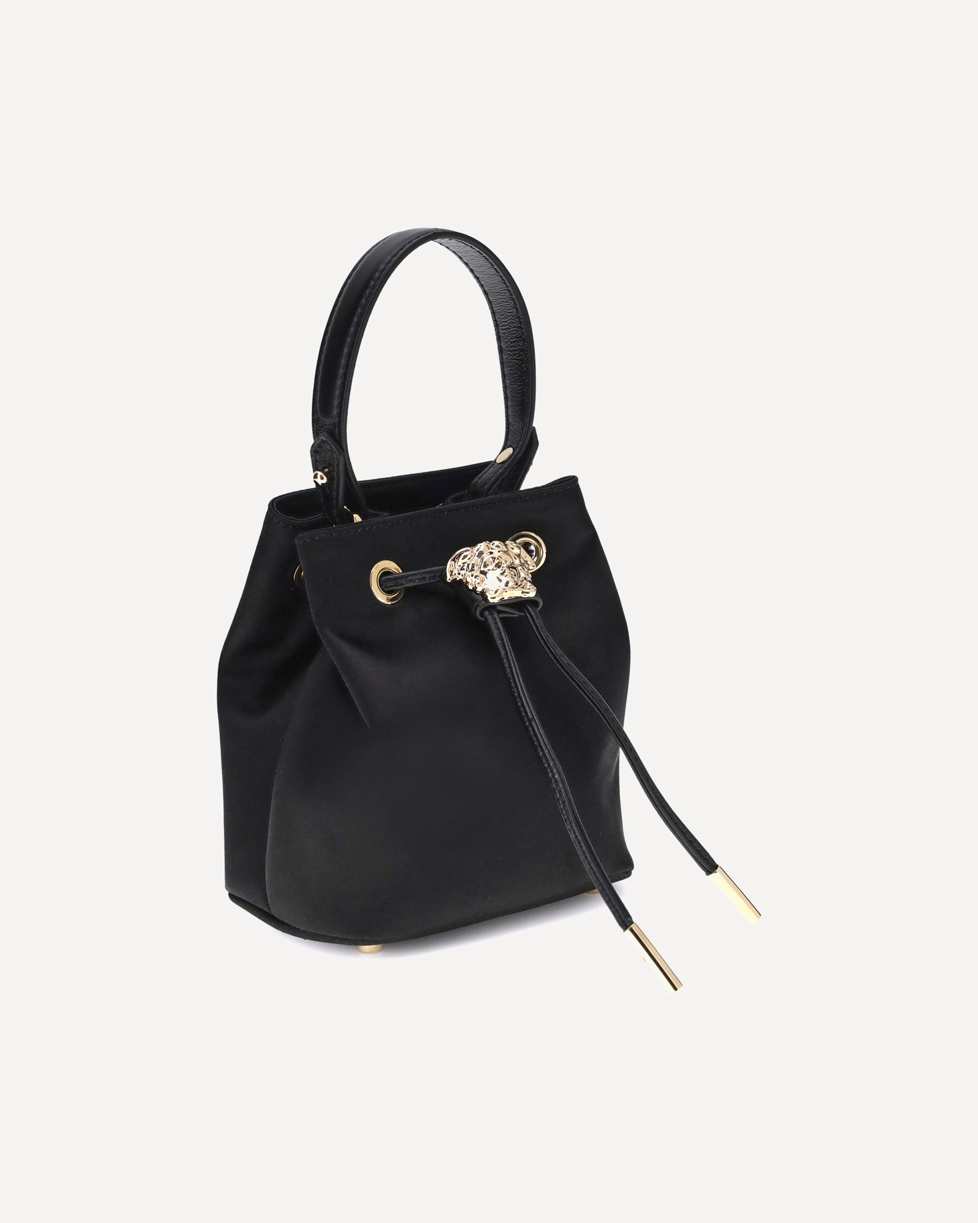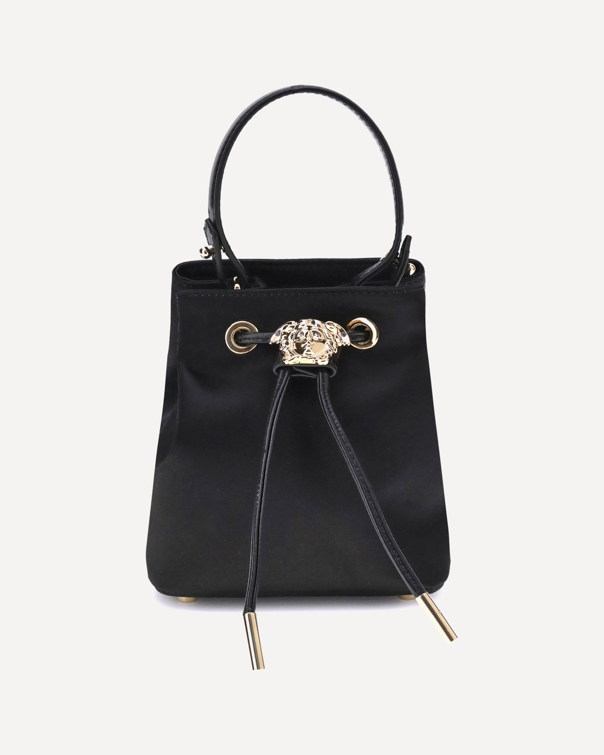 La Borsa a Secchiello La Medusa di Versace, realizzata in raso con finitura satinata brillante, è un accessorio elegante e distintivo. Caratterizzata dall’iconico emblema tridimensionale sulla chiusura con coulisse in pelle, è dotata di un manico rimovibile e di una tracolla a catena anch’essa removibile, che permette di indossarla comodamente a tracolla per un look versatile e raffinato.