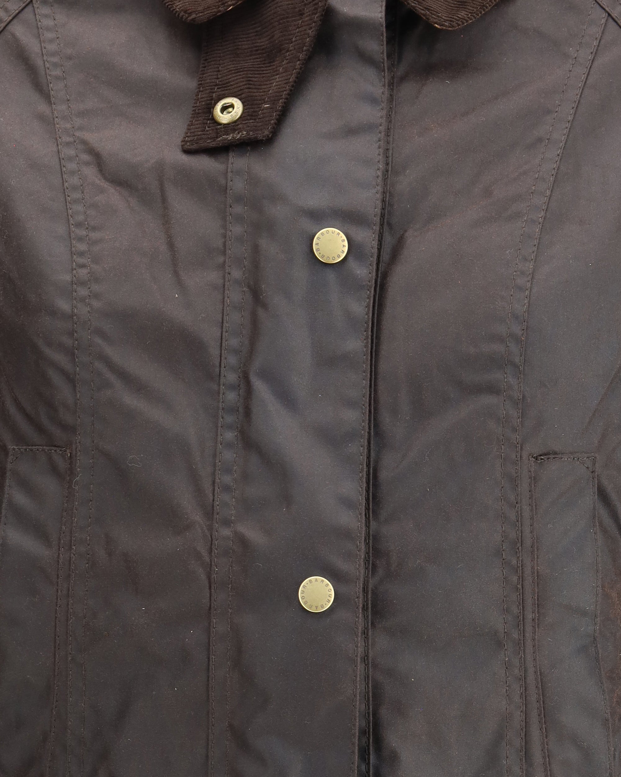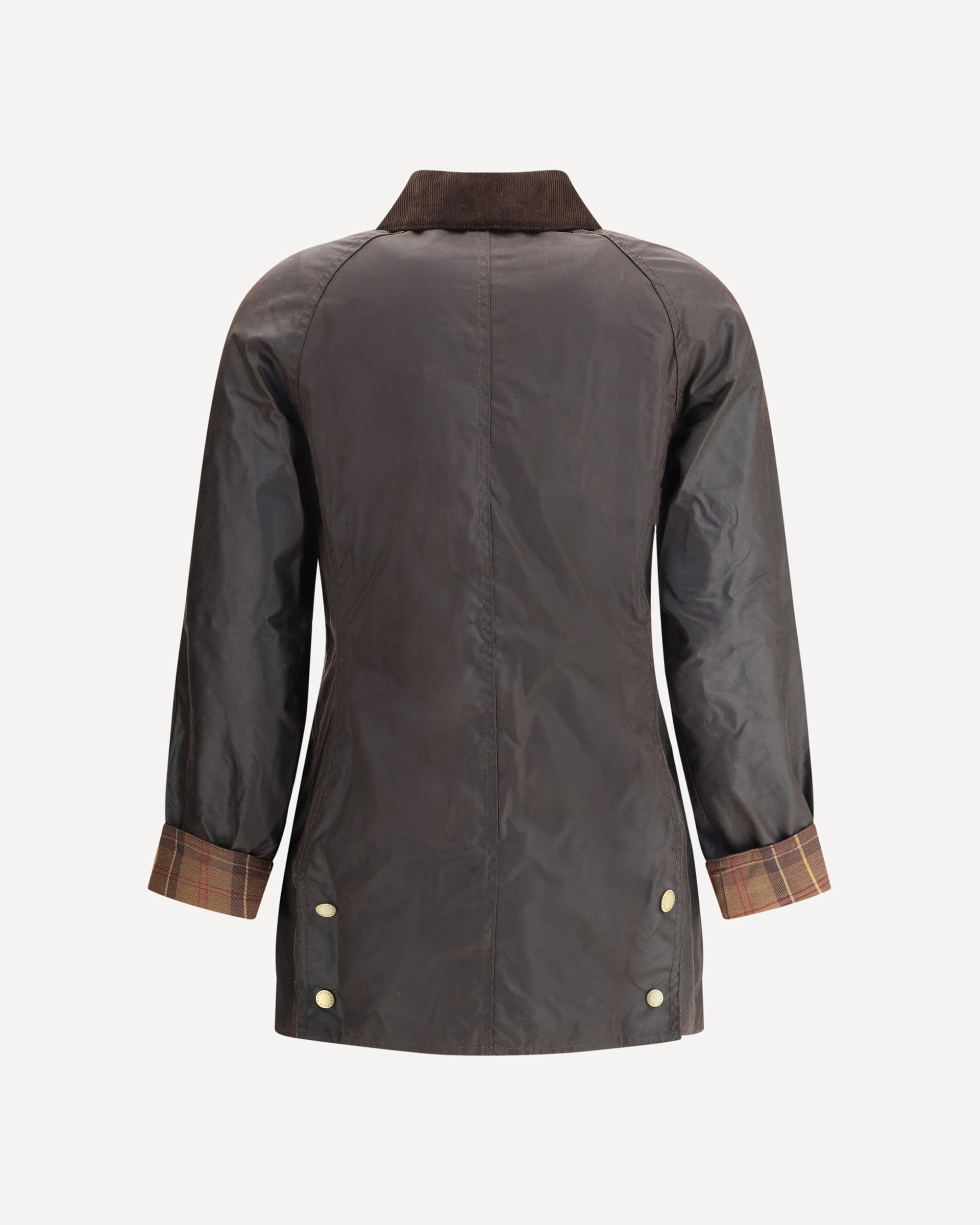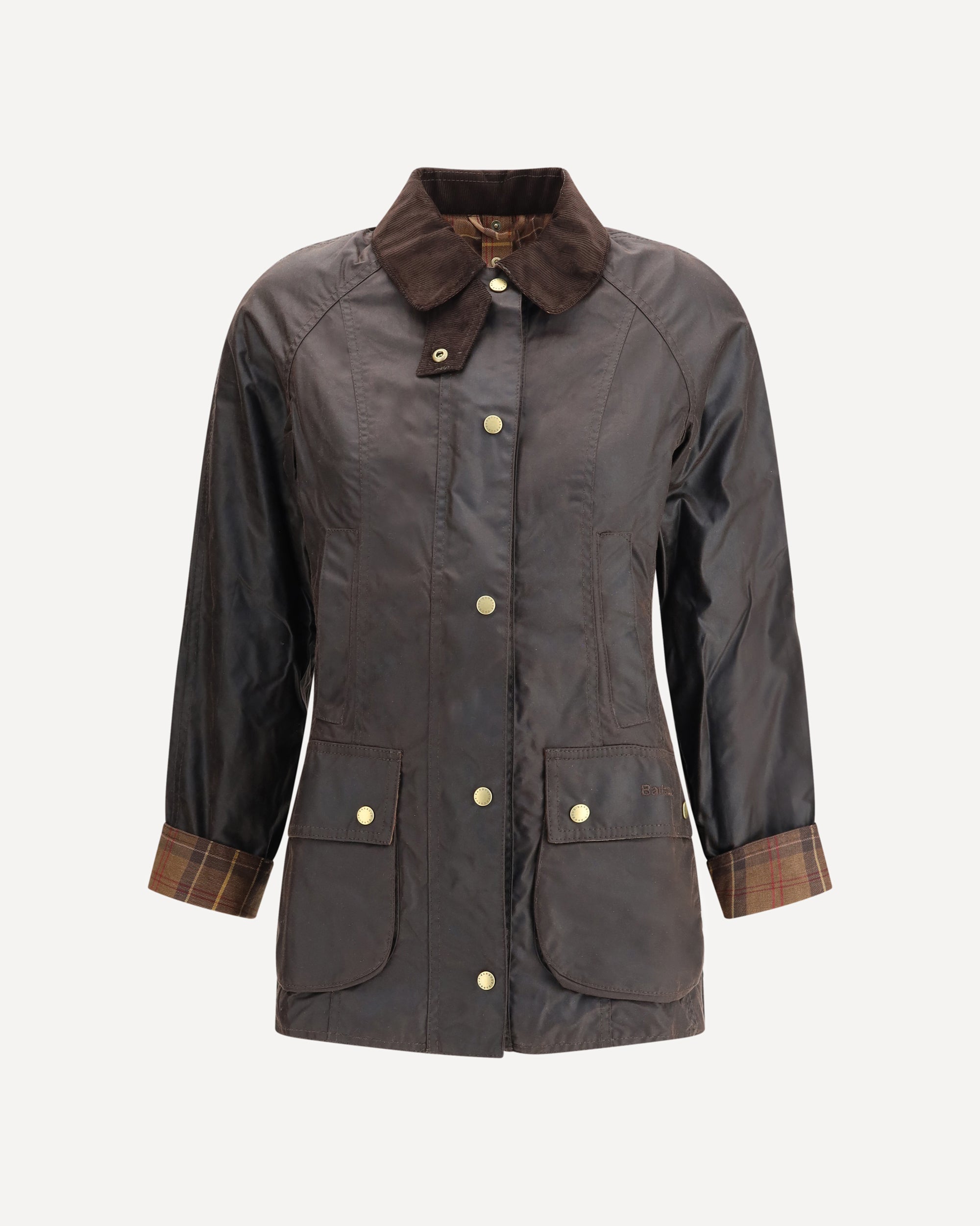 Giacca cerata Breadnell di Barbour, chiusura frontale con cerniera e bottoni a pressione nascosti, colletto classico a costine, due tasche applicate con pattina per chiusura sui fianchi, fodera interna con fantasia tartan, iconico monogramma brand ricamato tono su tono sulla pattina di una tasca, due spacchi regolabili con bottoni a pressione sul retro, vestibilità regular.