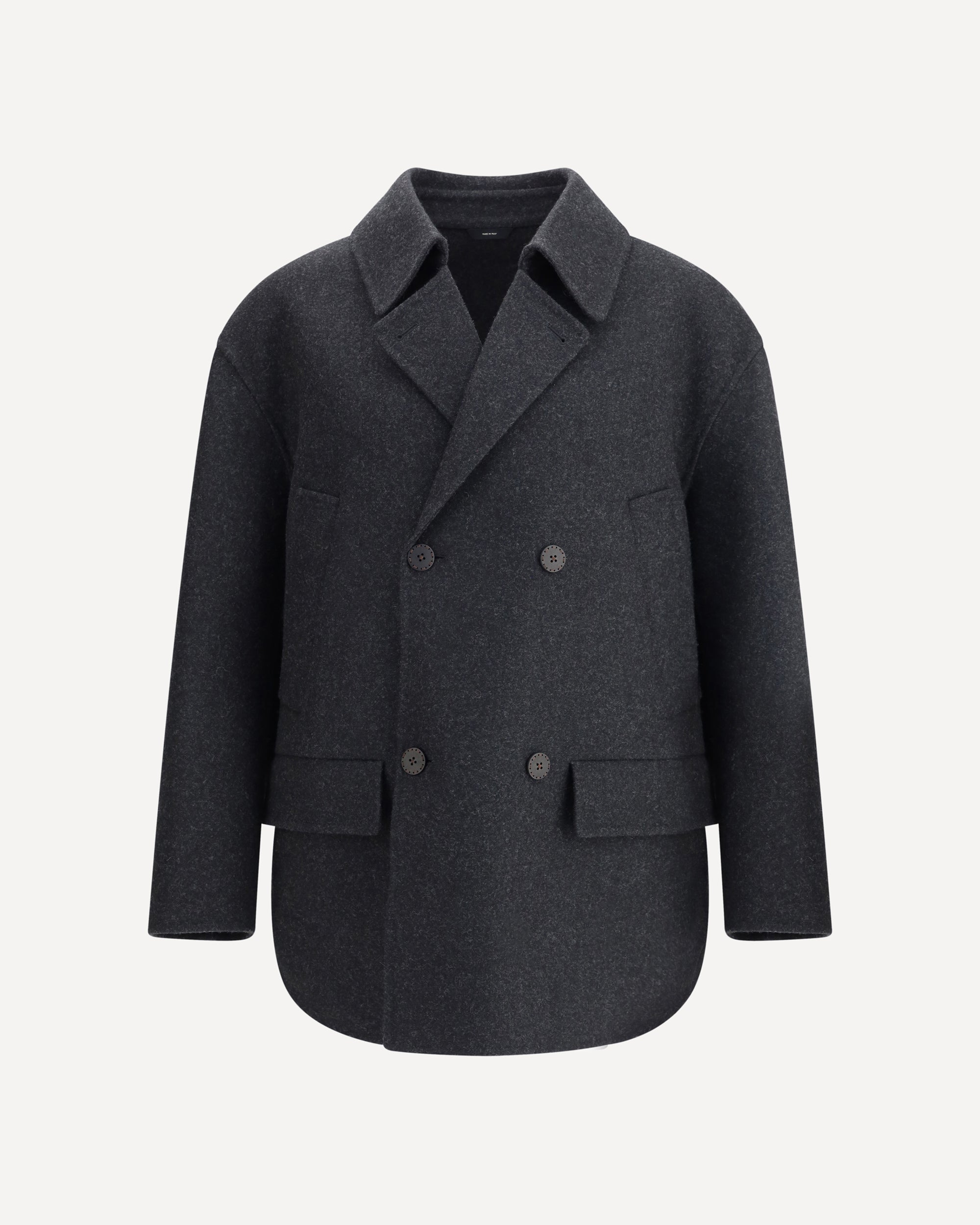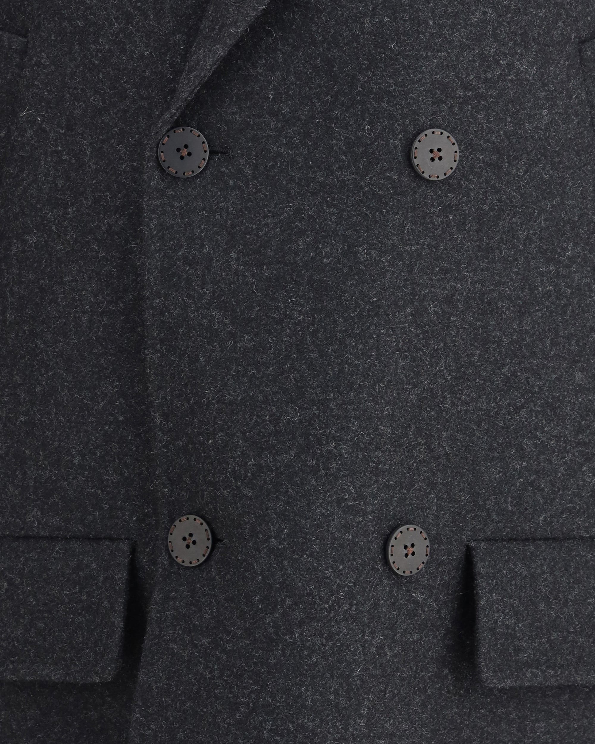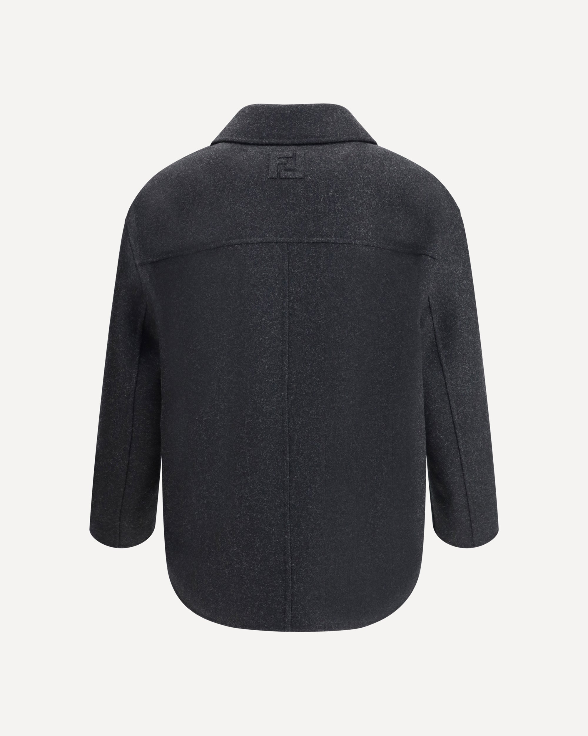 Il Caban doppiopetto in feltro di Lana double mélange di Fendi reinterpreta un classico dell’outerwear con eleganza disinvolta. Il colletto a camicia e le maniche lunghe con spalla scesa ne definiscono la silhouette morbida e contemporanea, mentre le tasche scaldamani a filetto e le tasche con patta frontale uniscono funzionalità e stile. La costruzione sfoderata esalta la purezza del tessuto, rivelando la qualità artigianale e il carattere senza tempo della Maison.