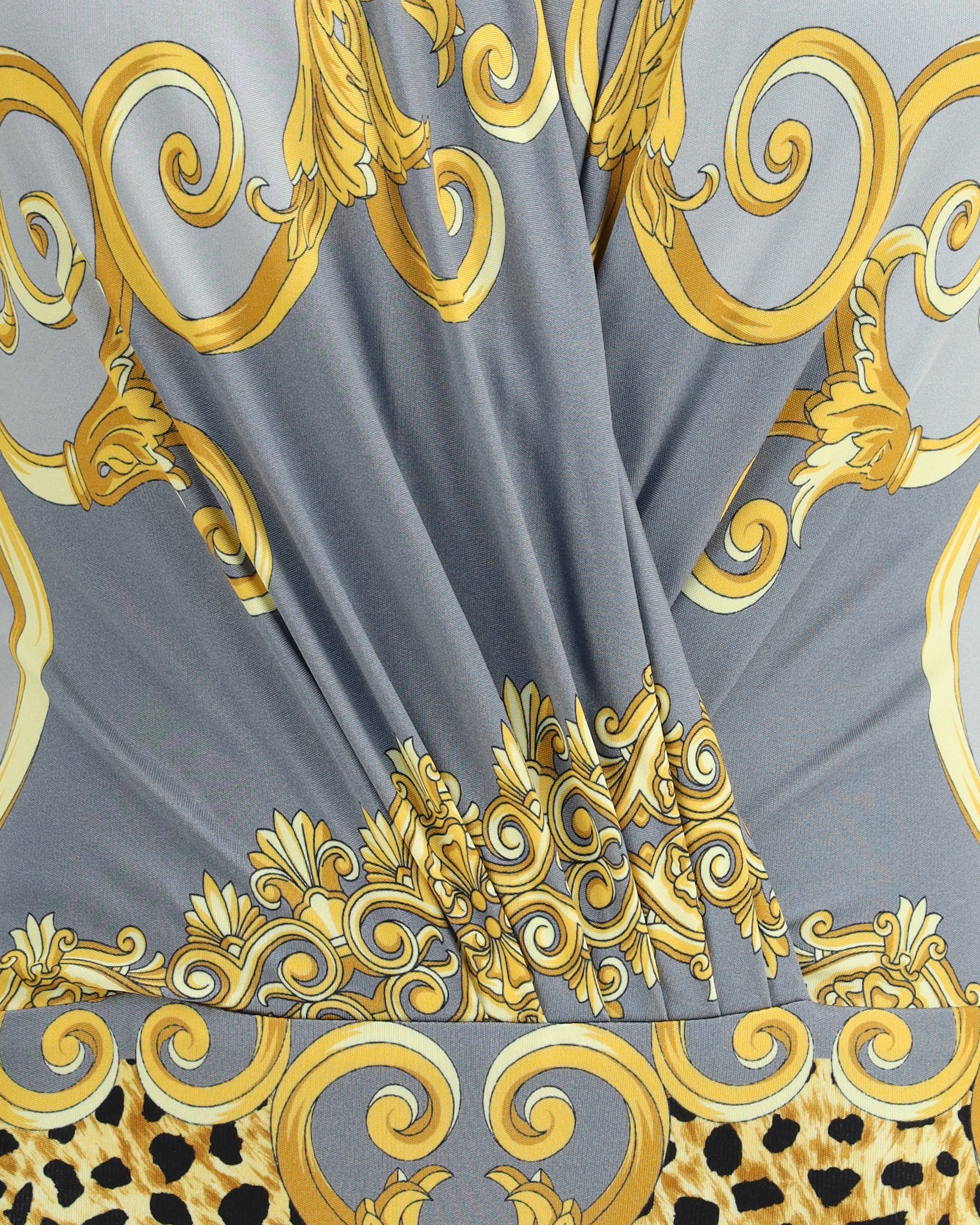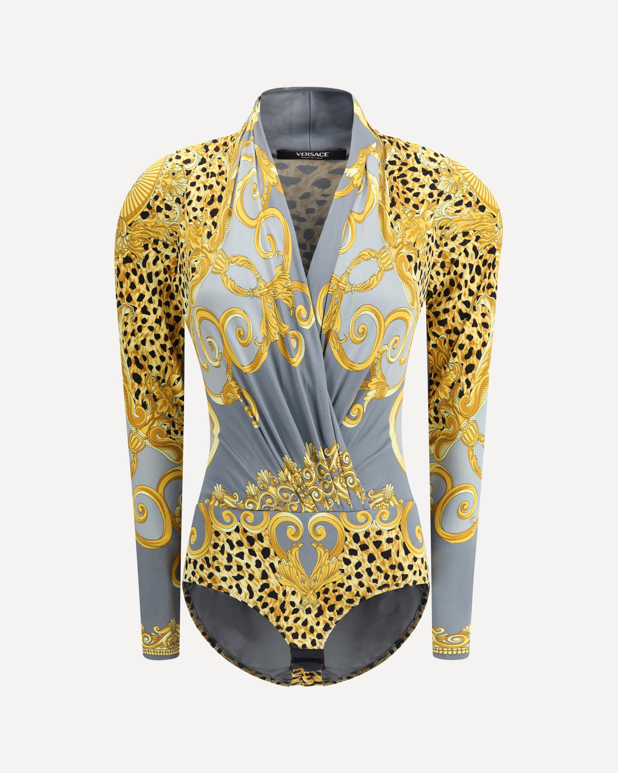 Il Body drappeggiato leopardato di Versace è un capo audace e sensuale, realizzato in morbido jersey con stampa Cheetah Foulard e motivi Barocco. Caratterizzato da maniche lunghe e una profonda scollatura a V drappeggiata, presenta una chiusura con gancetti che garantisce una vestibilità impeccabile e femminile.