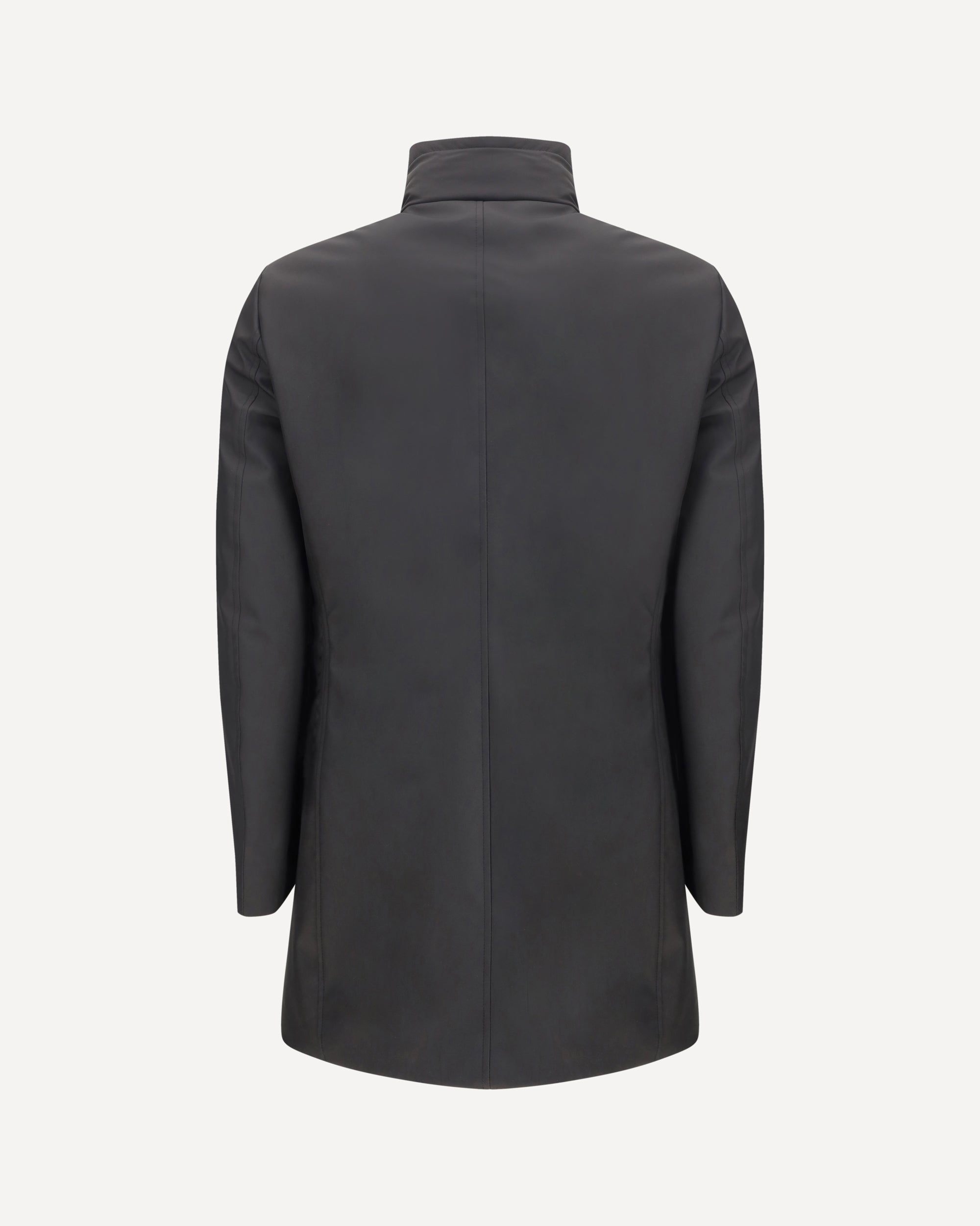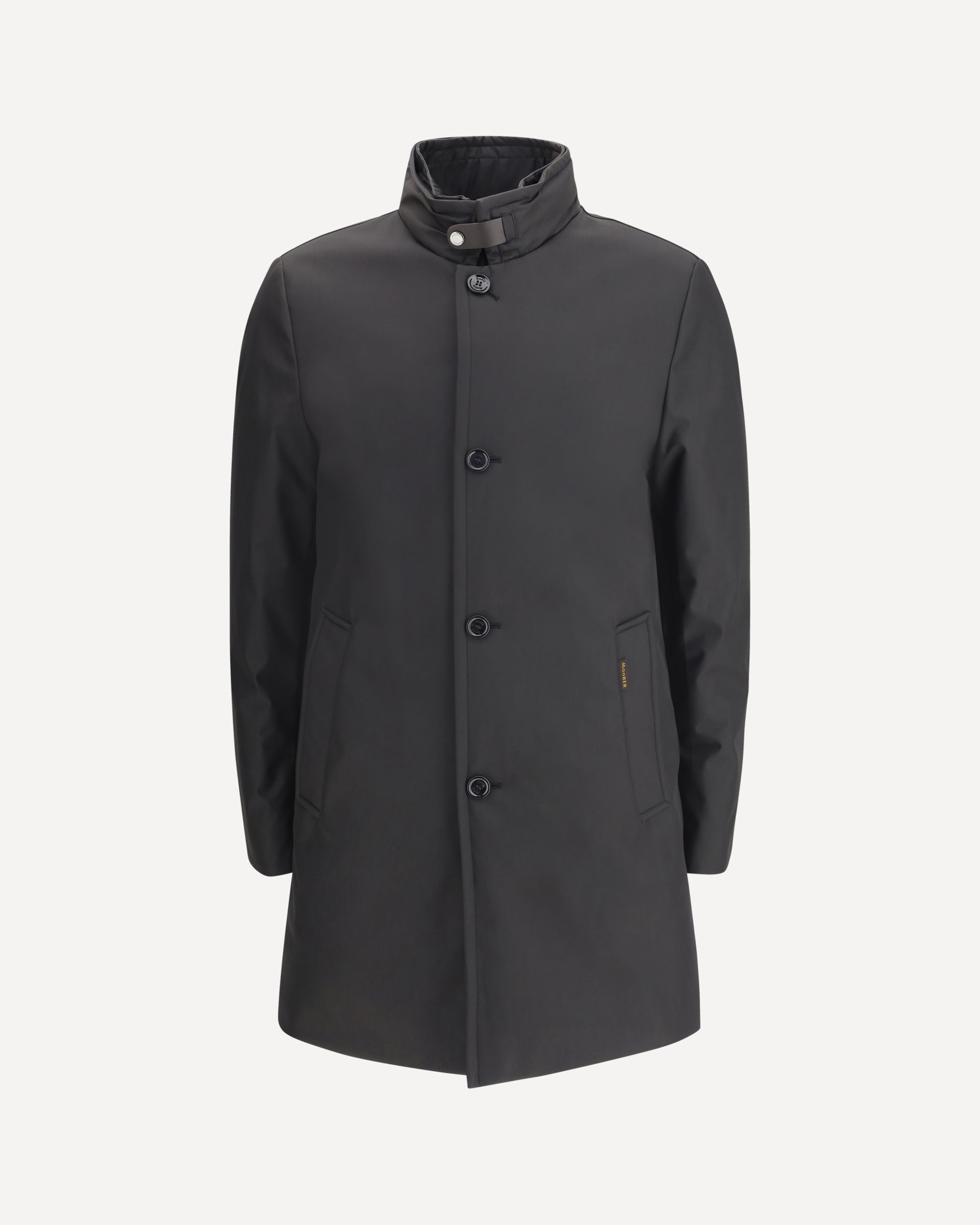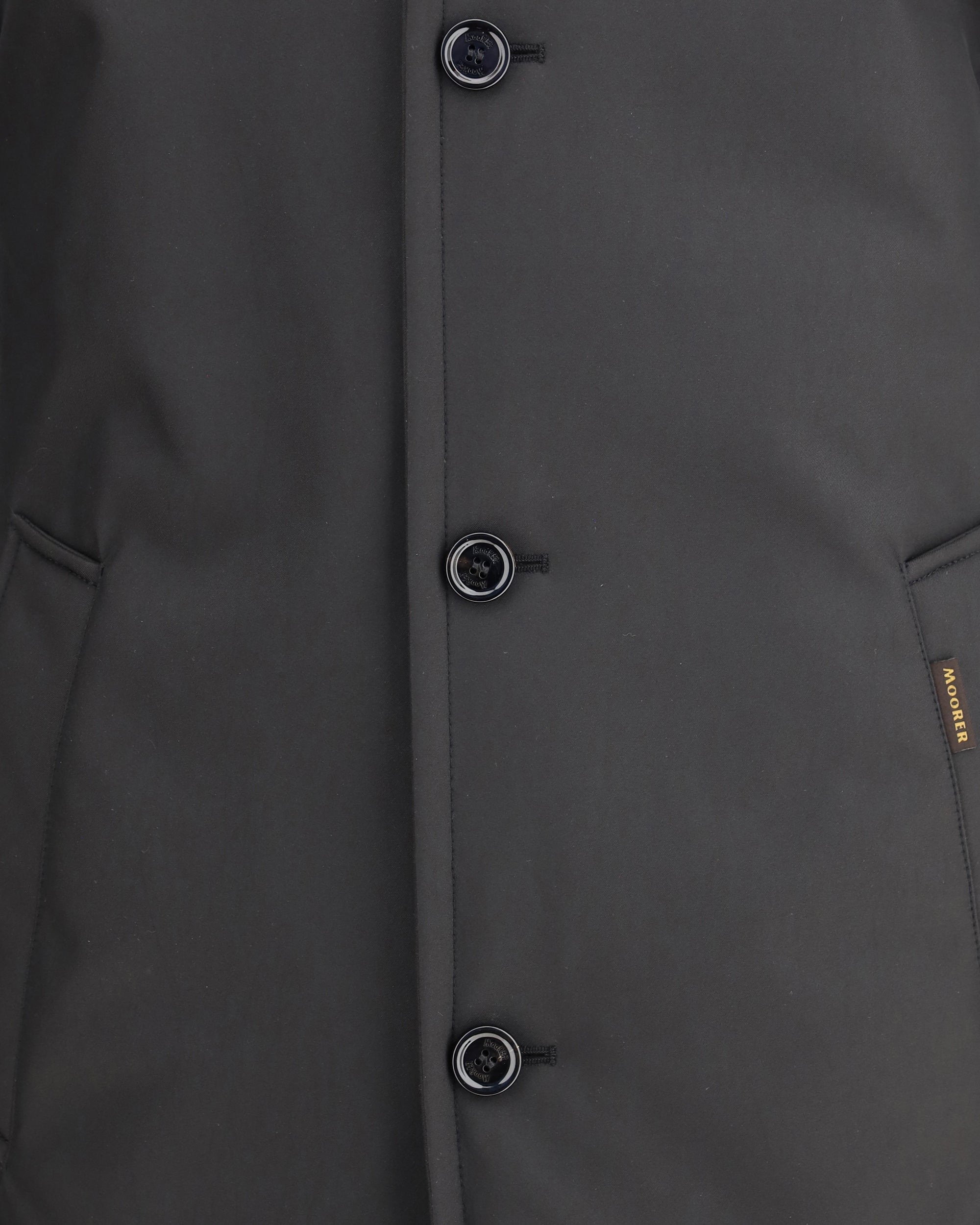 Il Piumino Bond-Wi di Moorer è un giubbotto monopetto tecnico e funzionale. Realizzato in tessuto a 3 strati antivento e idrorepellente, è imbottito con piuma per garantire calore leggero. Il collo montante a fascia si chiude con un elegante alamaro in pelle e bottone a pressione. La doppia chiusura frontale combina bottoni in corno e zip per massima protezione. Le tasche laterali a pistagna sono dotate di una zip metallica nascosta, unendo praticità e design raffinato.