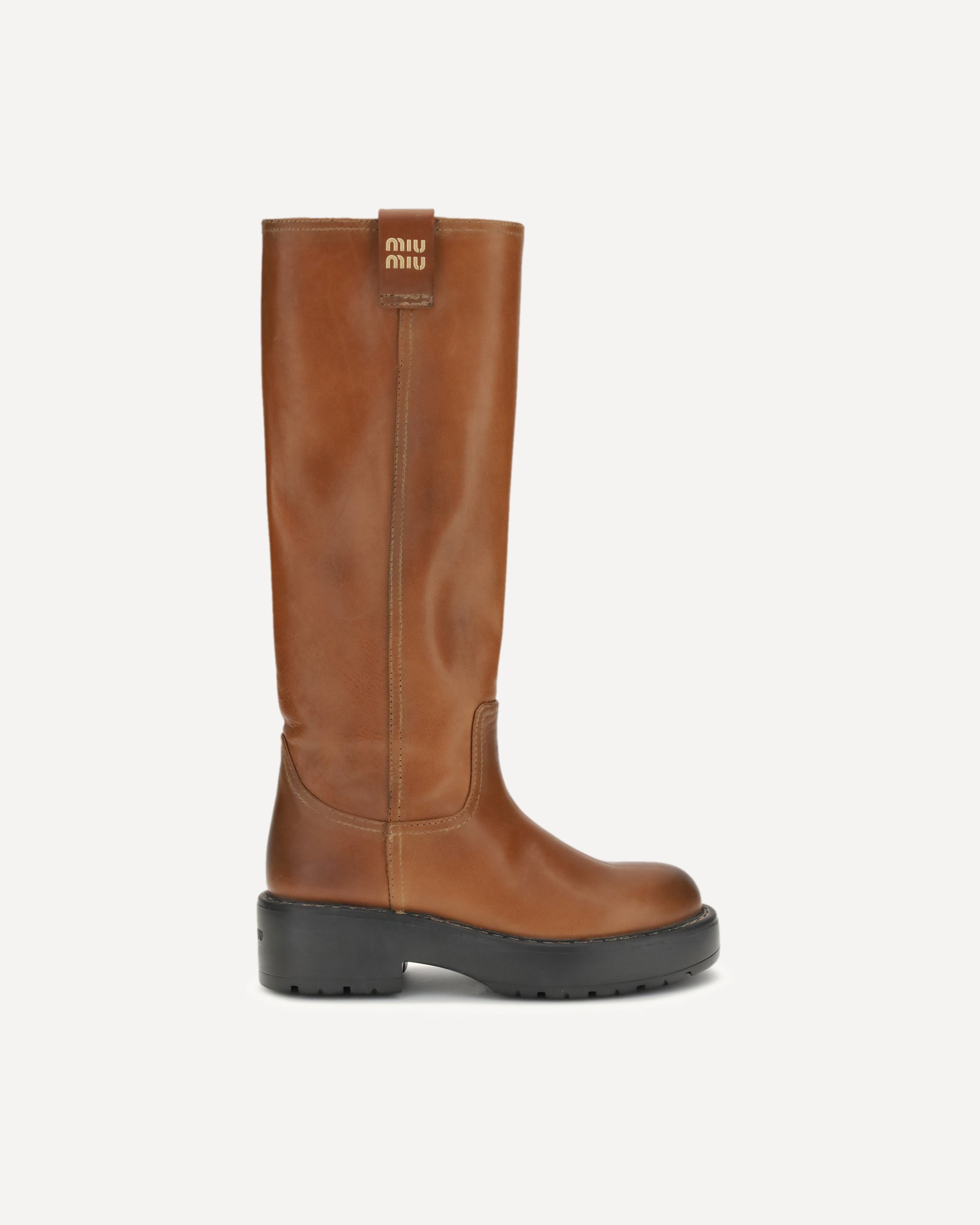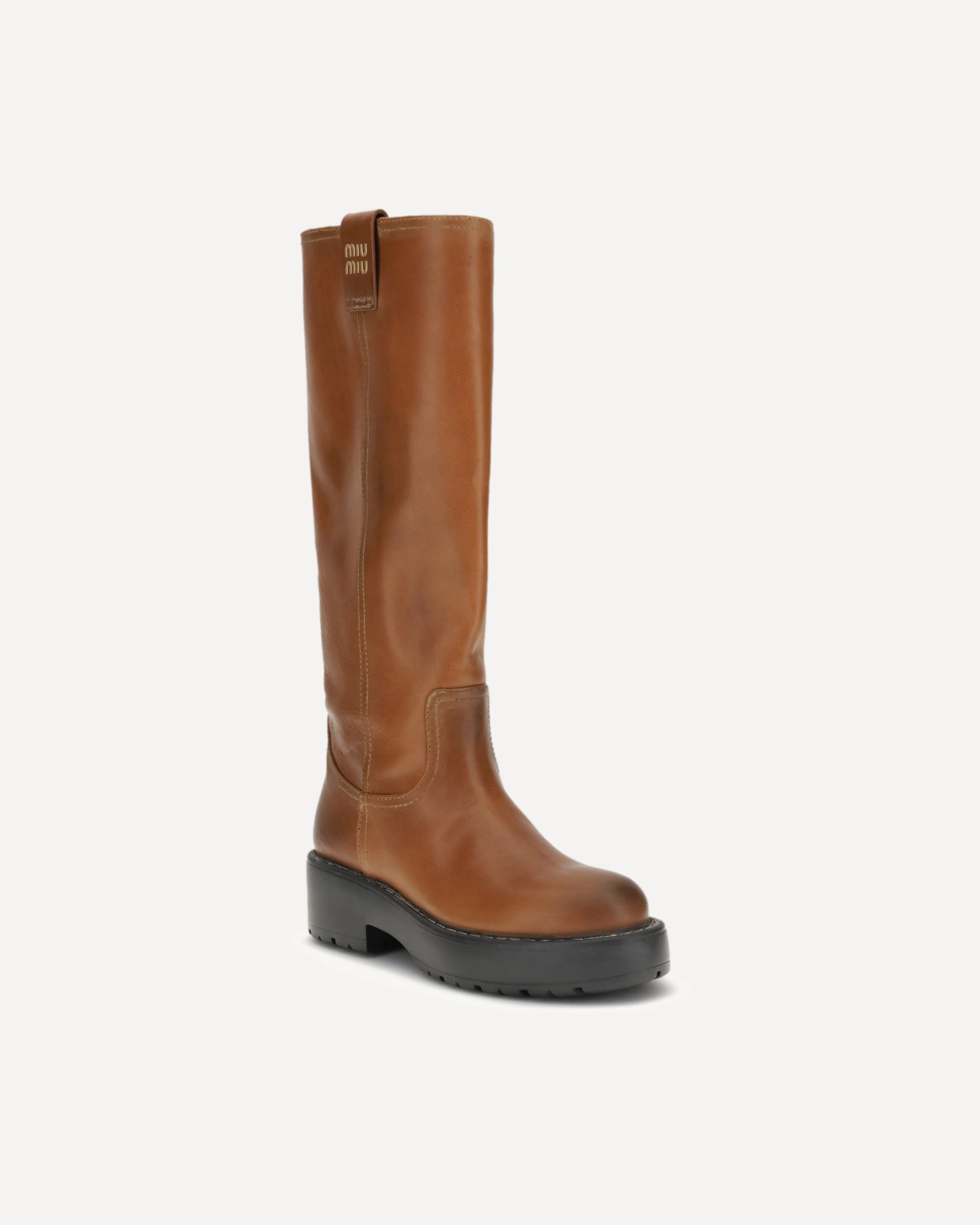 Gli Stivali in pelle di Miu Miu sono realizzati in pelle liscia di alta qualità e si distinguono per il loro design essenziale ma sofisticato. Presentano una linguetta con logo sulla parte anteriore e una doppia linguetta che ne facilita la calzata, aggiungendo un tocco distintivo allo stile. Un modello versatile e contemporaneo, perfetto per completare look urbani e raffinati.