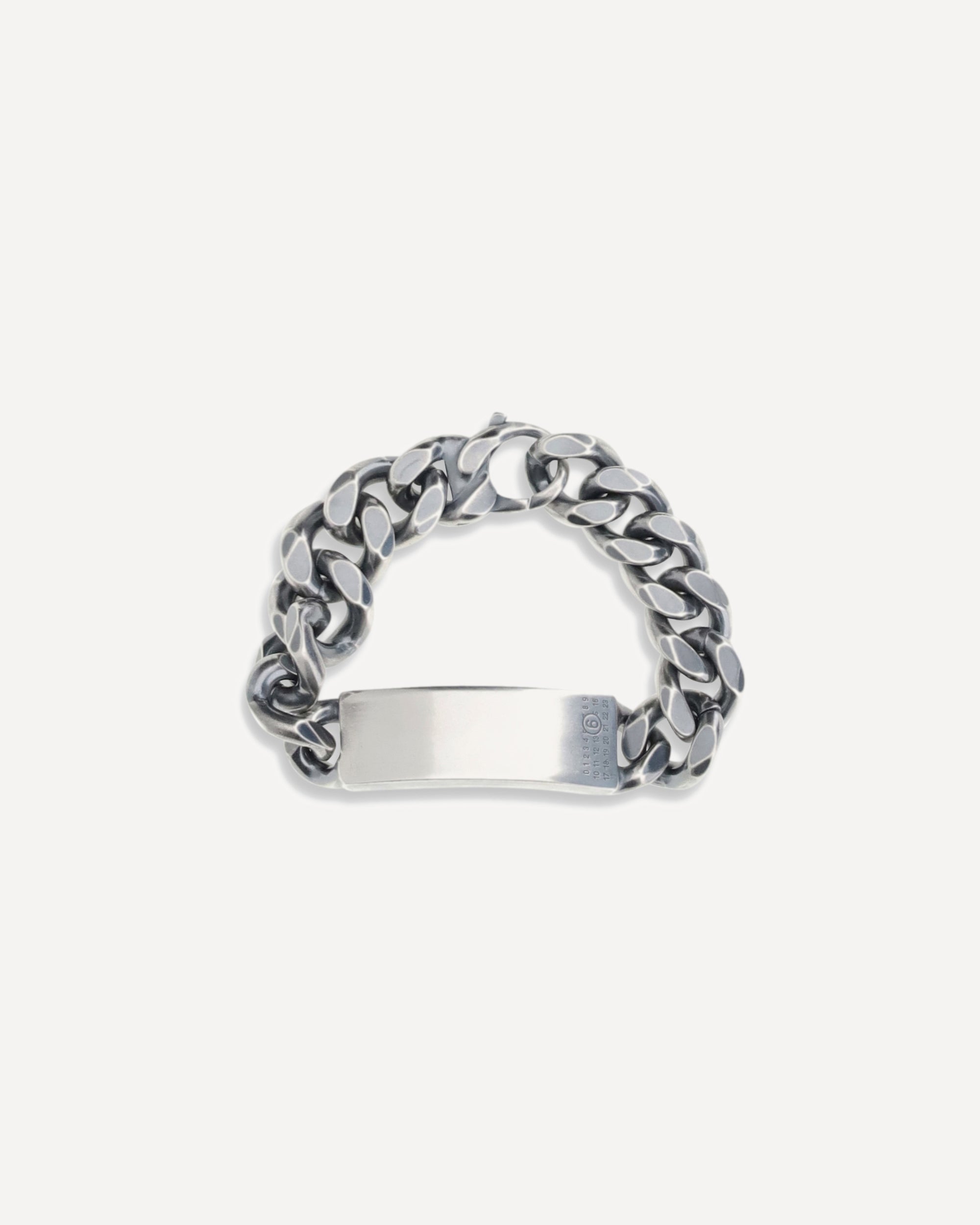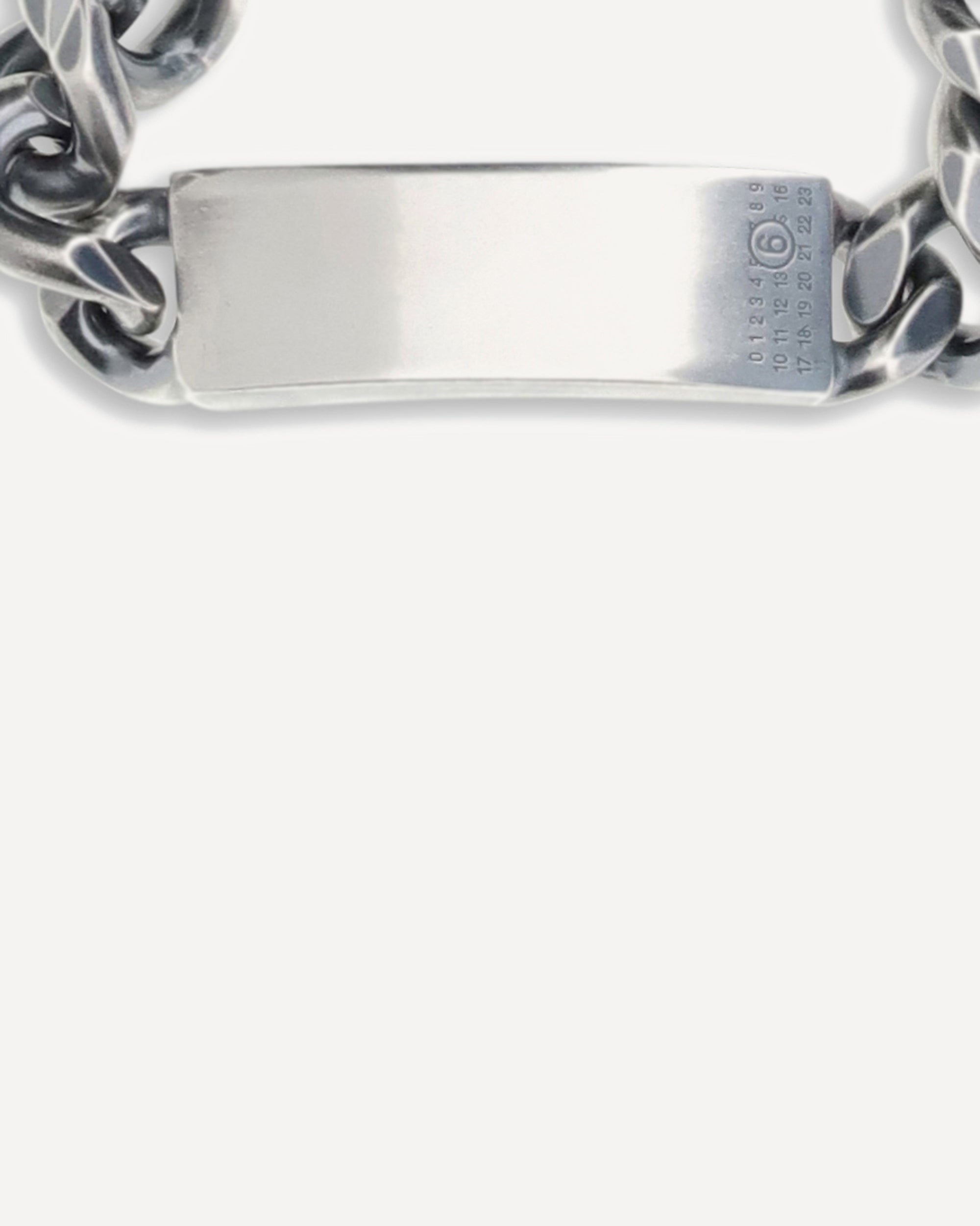 Il Bracciale con catena di MM6 è realizzato in ottone e trae ispirazione dagli iconici gioielli a catena di Margiela. Presenta una firma numerica incisa su una piastrina che ne certifica l’autenticità e lo stile distintivo.