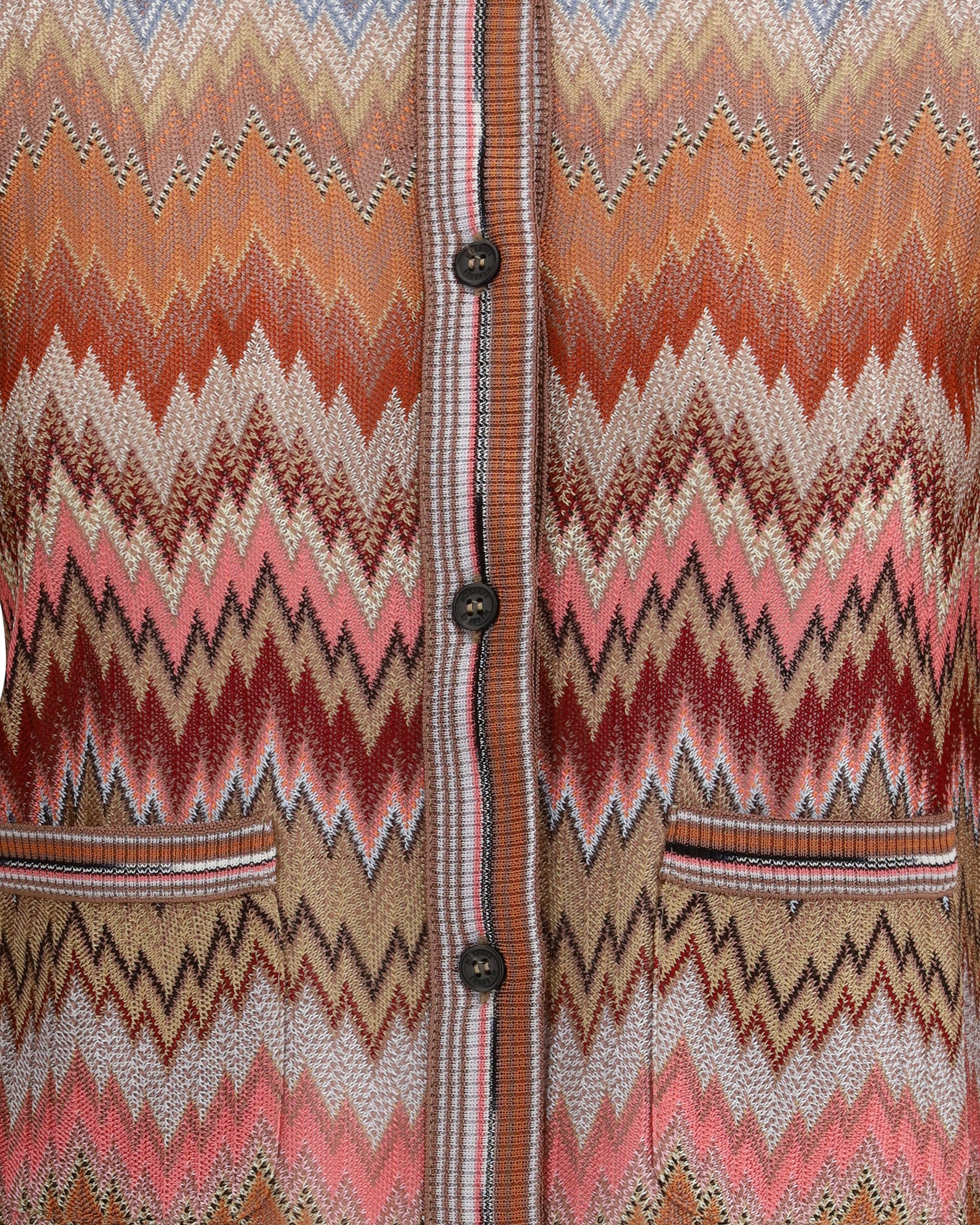 Il Cardigan in viscosa con motivo snake chevron di Missoni esprime la raffinatezza tessile della maison attraverso una preziosa lavorazione raschel che dona profondità e dinamismo al pattern. Il modello, completato da tasche applicate e bottoni frontali, unisce praticità ed eleganza in un capo dalla presenza distintiva. Una maglia sofisticata, ideale per aggiungere texture e ricercatezza ai look quotidiani e da vacanza.