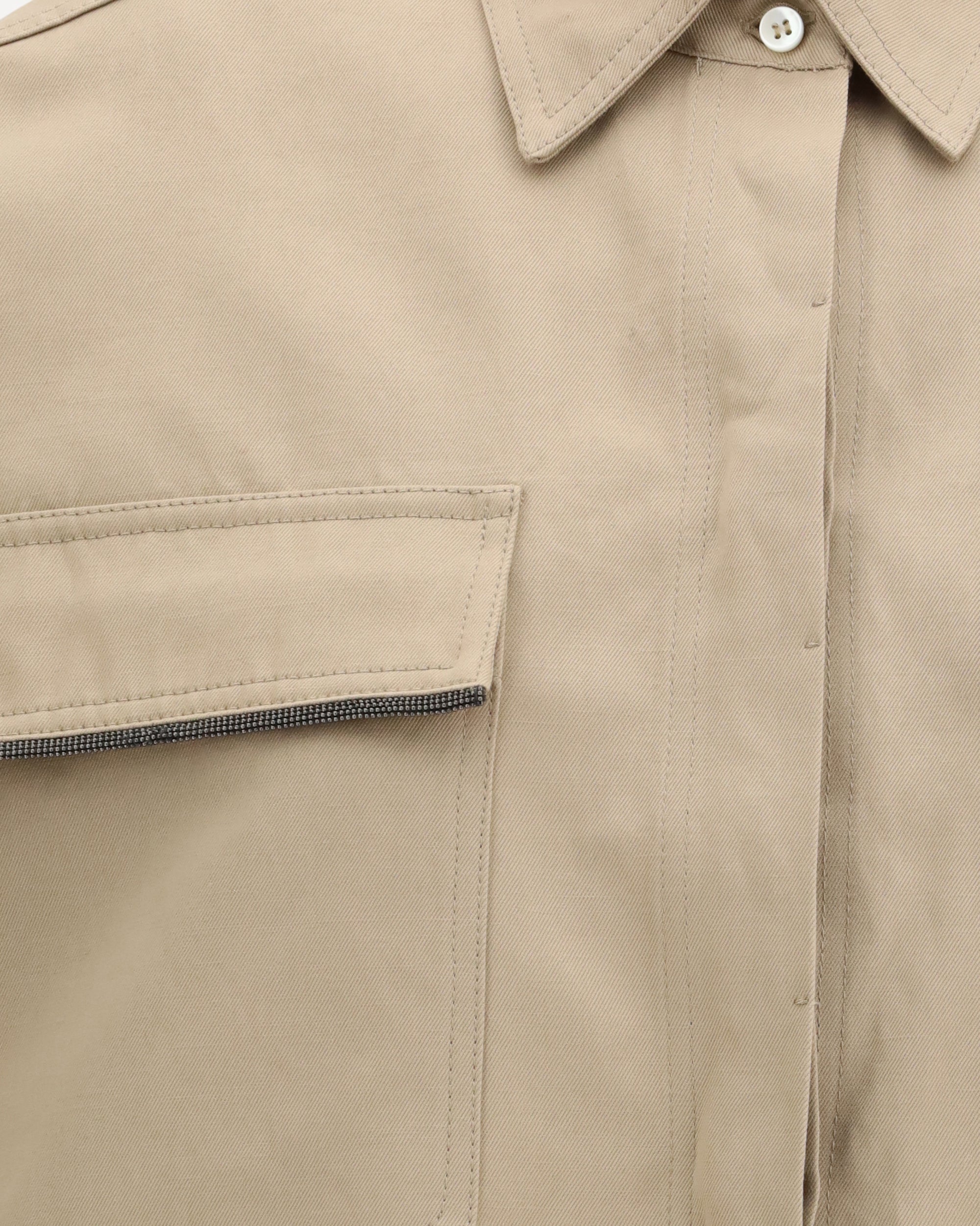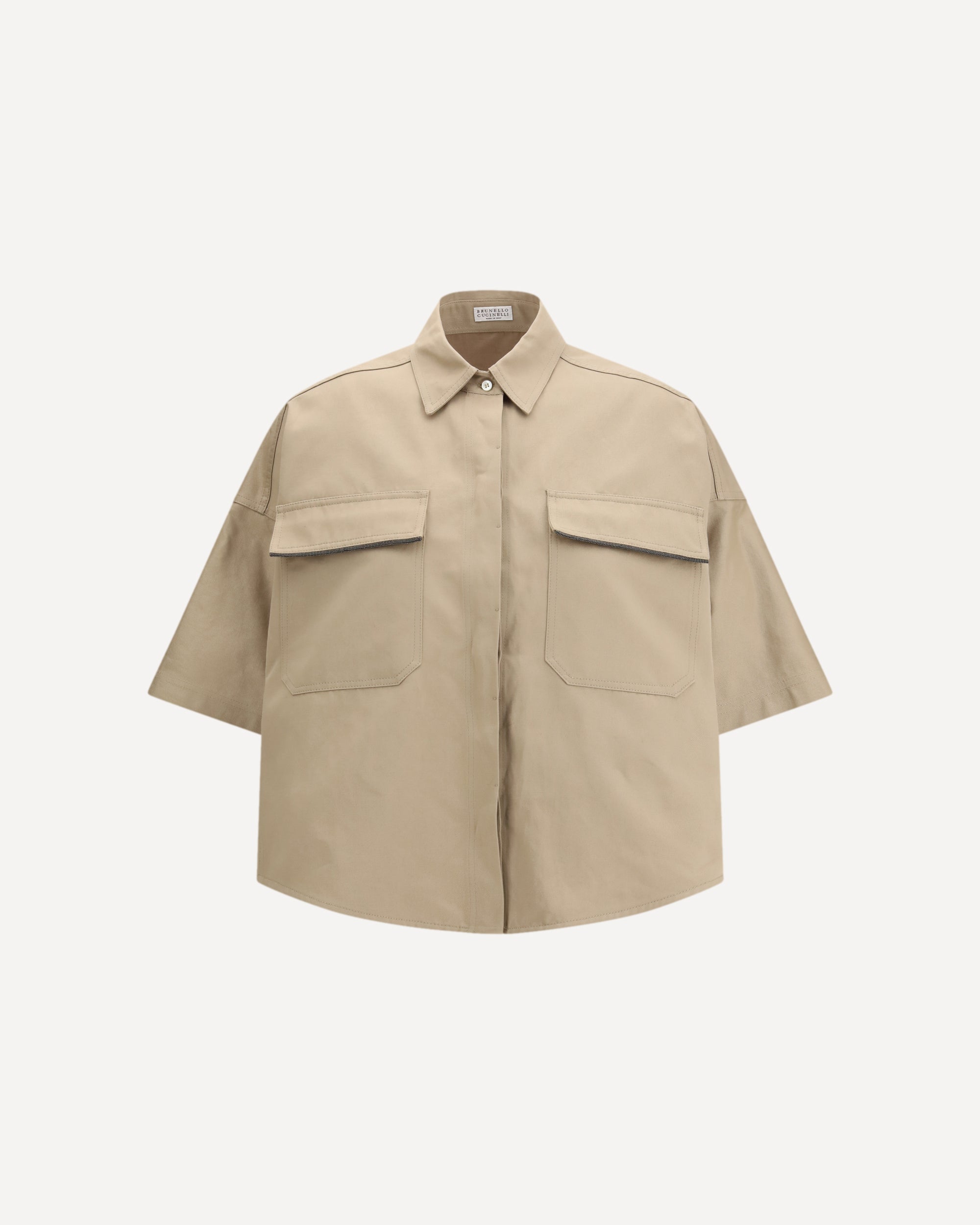 La Camicia a maniche corte di Brunello Cucinelli è realizzata in un pregiato mix di lino e cotone, che dona al capo leggerezza e traspirabilità naturali. Il design essenziale e raffinato è scandito dal colletto classico, dalla chiusura con bottoni e da due tasche applicate sul davanti, posizionate simmetricamente per un accento funzionale ed elegante. La silhouette rilassata completa il carattere disinvolto e versatile della camicia, perfetta per uno stile sofisticato e quotidiano.