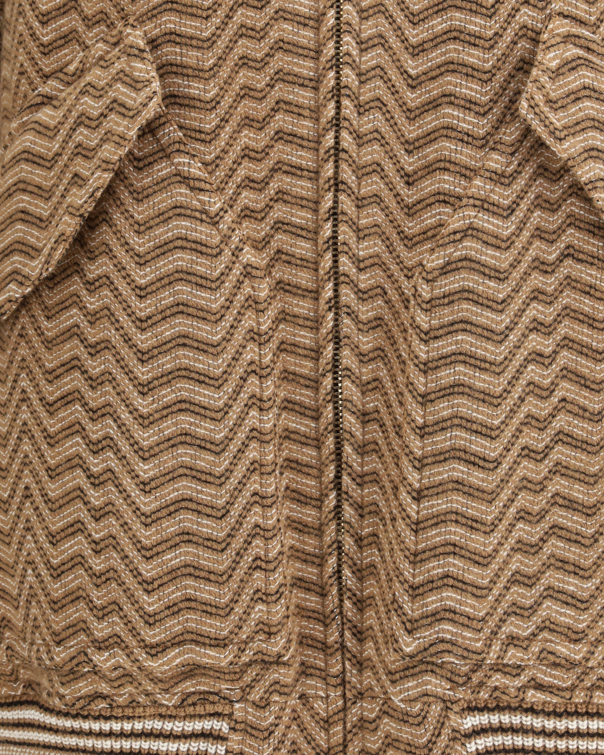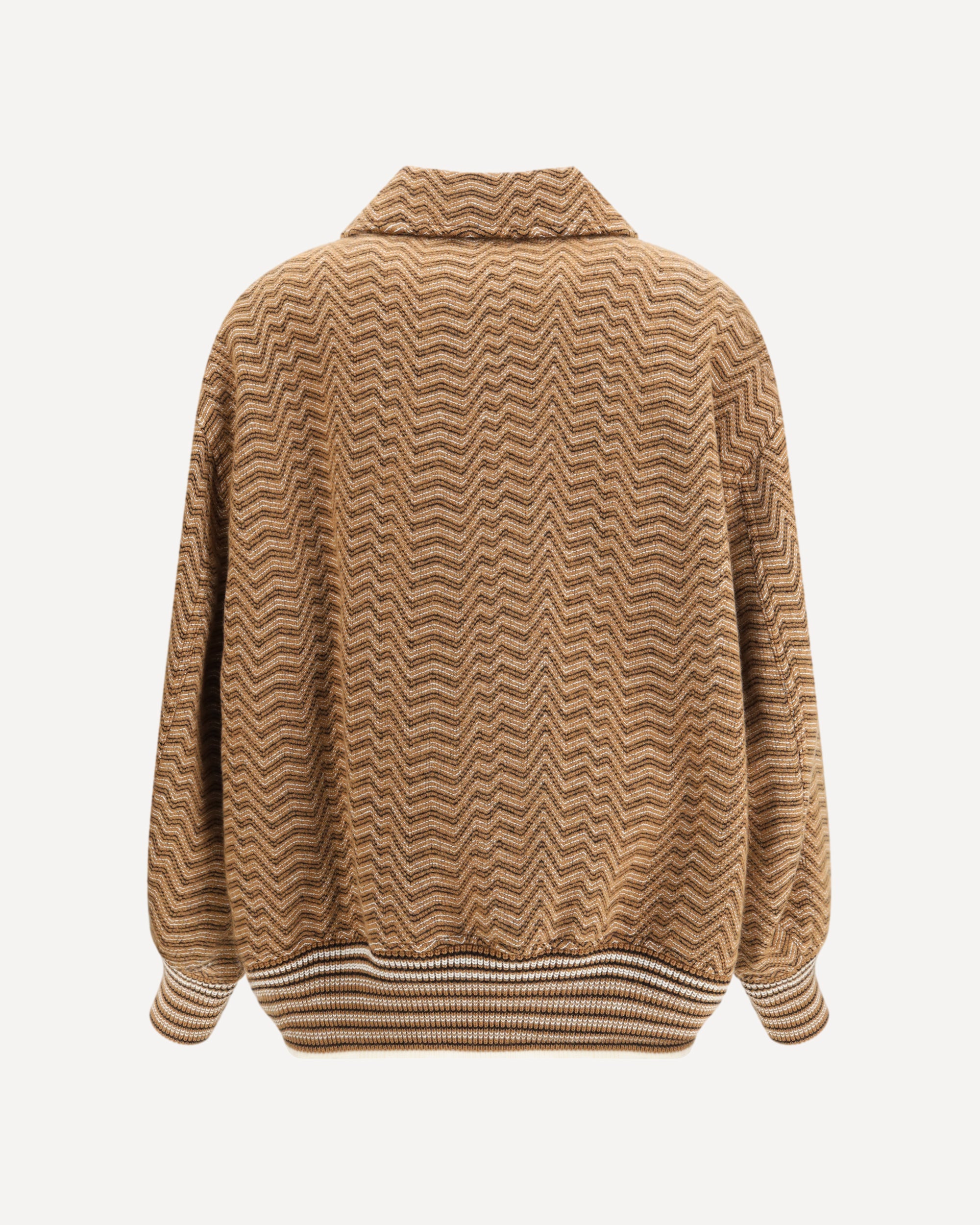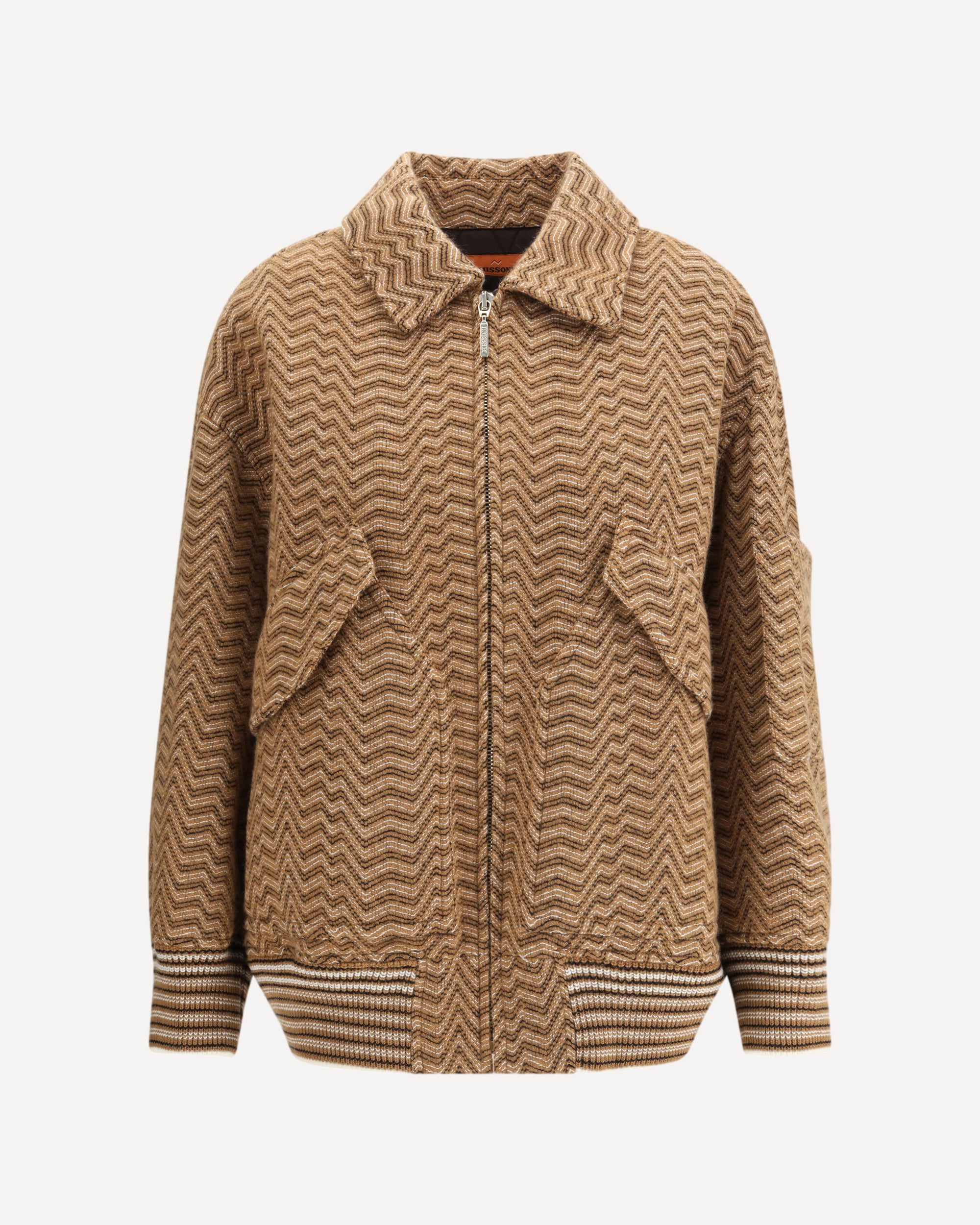 Il Bomber con motivo chevron irregolare interpreta con eleganza l’inconfondibile artigianalità di Missoni. Realizzato con telaio Caperdoni, questo capo da donna rivela un intreccio di trame e rilievi che danno vita a un disegno dinamico e sofisticato. Il tessuto in misto cotone e lana unisce comfort e struttura, mettendo in risalto il motivo grafico con un effetto materico di grande equilibrio. Il taglio bomber conferisce un tocco contemporaneo, trasformando un simbolo della tradizione in un’espressione moderna di stile. Un capo pensato per chi ama la raffinatezza quotidiana e il carattere autentico del lavoro artigianale.