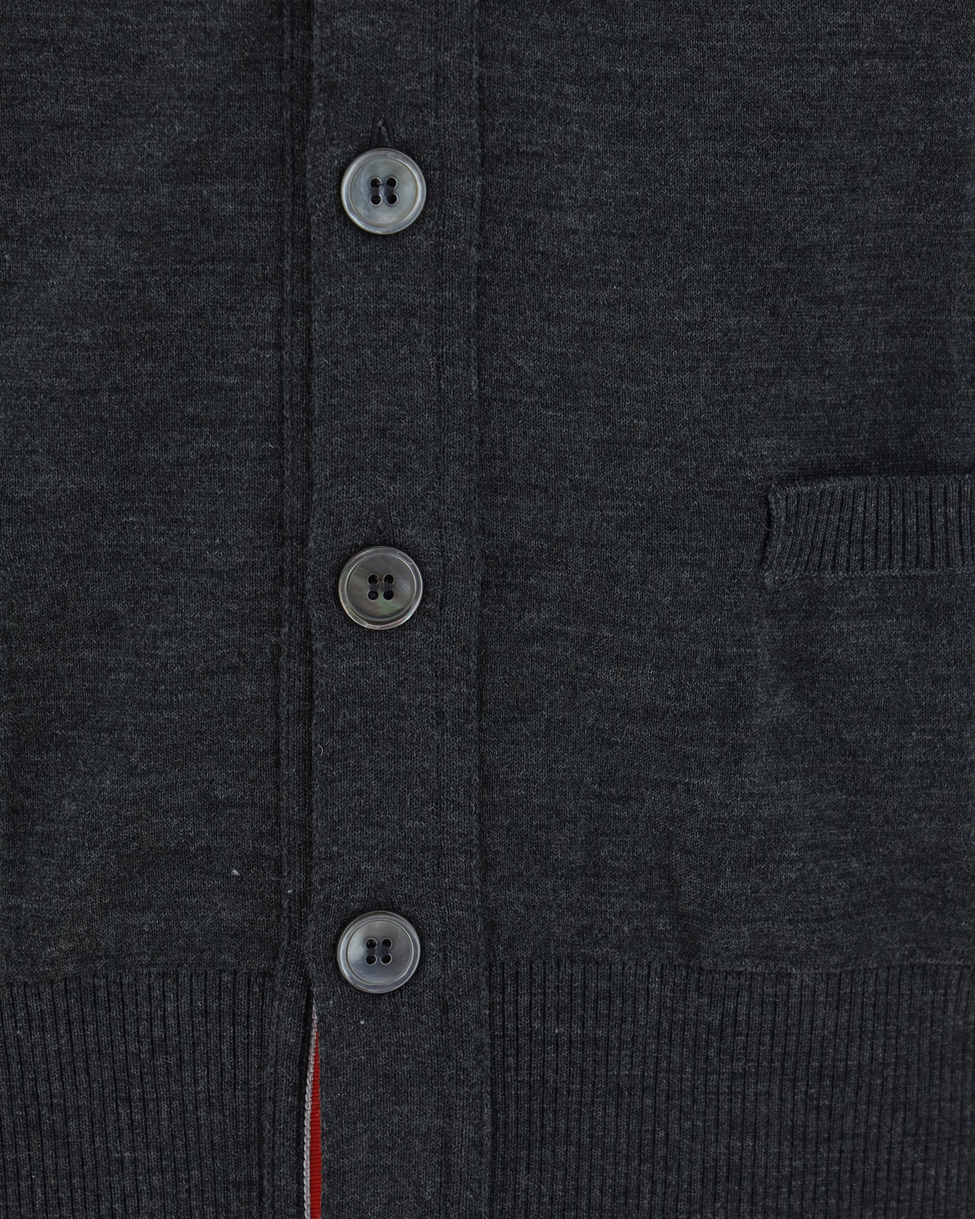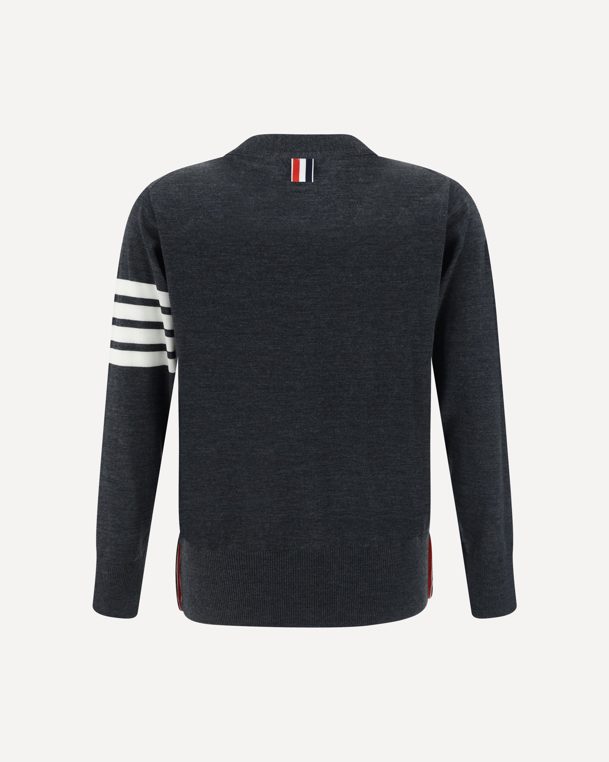 Cardigan in lana vergine di Thom Browne, polsini a righe con bottone, orlo a costine con spacchi laterali regolabili con bottoni, scollo a V, chiusura frontale con bottoni, due tasche applicate sul fronte, iconiche bande logo brand su braccio sinistro, profili interni con colori iconici del brand.