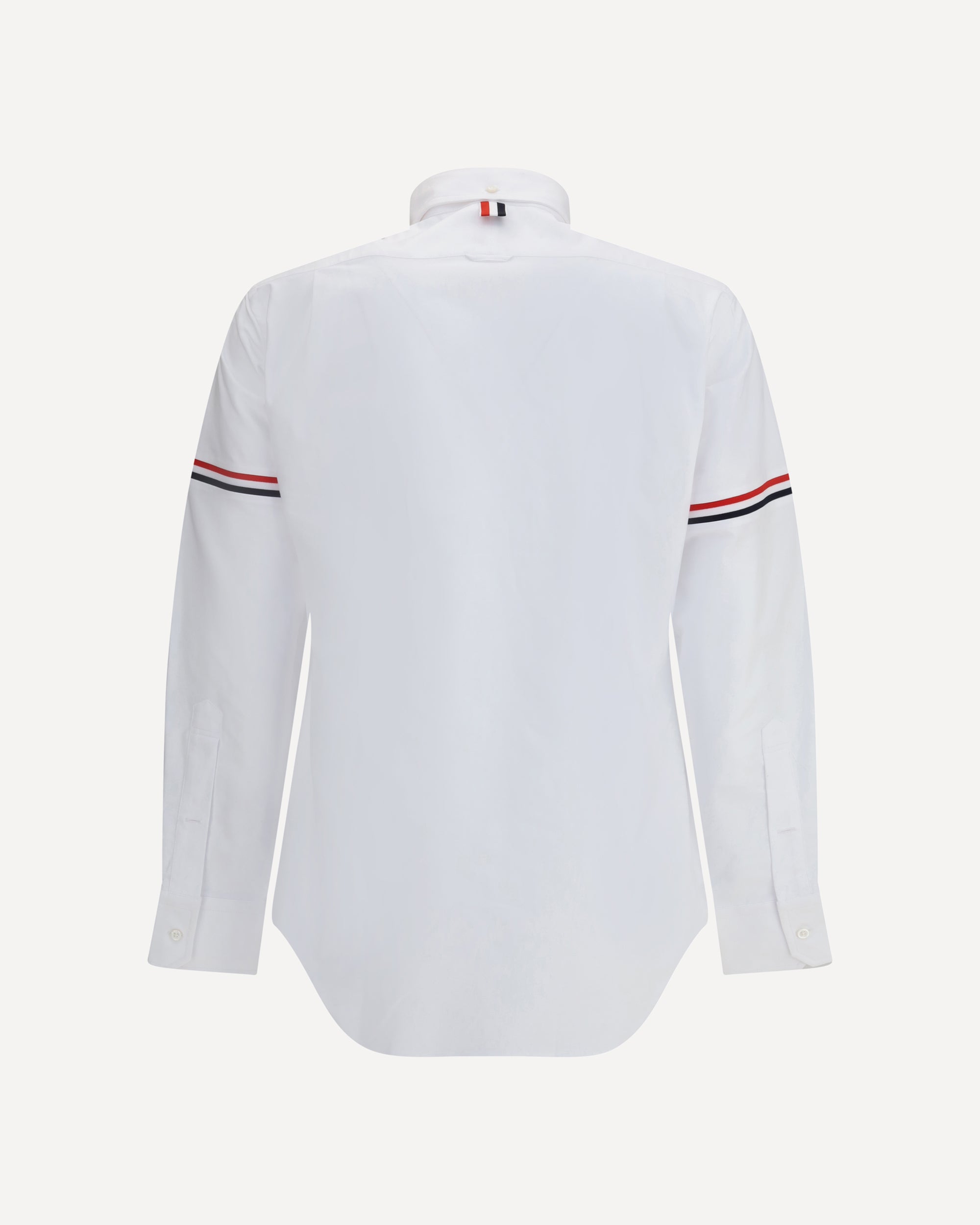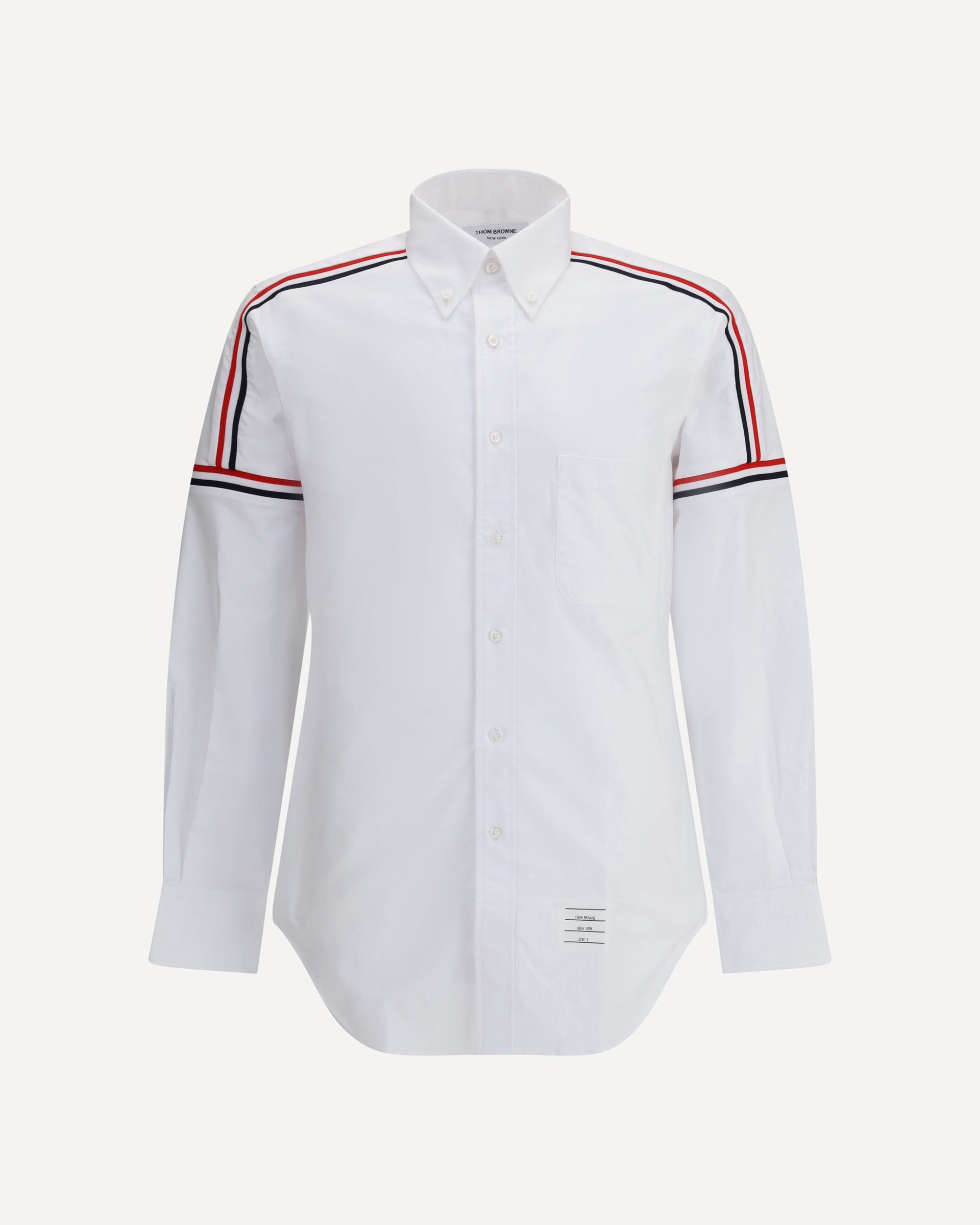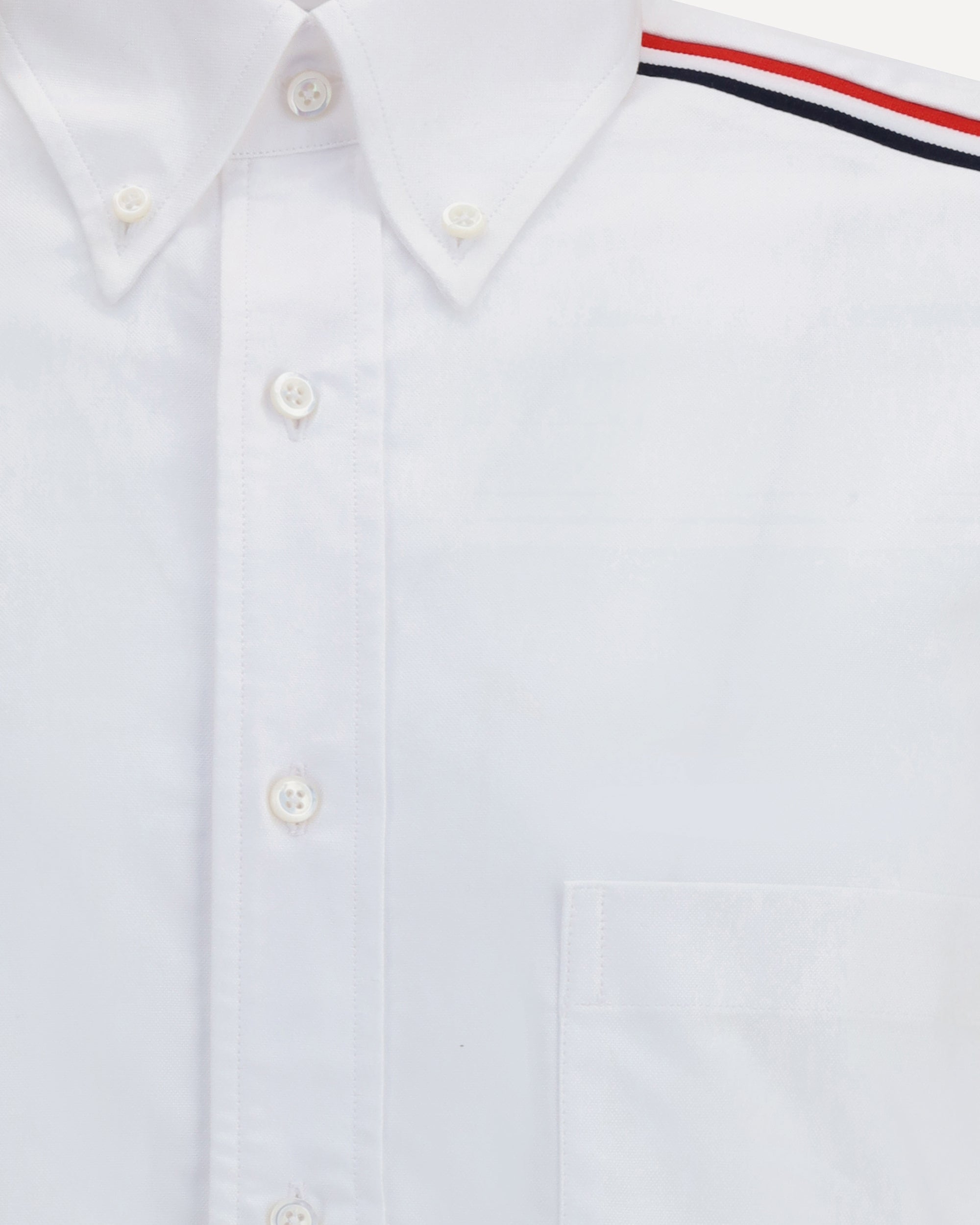 La Camicia in cotone di Thom Browne è caratterizzata da un colletto classico e una chiusura frontale con bottoni. Sul fronte è presente una tasca applicata, mentre le iconiche bande tricolore lungo spalle e maniche aggiungono un tocco distintivo e riconoscibile al design essenziale.