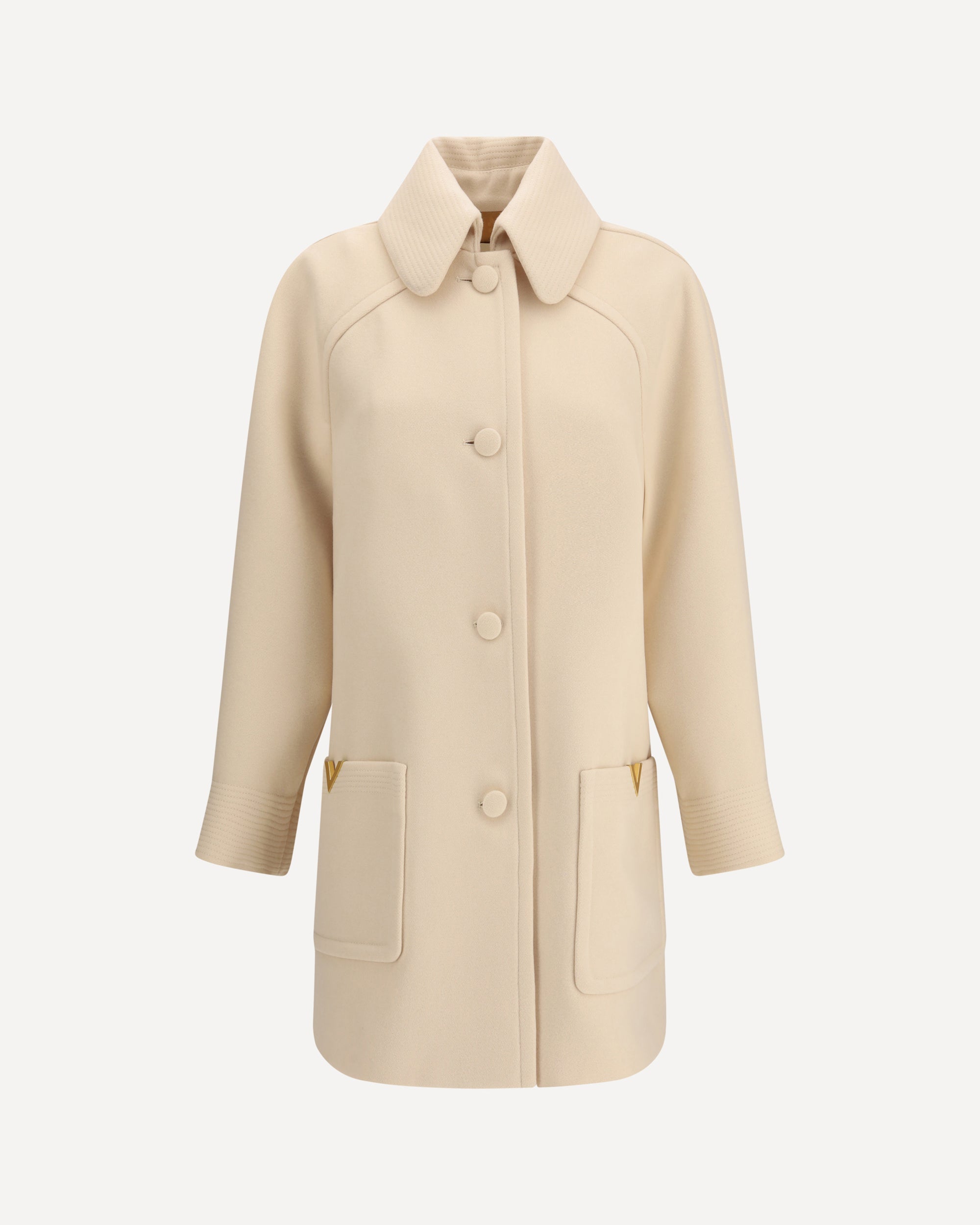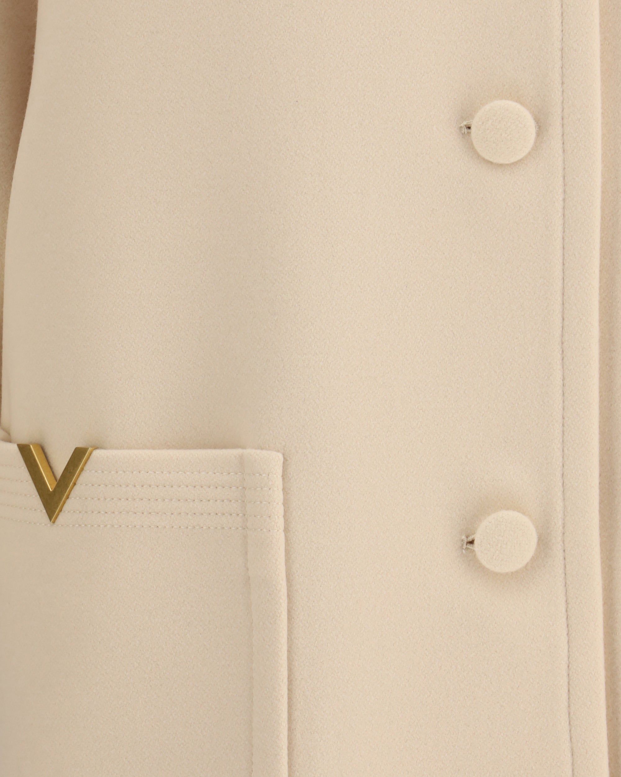 Il Caban in Lana Drap di Valentino è un capospalla raffinato con colletto classico e un fit rilassato. Il design è arricchito dal dettaglio V Gold applicato sulle tasche, simbolo iconico della Maison. La chiusura frontale con bottoni e la costruzione in lana vergine con fodera a fiori, righe e VLogo completano l’eleganza del modello.