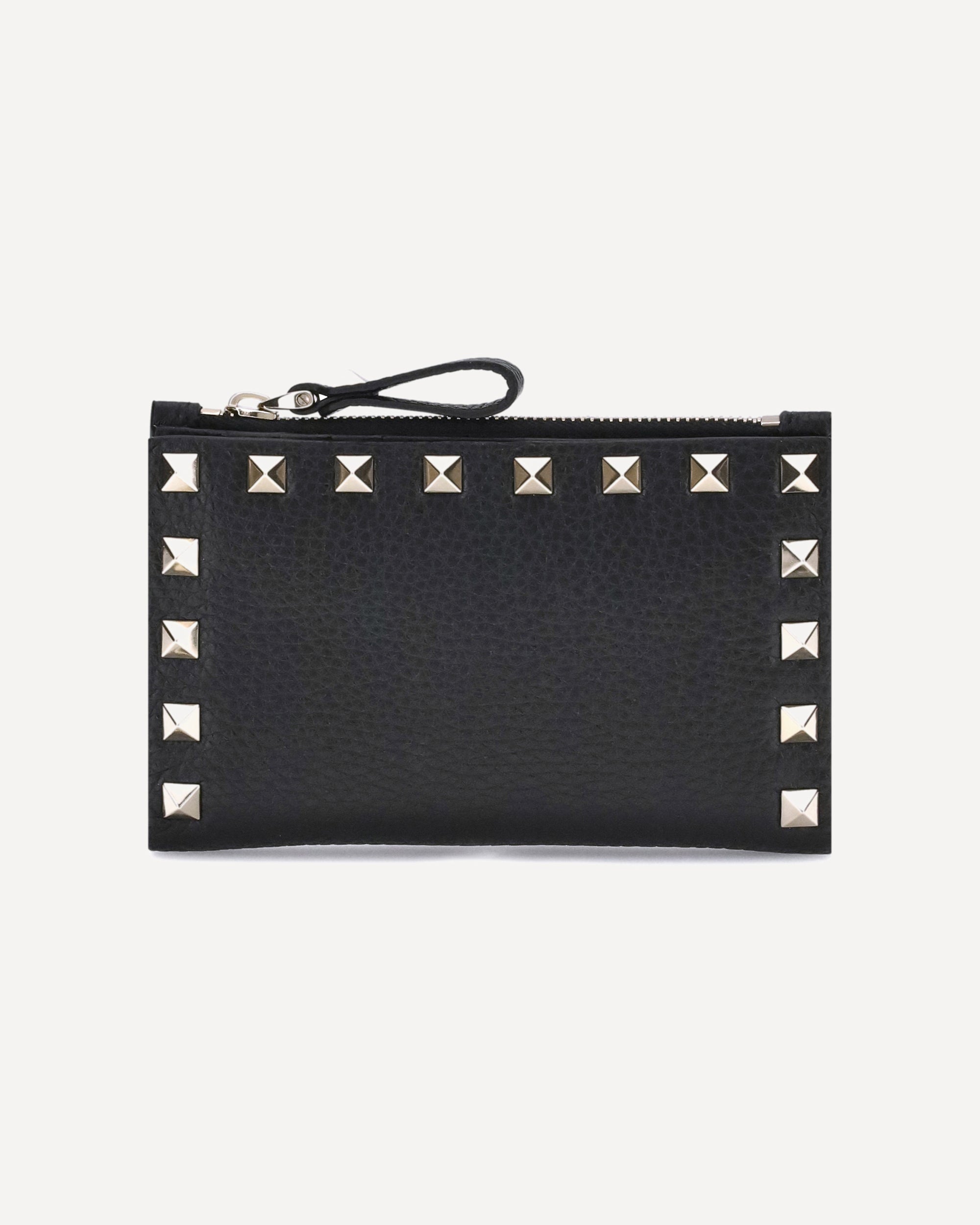 Il Portamonete Rockstud di Valentino Garavani unisce stile deciso e praticità. Caratterizzato dalle iconiche borchie lungo i profili, è dotato di una tasca a filetto con chiusura a zip e del logo stampato su un lato, per un tocco distintivo e sofisticato.