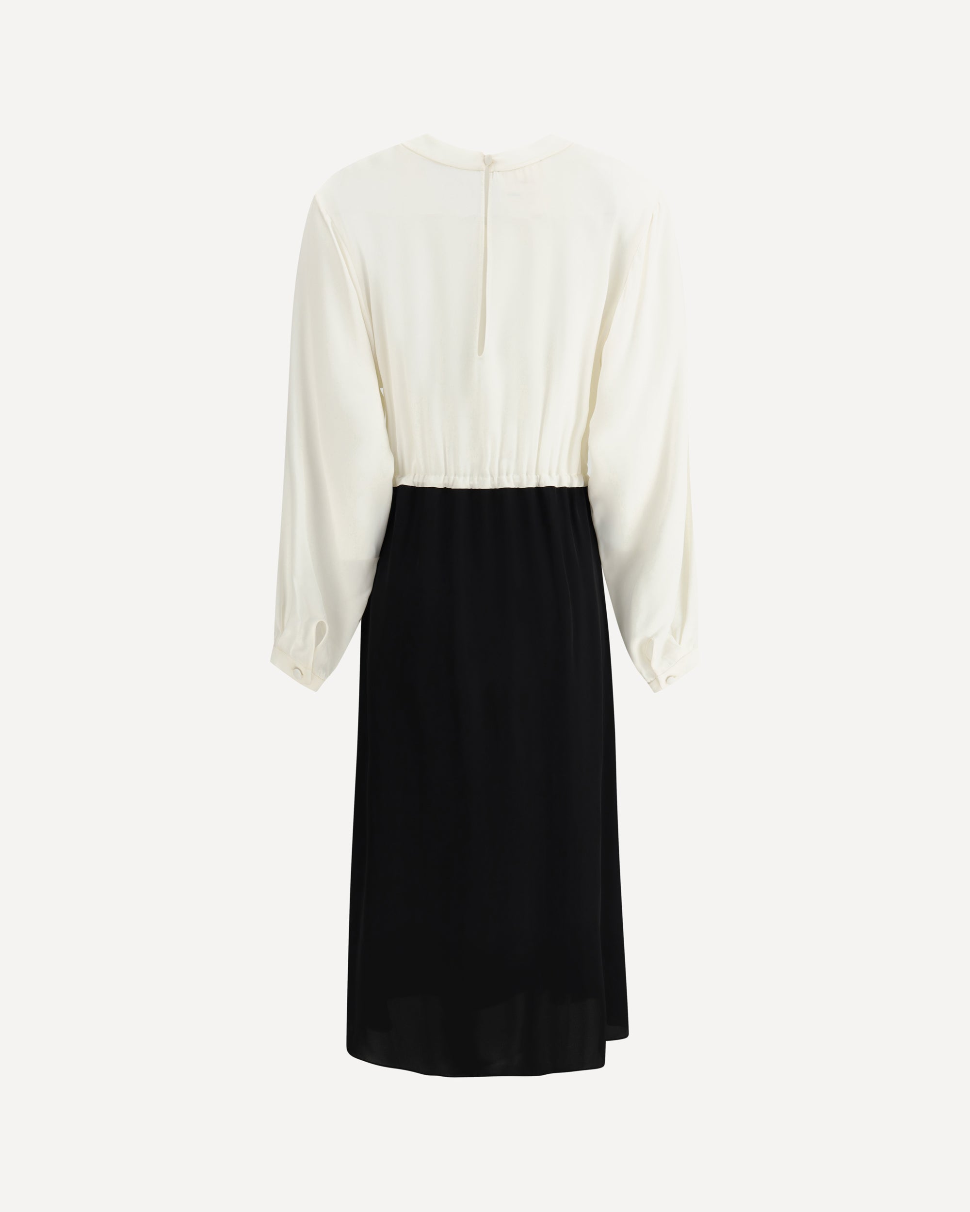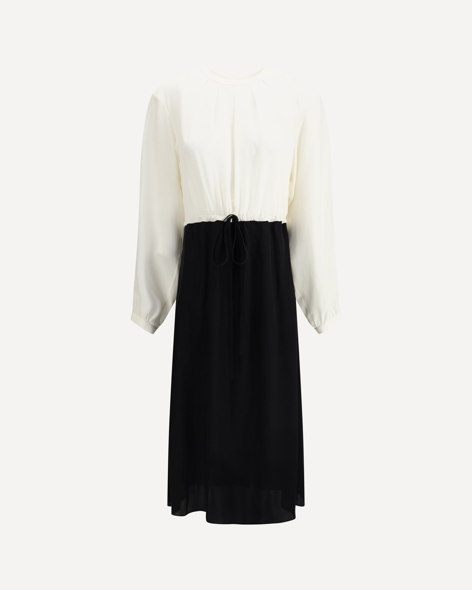 Abito midi Correr di Crida Milano, realizzato in pregiata seta per un effetto leggero e raffinato. Presenta un girocollo semplice, maniche lunghe regolabili con bottoncini e chiusura sul retro con bottoncino. Il girovita è regolabile grazie a una coulisse, per una vestibilità personalizzata. Completano il design due tasche a filetto laterali e una gonna a contrasto, che aggiunge un tocco di originalità e movimento al capo. Un abito elegante e versatile, perfetto per occasioni speciali e look di classe.