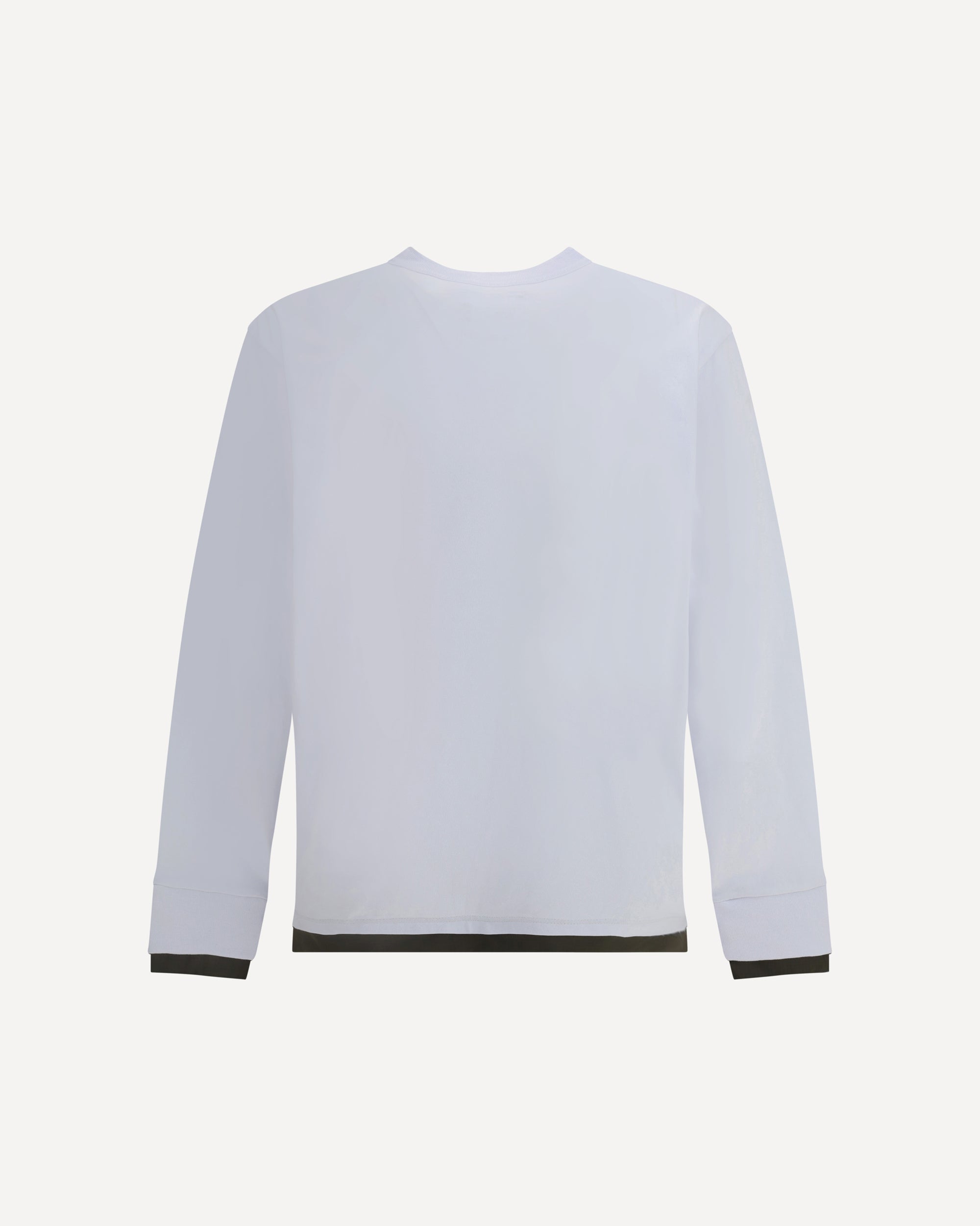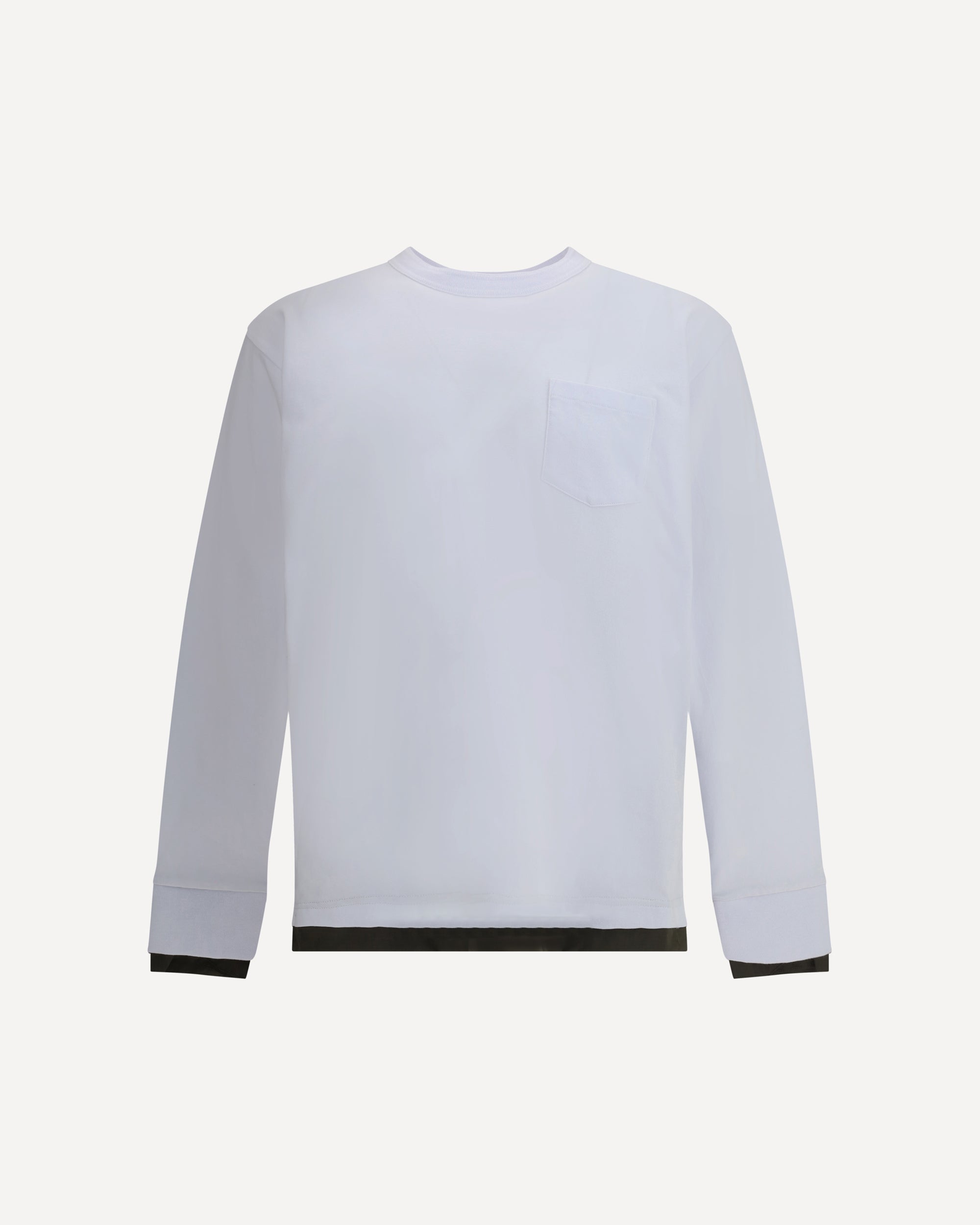 Maglia a maniche lunghe in cotone di Sacai, dallo stile contemporaneo e dalla vestibilità oversize. Girocollo a costine, taschino a filetto applicato sul fronte e profondi spacchi laterali con bottoncini per la regolazione. Orlo e polsini a doppio layer aggiungono un tocco distintivo al design, unendo funzionalità ed estetica in perfetto stile Sacai.