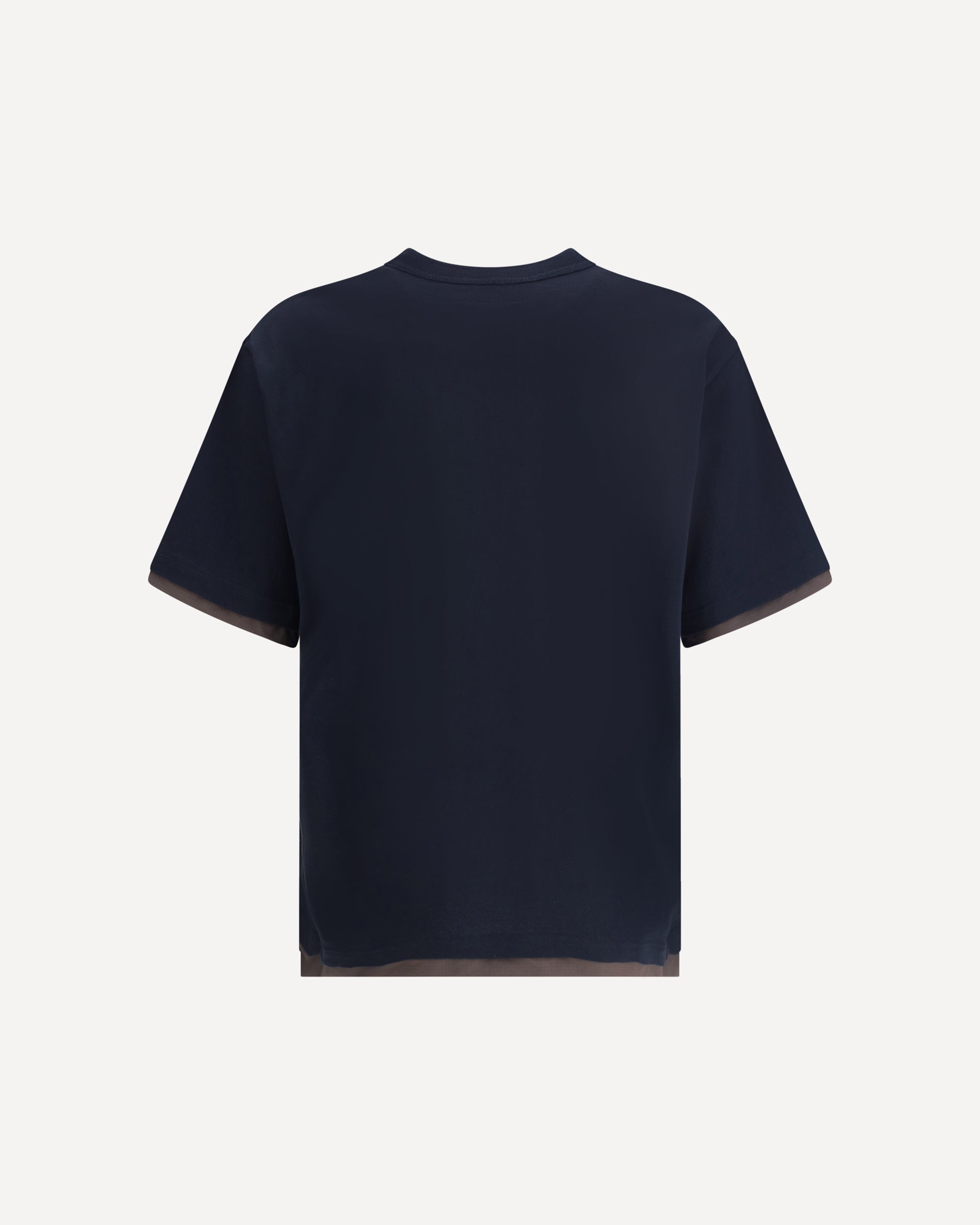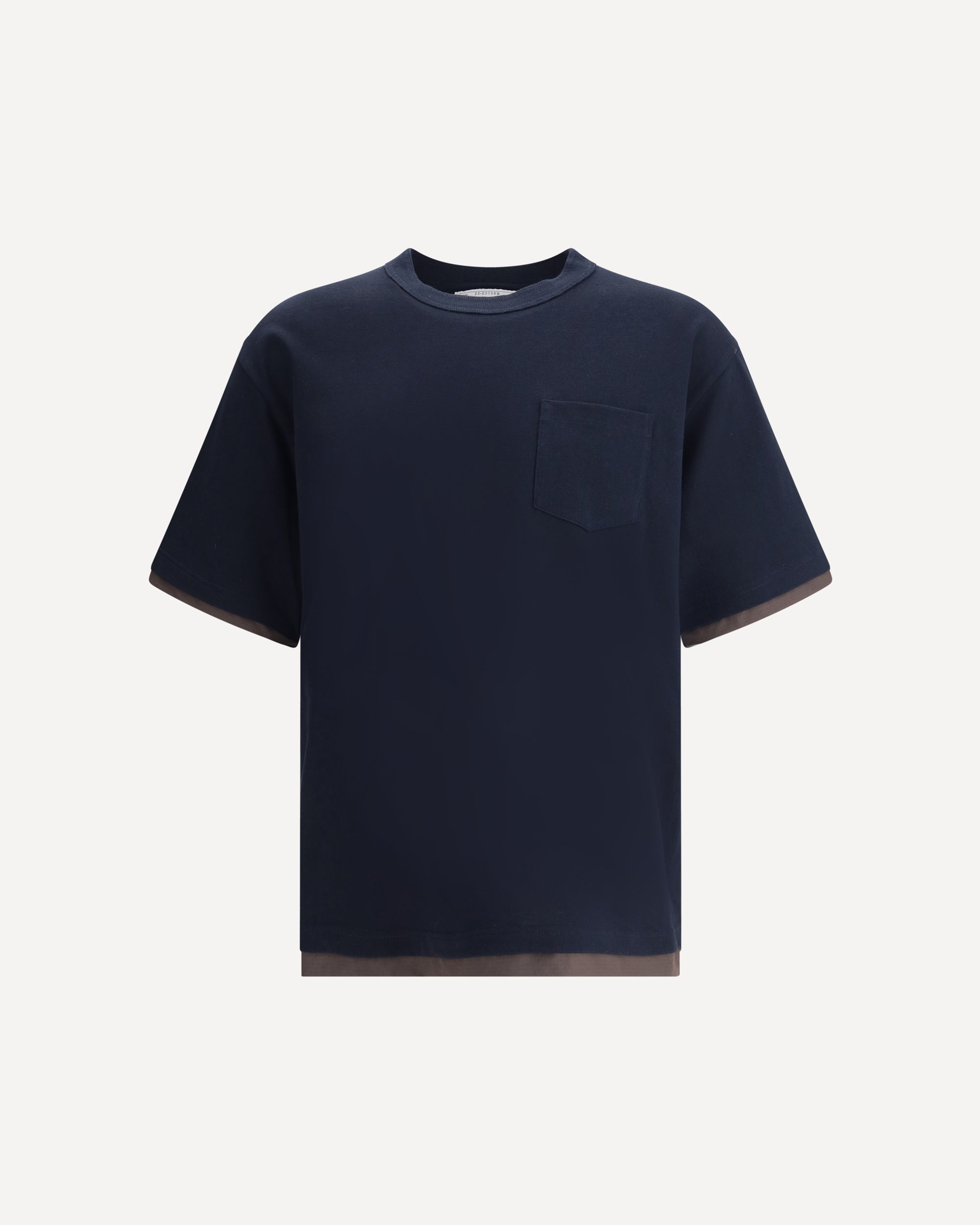 La T-Shirt di Sacai si caratterizza per la taschina applicata sul fronte, che aggiunge un dettaglio funzionale e di stile. Il girocollo classico garantisce comfort, mentre i doppi layers su orlo e maniche conferiscono un tocco innovativo e distintivo, perfetto per chi ama un look originale e contemporaneo.