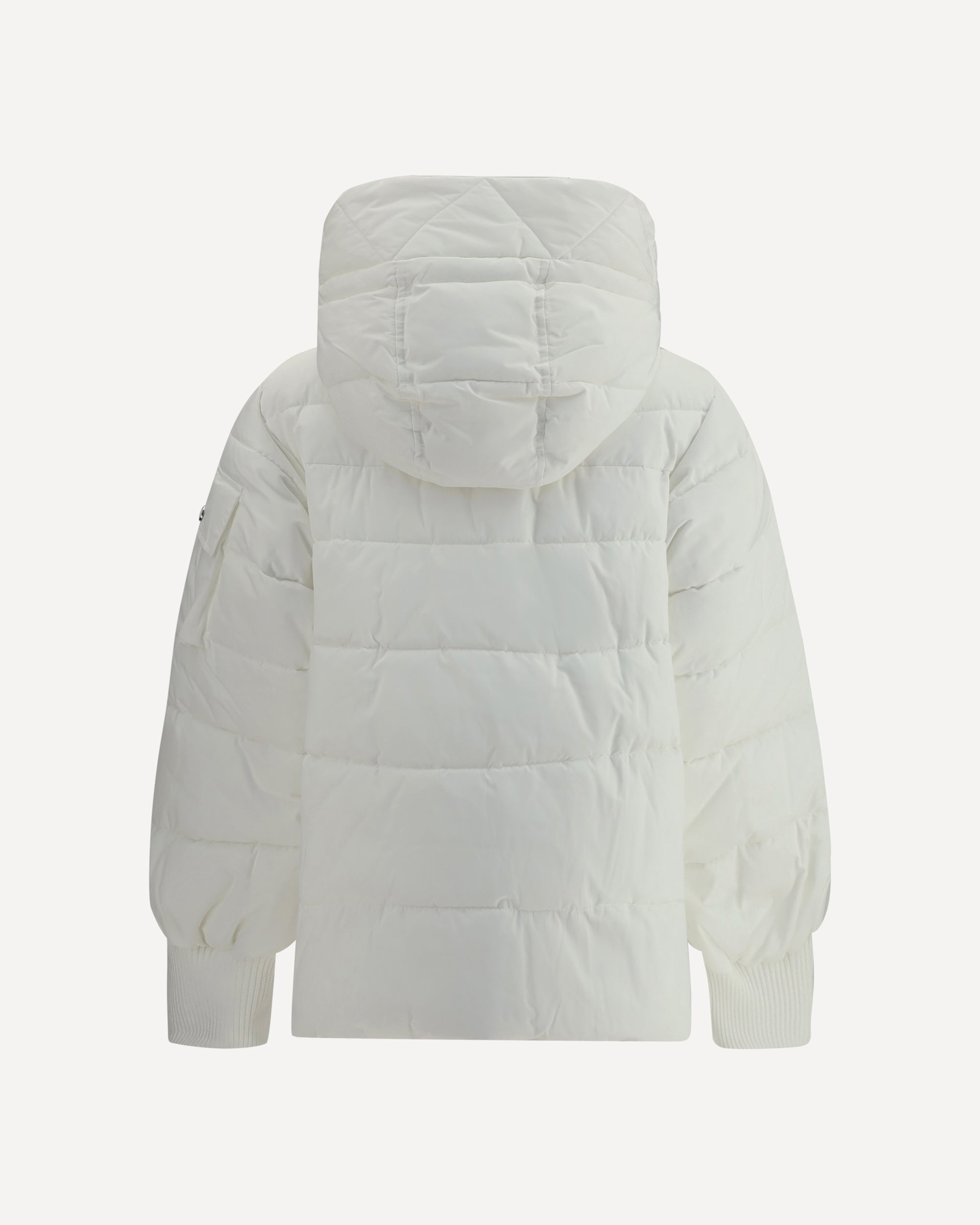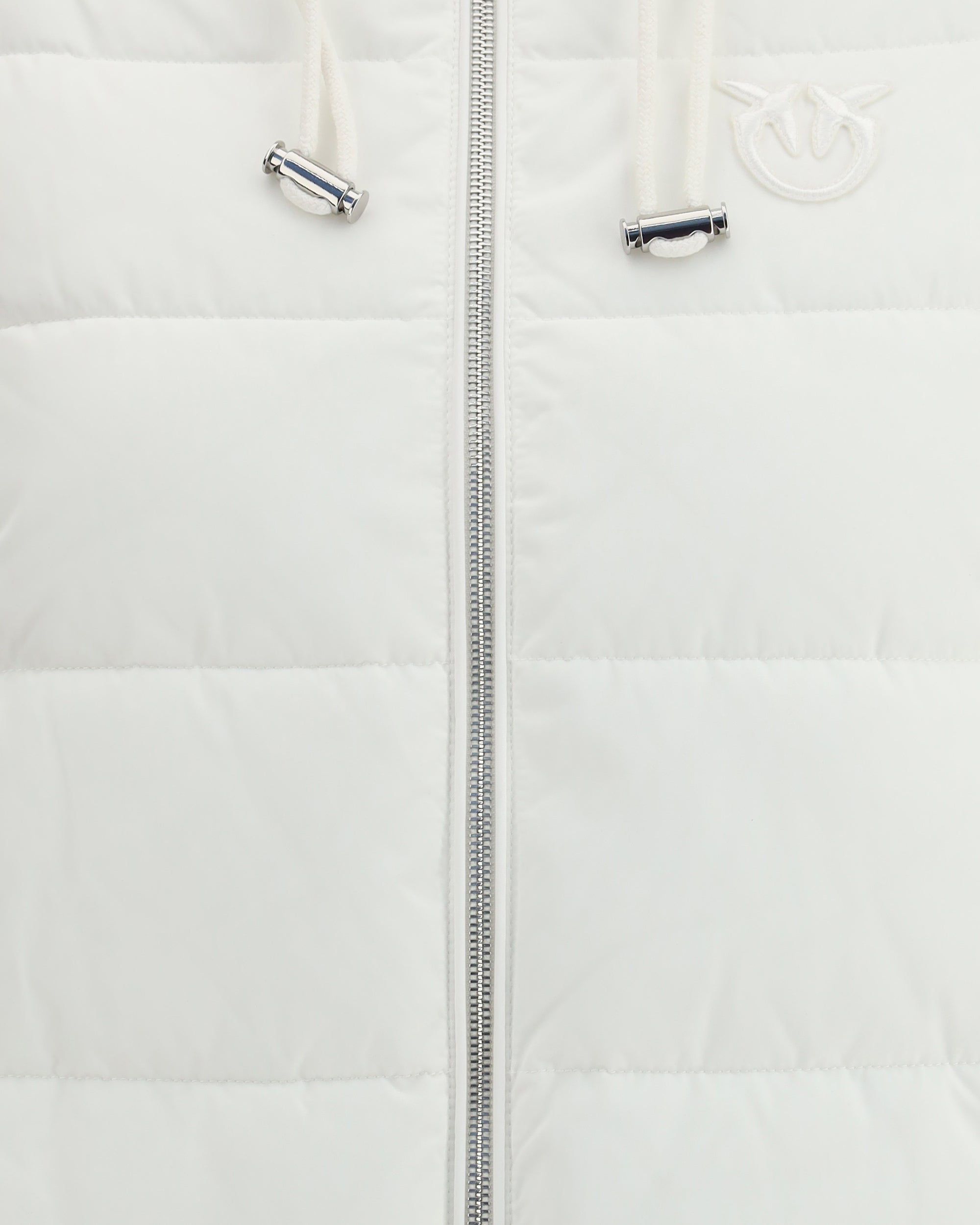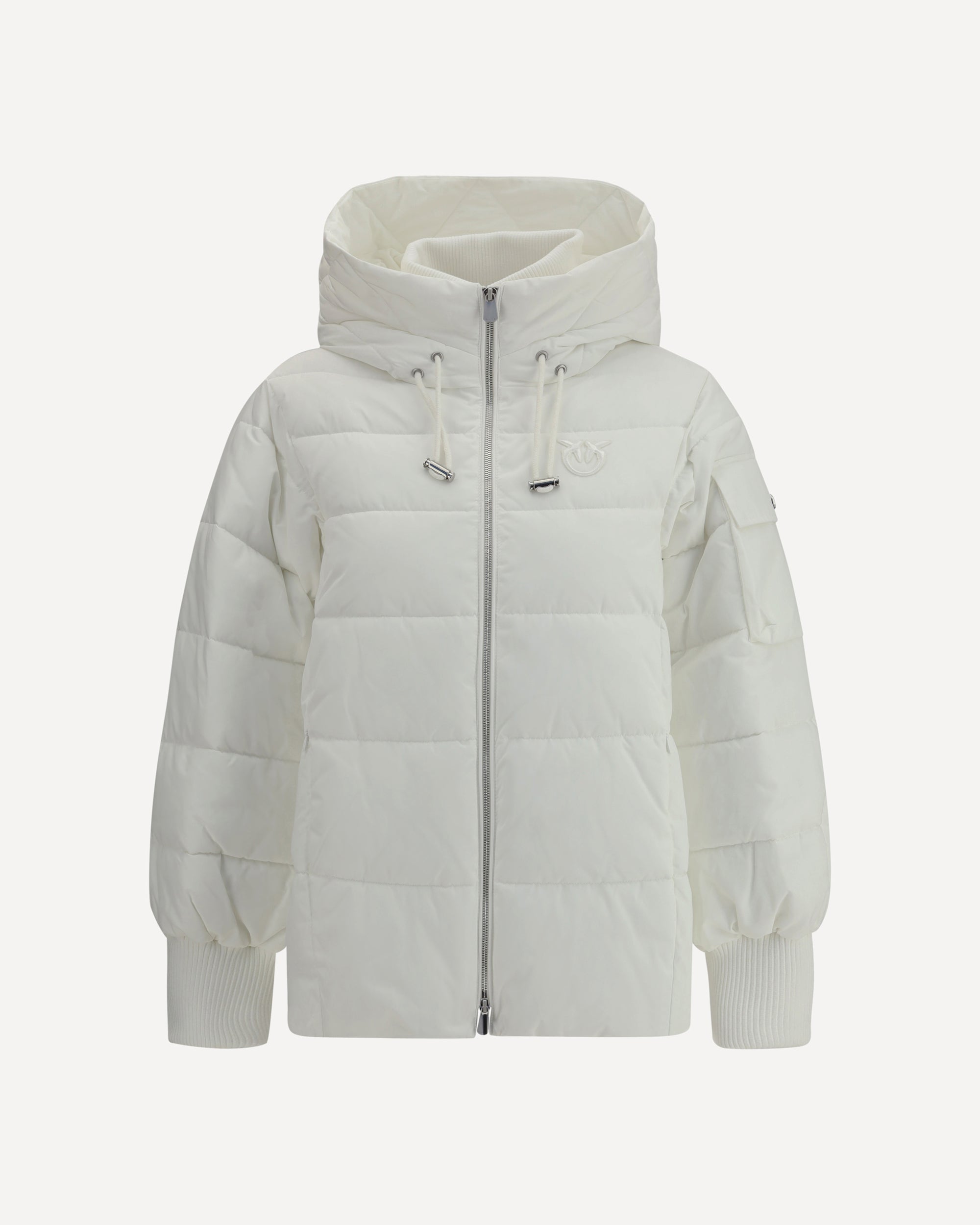 Il Piumino con logo di Pinko si distingue per il design imbottito e trapuntato, arricchito dal logo a contrasto applicato sul petto. Dotato di zip a doppio cursore, presenta cappuccio con visiera e coulisse, collo alto e polsini lavorati a maglia, per un mix perfetto di stile e protezione dal freddo.