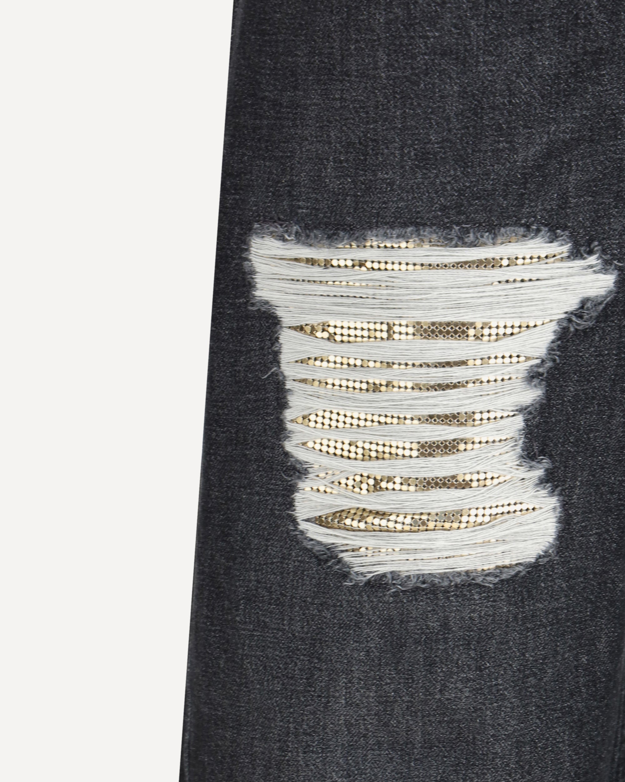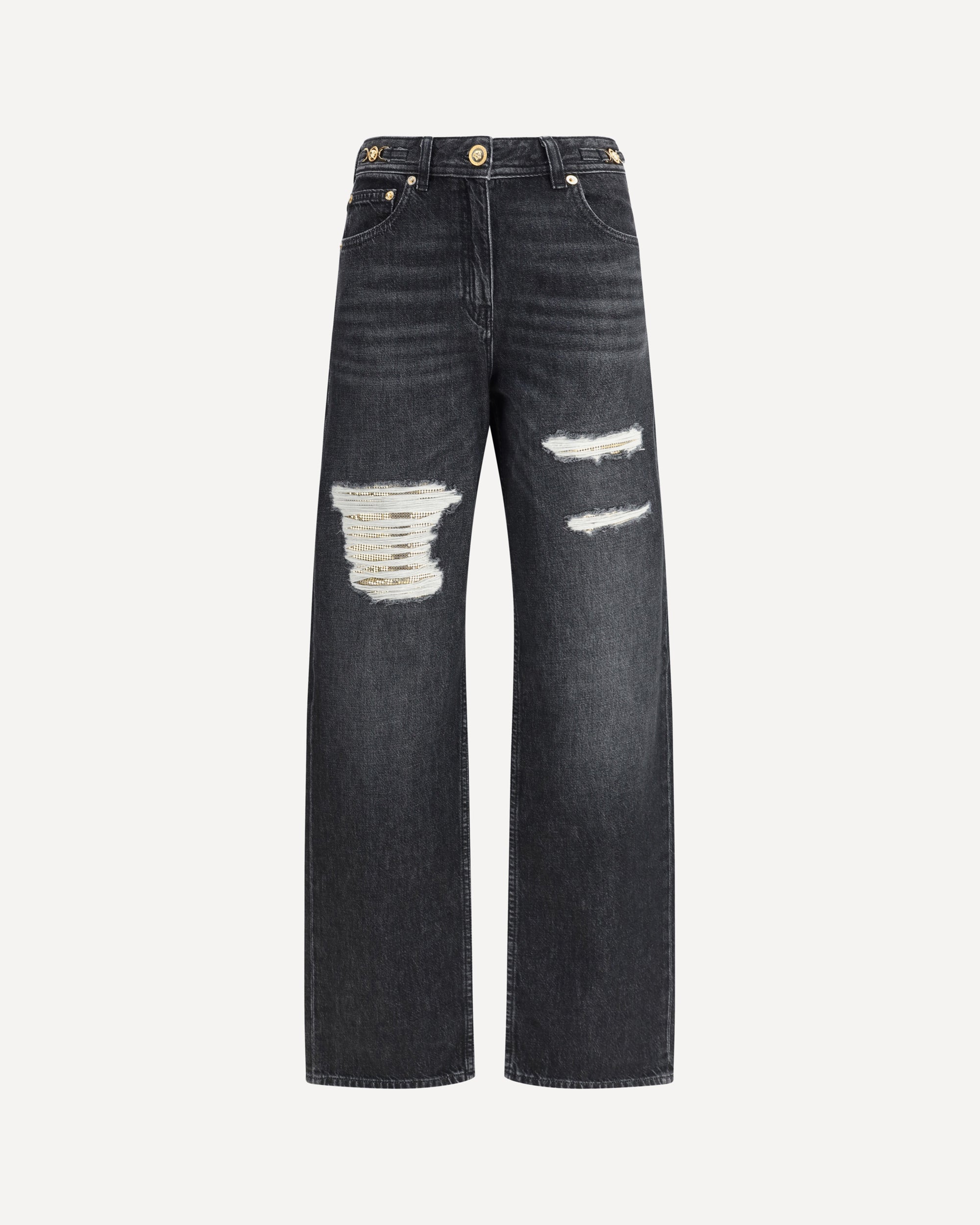 Jeans a vita media di Versace, realizzati in puro cotone e caratterizzati da un design a cinque tasche. Il modello si distingue per i dettagli cut-out sul fronte, impreziositi da inserti in maglia metallica dorata applicata, che aggiungono un tocco audace e contemporaneo. Completano il capo il patch in pelle con logo Versace applicato sul retro e la classica chiusura con zip e bottone. Un mix perfetto di eleganza e stile urbano, ideale per look distintivi e sofisticati.