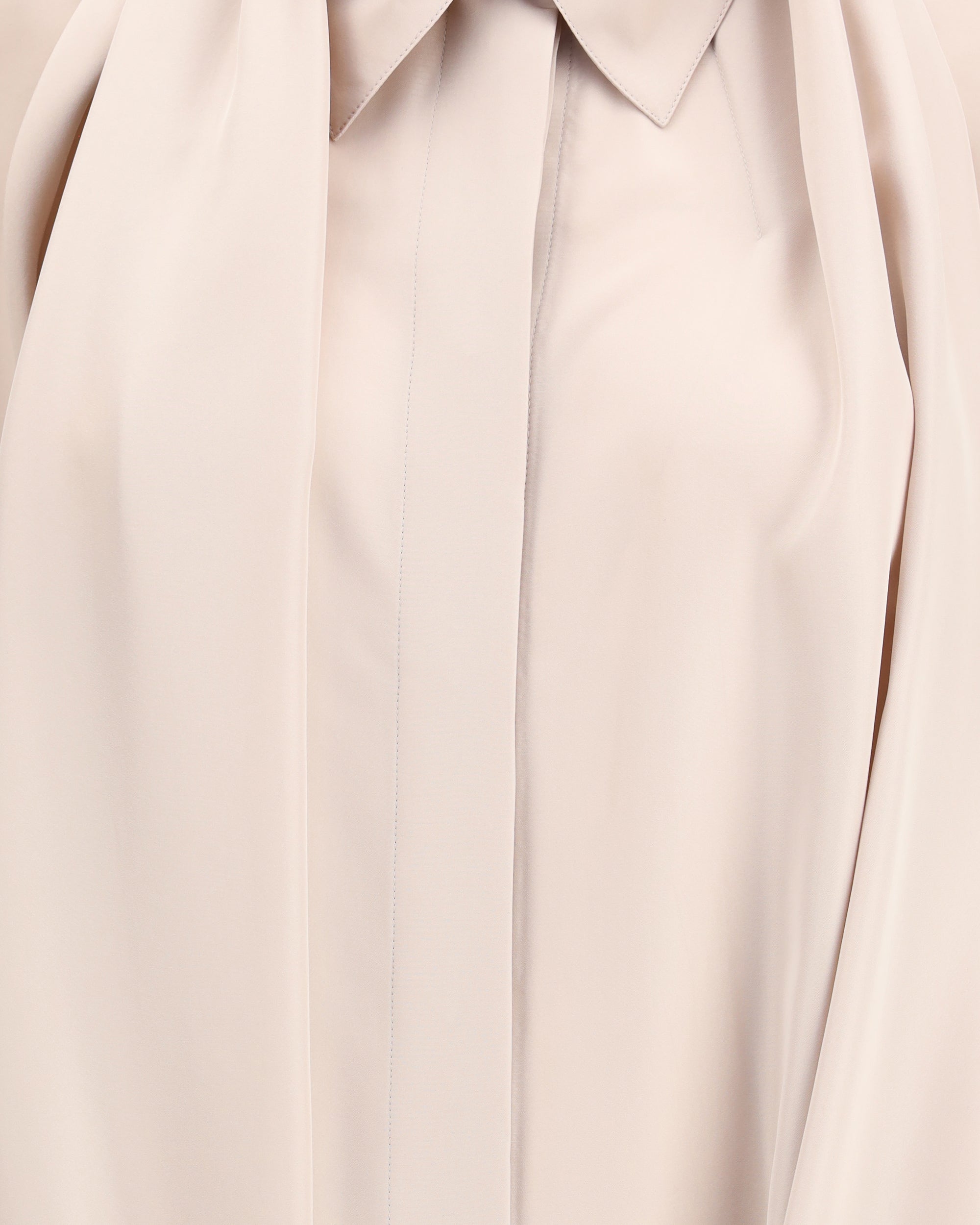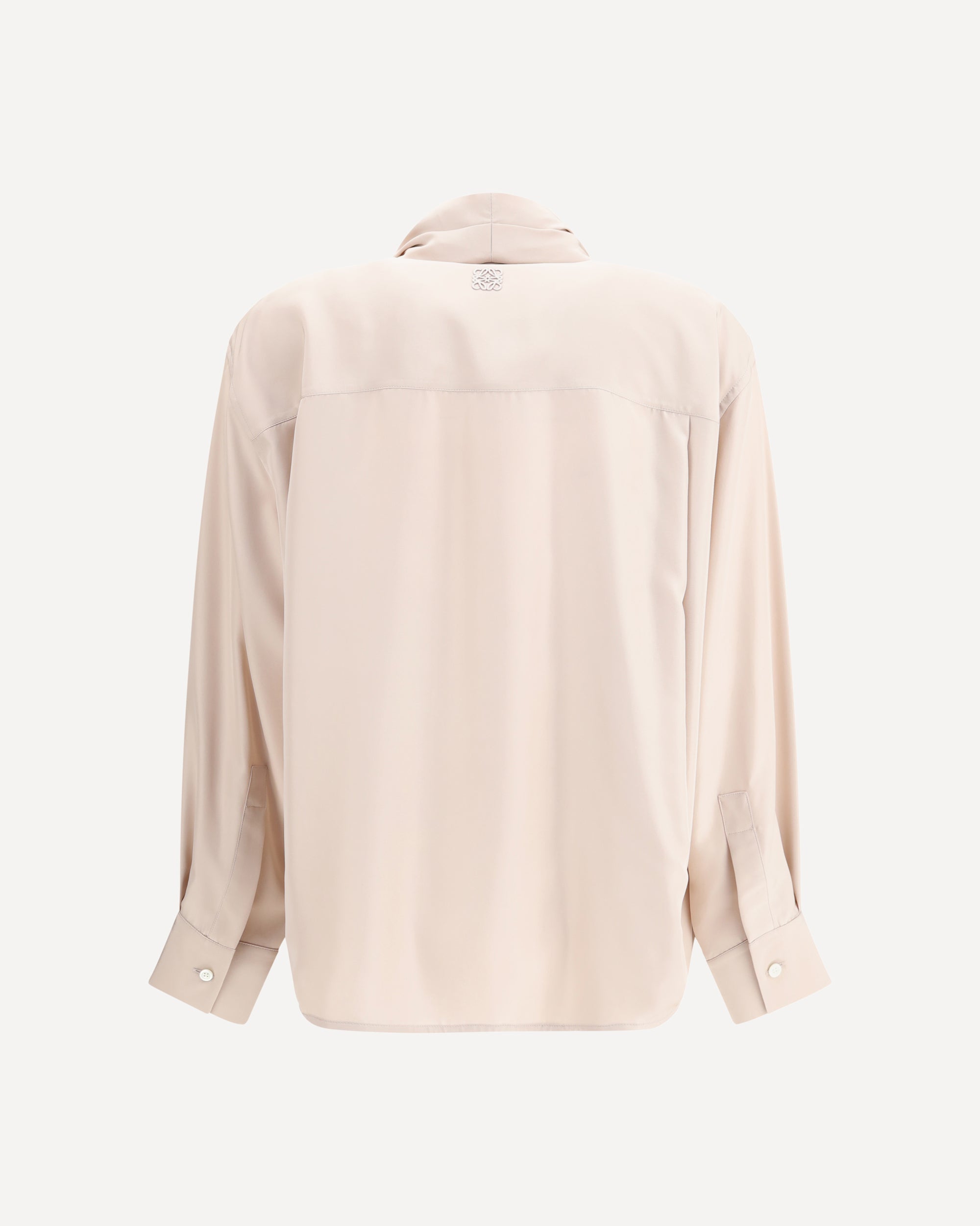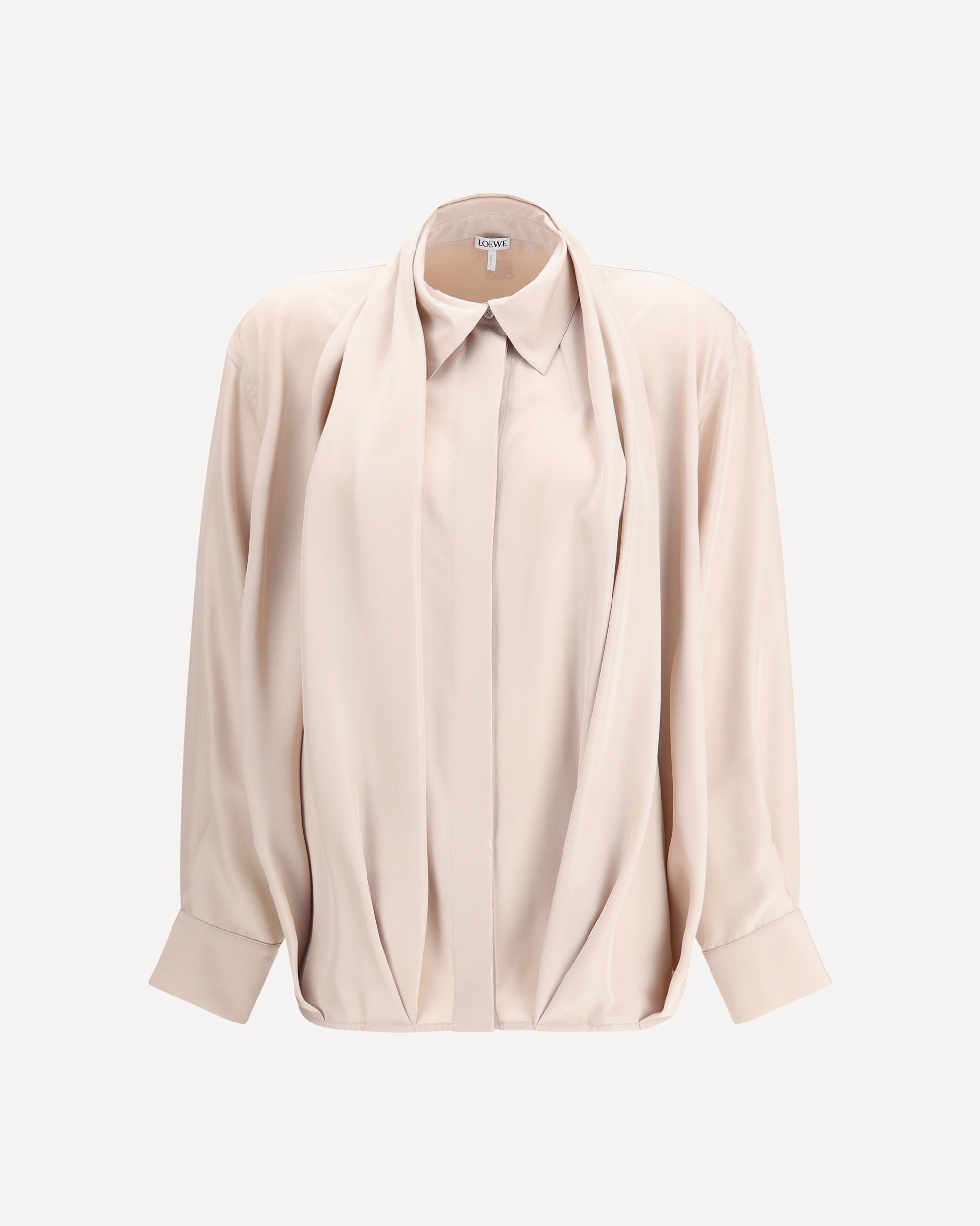 La Camicia drappeggiata di Loewe è realizzata in leggero popeline di seta opaco, un tessuto fluido e raffinato che conferisce al capo un’eleganza naturale. La silhouette a palloncino e il drappeggio sul davanti donano movimento e morbidezza alla linea, mentre il colletto classico e la chiusura con bottoni nascosti mantengono un aspetto pulito e contemporaneo. I polsini abbottonati aggiungono una nota sartoriale, completata dal ricamo Anagram applicato sul retro, dettaglio iconico che esalta l’artigianalità distintiva della Maison. Con la sua vestibilità rilassata e la lunghezza standard, è una camicia versatile e sofisticata, perfetta per look eleganti dal carattere moderno.