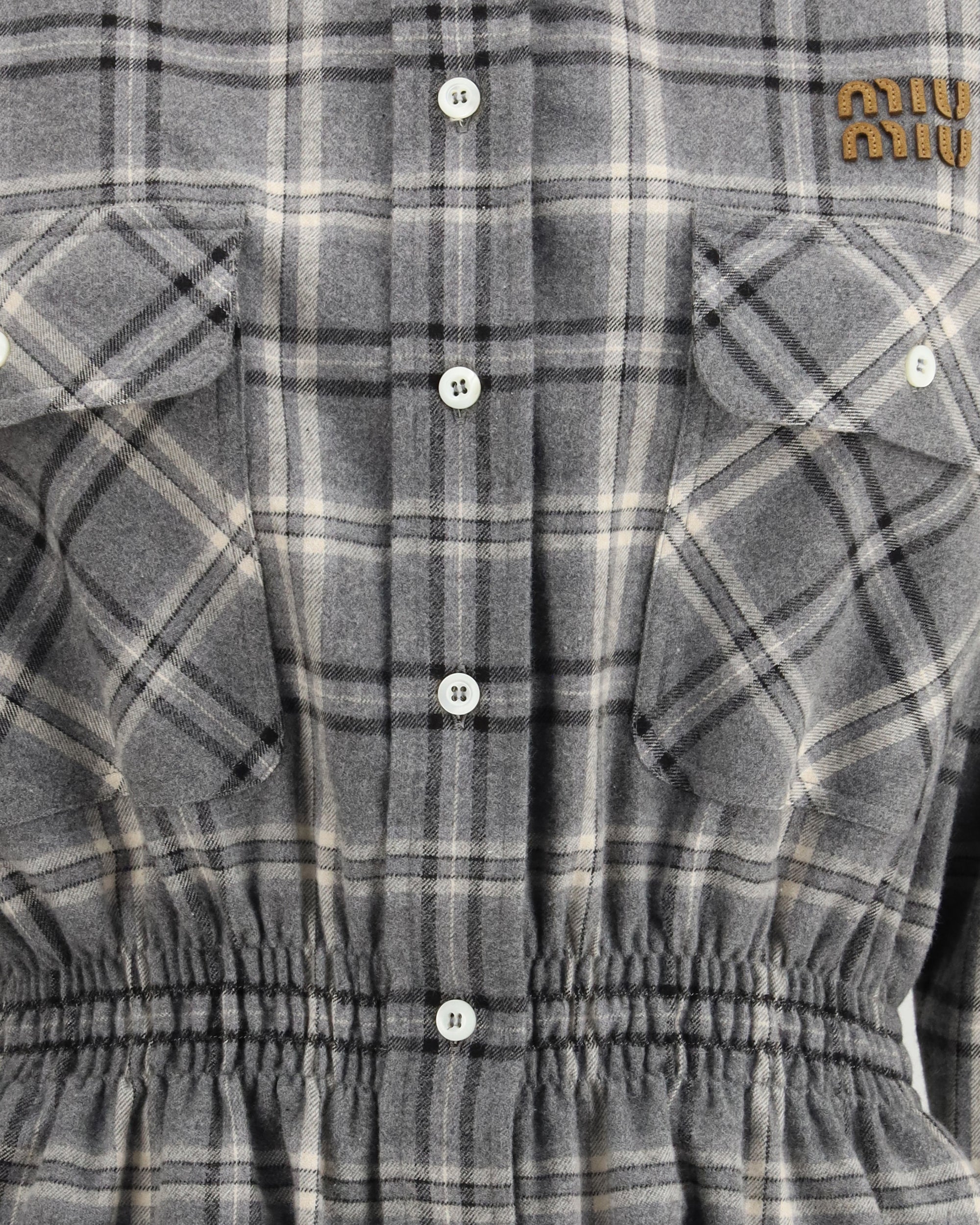 Il mini Abito in flanella di Miu Miu nasce dall’immaginario della camiceria maschile, trasformato in una silhouette femminile e definita che gioca con contrasti e richiami rétro. La vita leggermente aderente si unisce al colletto in velluto e ai polsini camicia, creando un equilibrio tra rigore sartoriale e delicatezza moderna. Le tasche inserite e quelle applicate aggiungono praticità, mentre il logo ricamato in pelle firma il capo con l’inconfondibile allure vintage del brand.