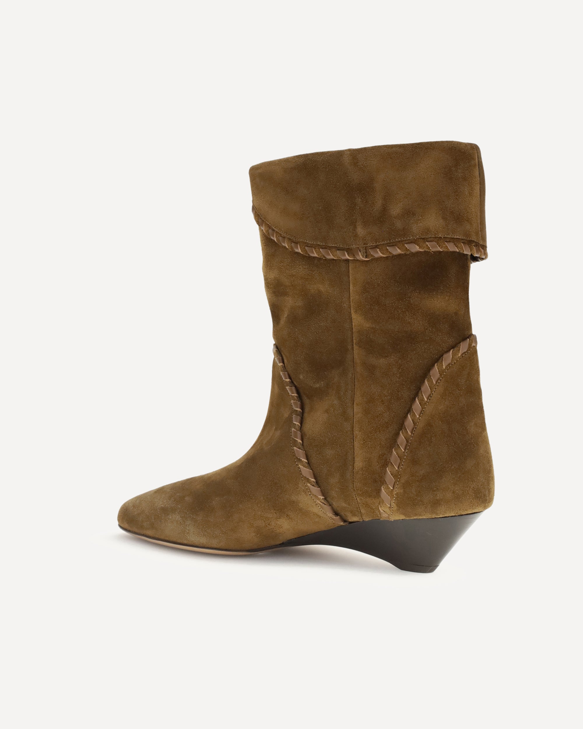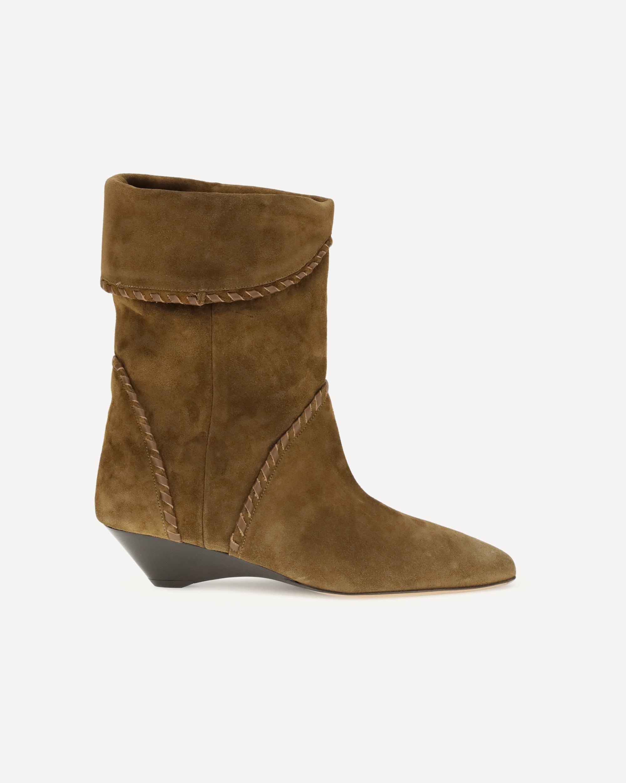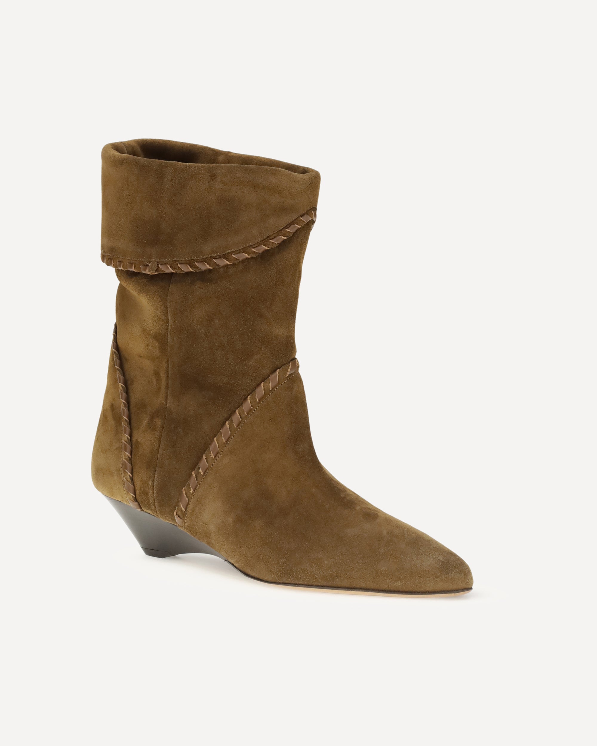 Gli Stivali Edoa di Isabel Marant uniscono comfort e stile con una lavorazione sofisticata. Realizzati in morbido scamosciato, presentano una tomaia con risvolto che dona un tocco rilassato, arricchita da finiture in pelle liscia intrecciata. Il modello a punta si completa con un tacco platform in pelle laminata, mentre suola e soletta in pelle assicurano durata e comfort. Un capo iconico per un look contemporaneo e raffinato.