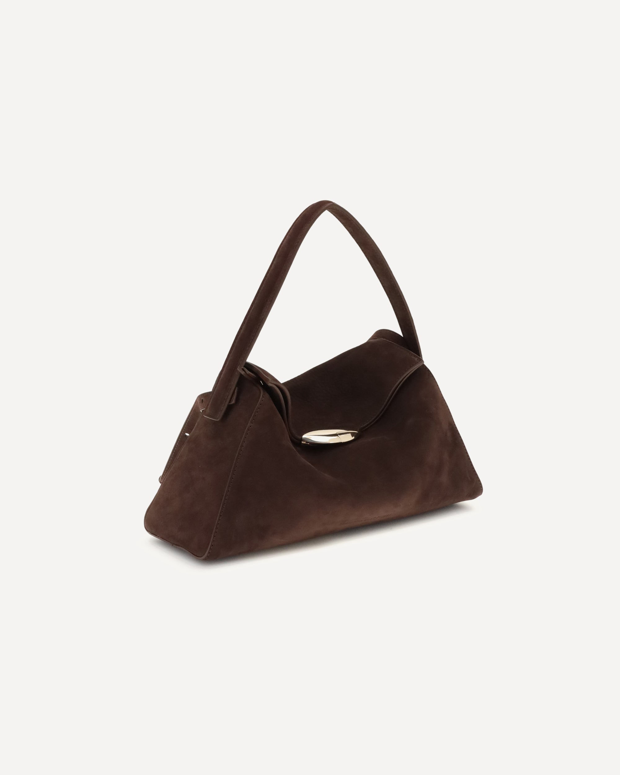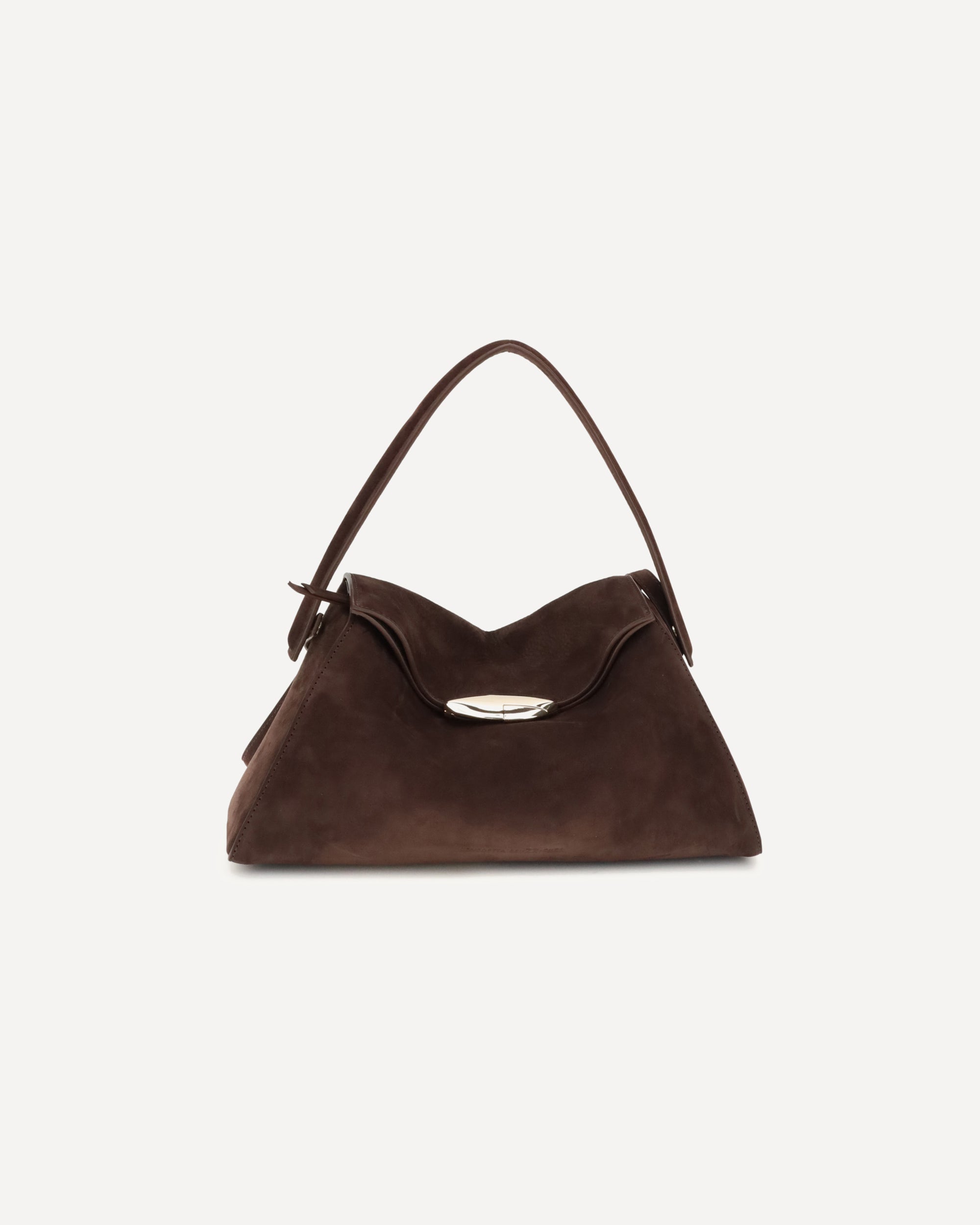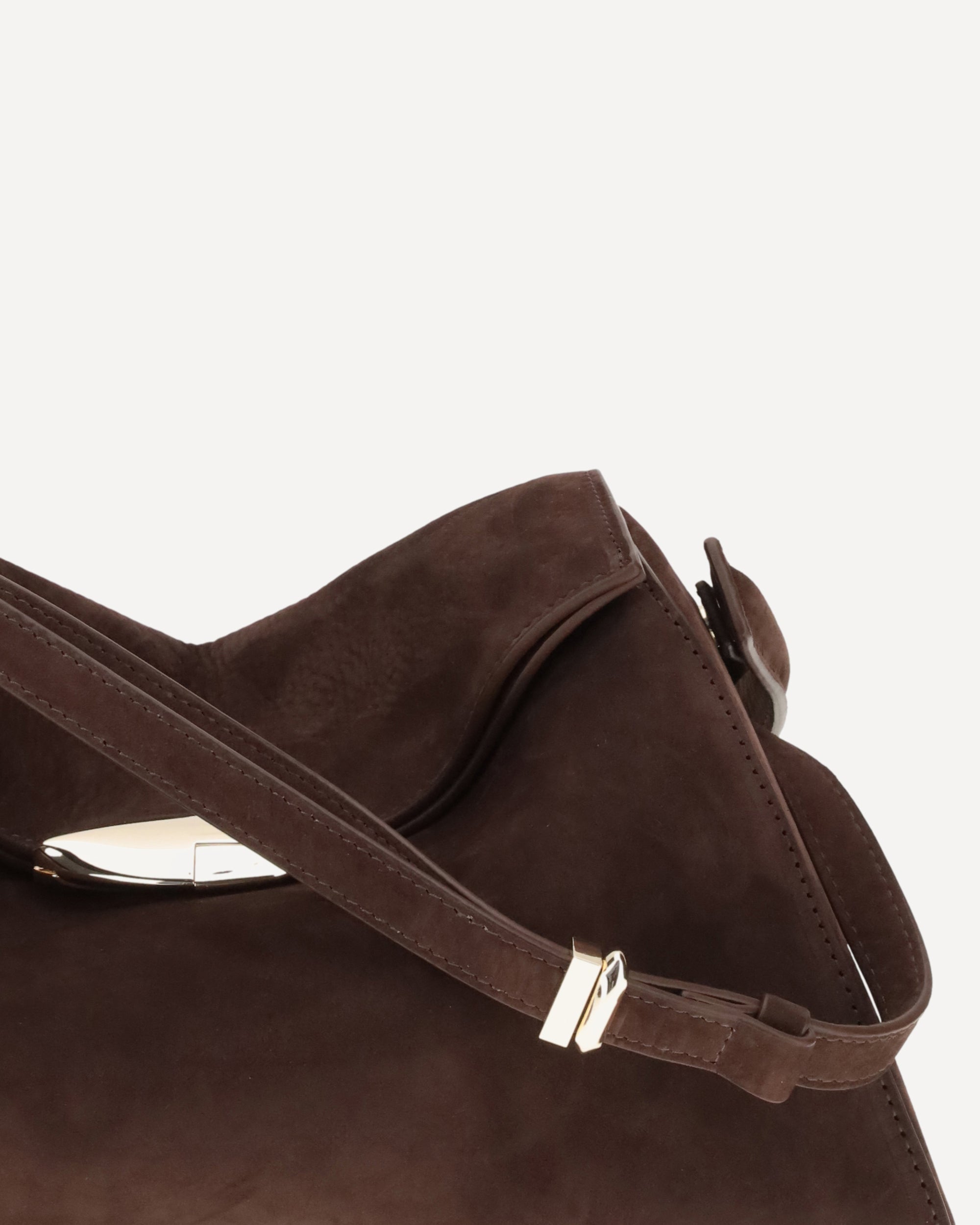 La Borsa a Spalla Elif di Benedetta Bruzziches unisce eleganza e carattere in una silhouette essenziale ma d’impatto. Realizzata in scamosciato di vitello con accessori in Zama, è dotata di tracolla regolabile e manico singolo, per una versatilità che accompagna ogni momento della giornata con stile e personalità.