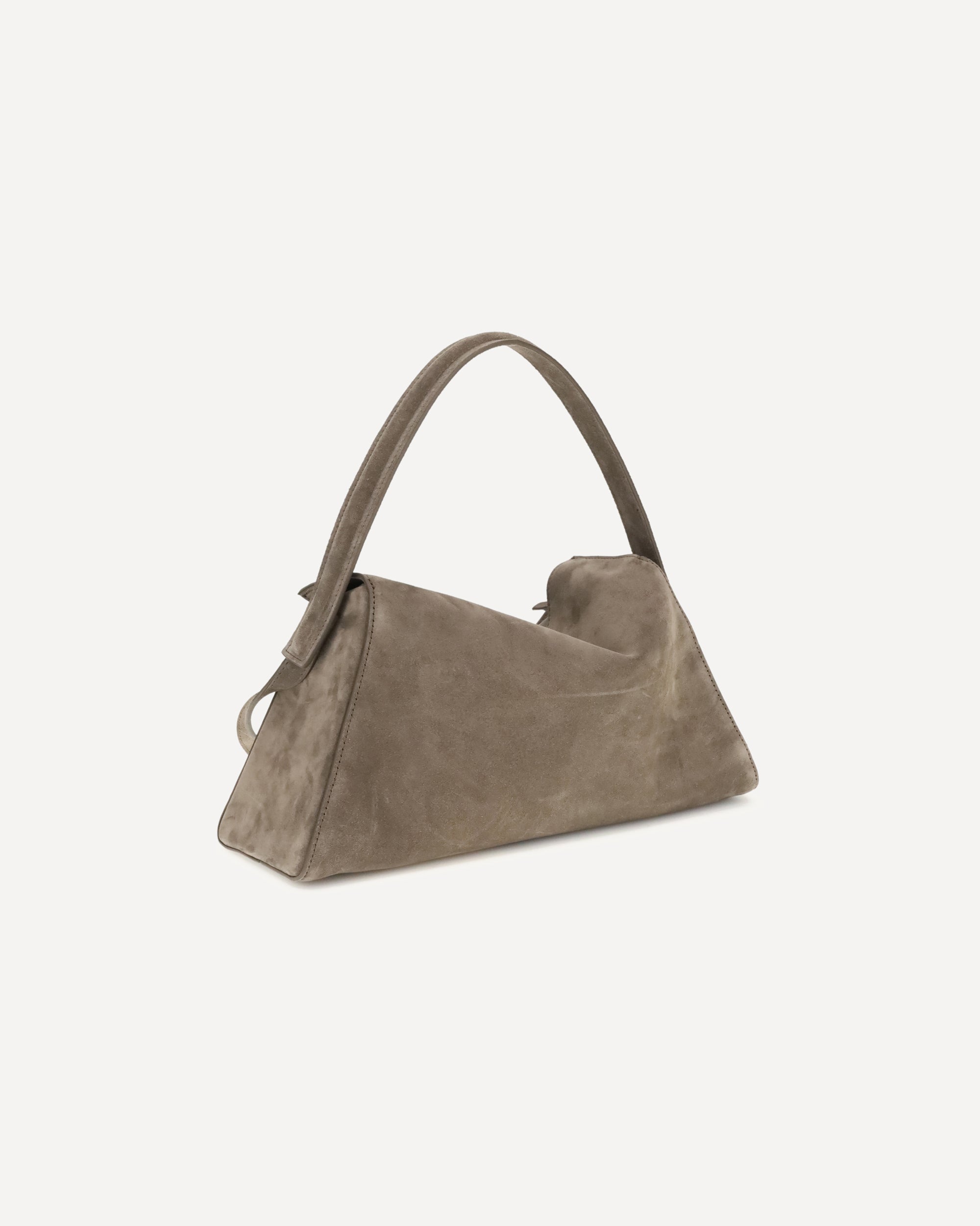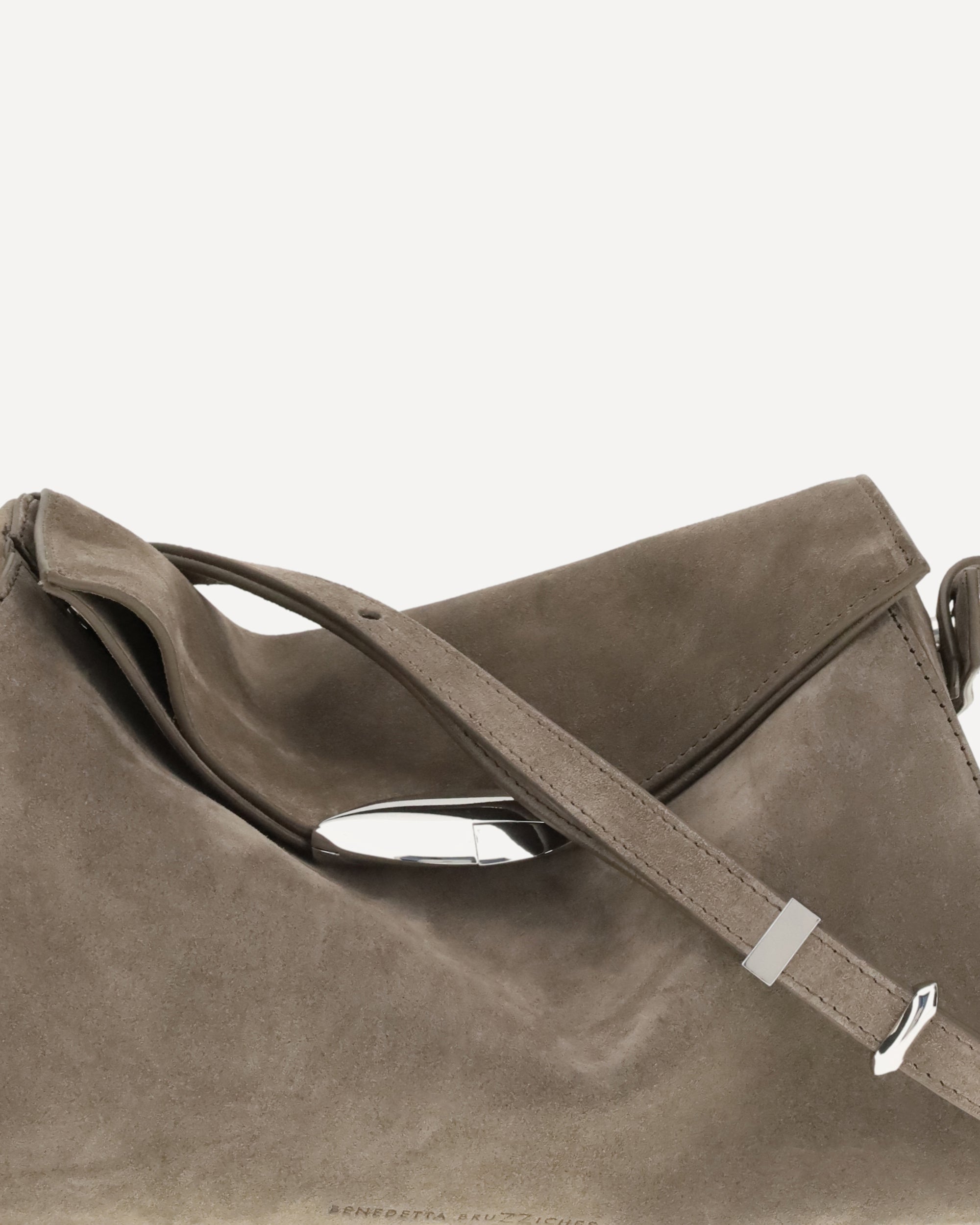 La Borsa a Spalla Elif di Benedetta Bruzziches unisce eleganza e carattere in una silhouette essenziale ma d’impatto. Realizzata in scamosciato di vitello con accessori in Zama, è dotata di tracolla regolabile e manico singolo, per una versatilità che accompagna ogni momento della giornata con stile e personalità.