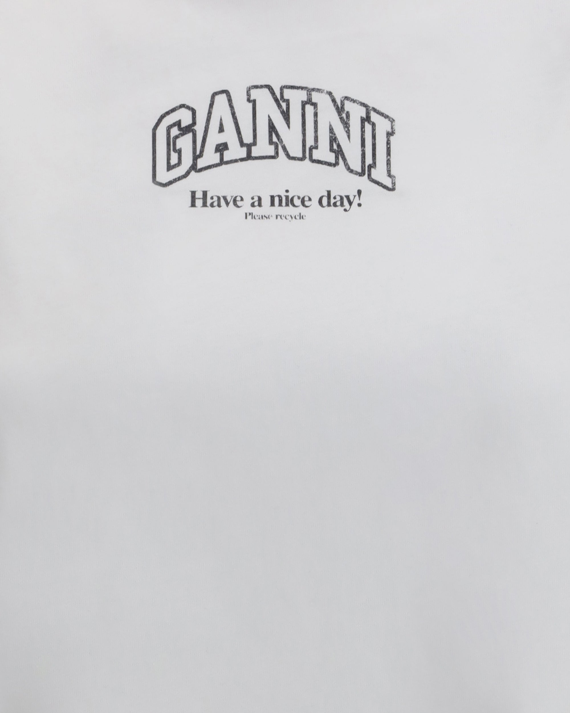 La T-shirt girocollo di Ganni presenta un design minimal caratterizzato da uno scollo rotondo, maniche corte e dall’iconico logo GANNI applicato sul fronte. Realizzata in cotone leggero, offre una silhouette essenziale e versatile, ideale per completare look quotidiani con un tocco contemporaneo.