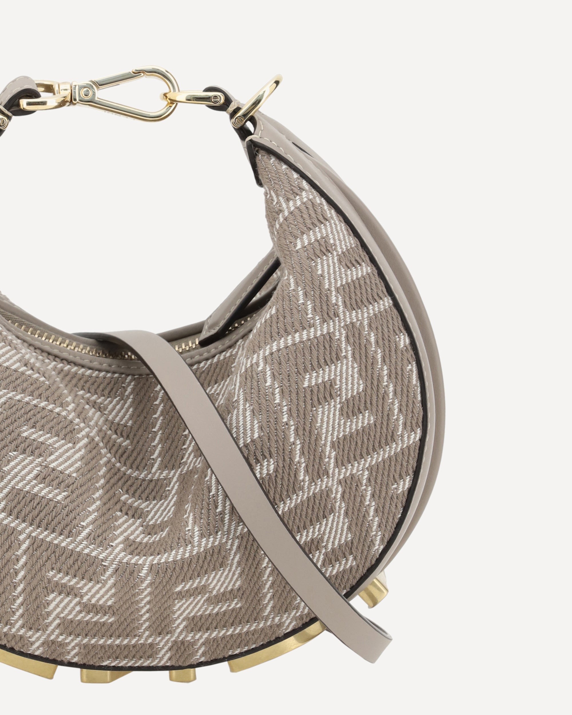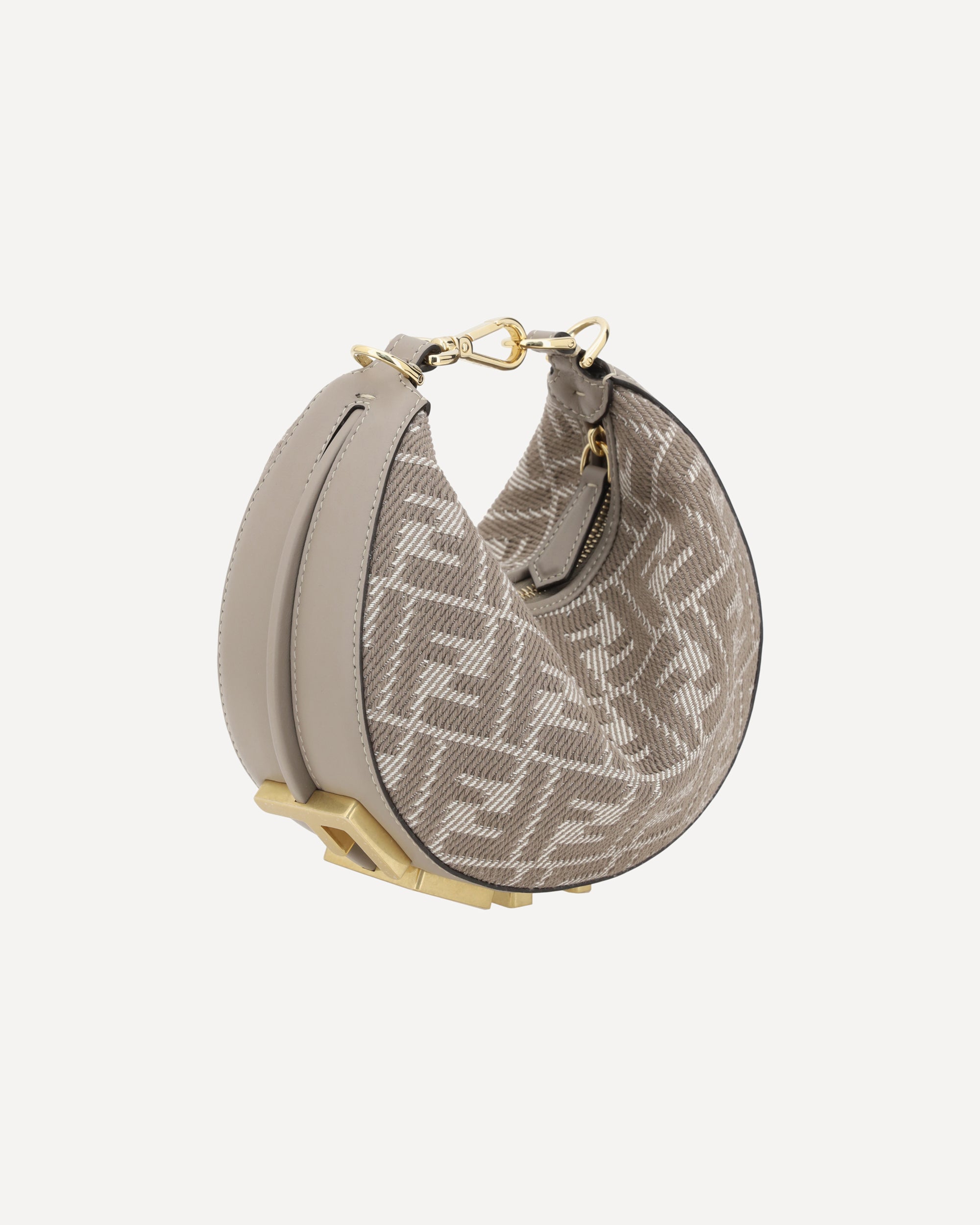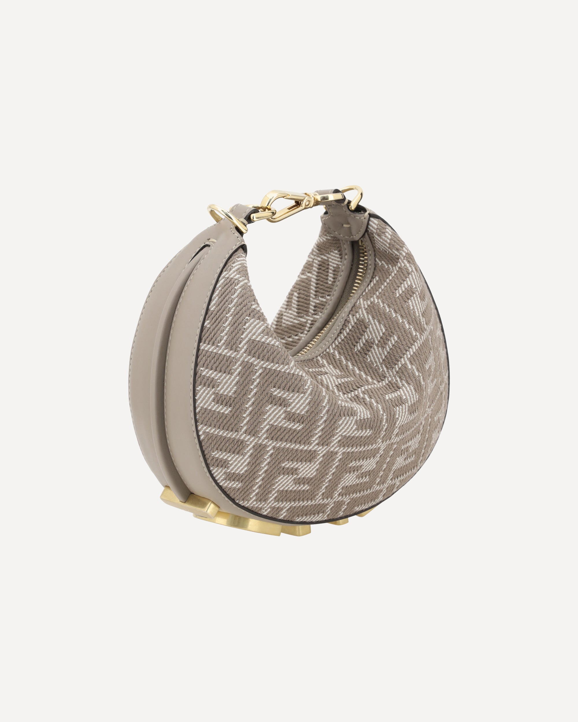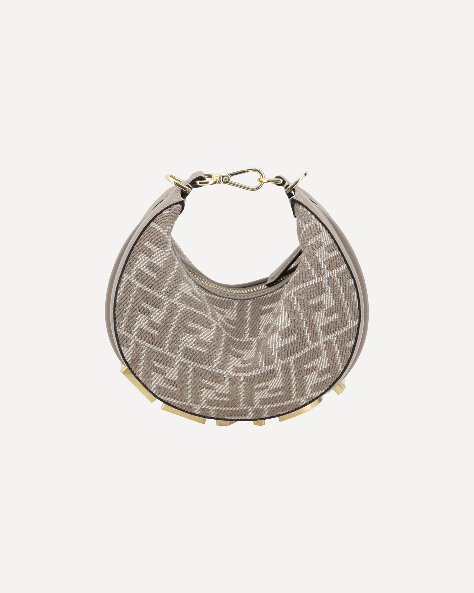 La Borsa a Mano Fendigraphy Mini è un modello moderno e audace, realizzato in jacquard FF effetto denim per un look contemporaneo. Decorata con il lettering FENDI in metallo oro vintage sul fondo, questa scritta diventa visibile quando si indossa la borsa, aggiungendo un tocco distintivo. La chiusura superiore con zip garantisce praticità e sicurezza, mentre l'interno offre un unico scomparto per organizzare gli oggetti essenziali. La borsa può essere indossata a mano, chiudendola con il moschettone, oppure a spalla o cross-body grazie alla tracolla regolabile e removibile in pelle, che può essere fissata ai ganci laterali.